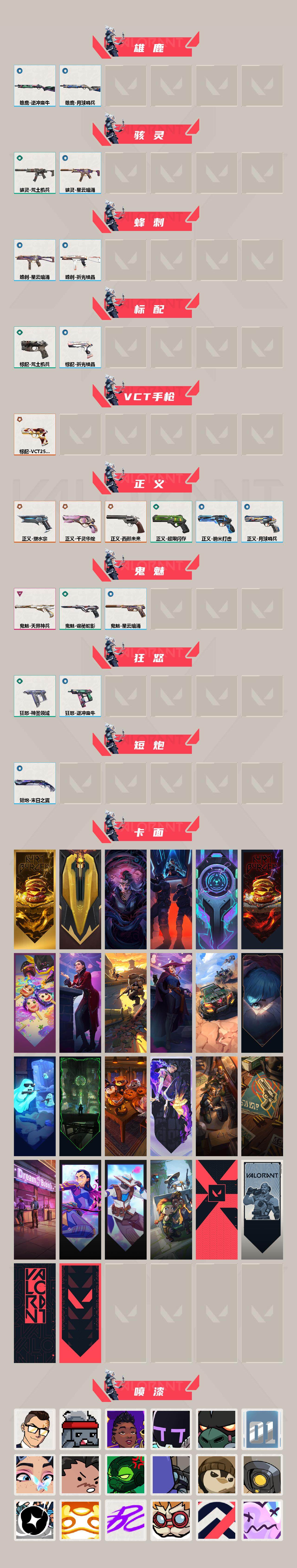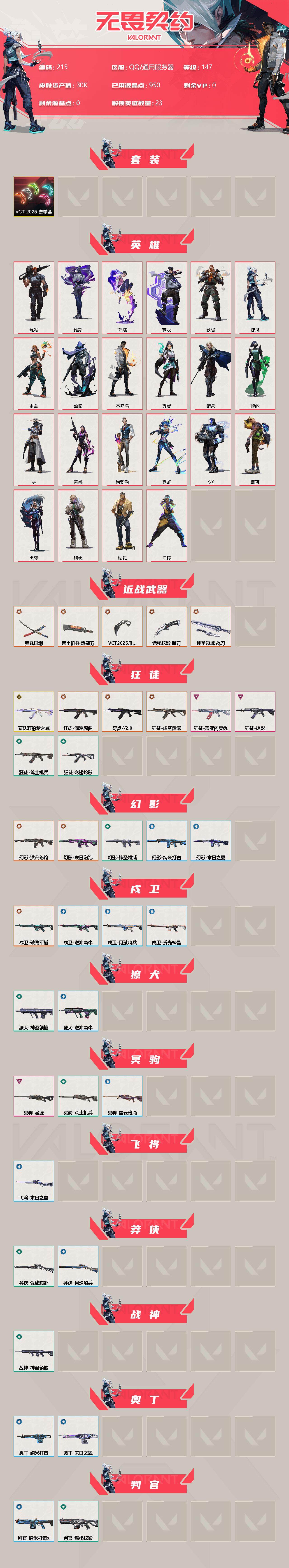 【215】【套装】:vct 2025 赛季套装 【英雄】:幻棱,炼狱,维斯,暮蝶,钛狐,壹决,铁臂,捷风,雷兹,幽影,不死鸟,贤者,猎枭,蝰蛇,零,芮娜,尚勃勒,霓虹,k/o,盖可,黑梦,钢锁 【近战 武器】:近战武器-vct 2025 爪刀,近战武器-鬼丸国纲,近战武器-荒土机兵 热能刀,近战武器-诡秘蛇影 军刀,近战武器-神圣领域 战刀 【狂徒】:狂徒-艾沃莉的梦之翼,狂徒-混沌序曲,狂徒-奇点//2.0,狂徒-虚空遗器,狂徒-掠影,狂徒-盖亚的复仇,狂徒-荒土机兵,狂徒-诡秘蛇影 【幻影】:幻影-洪荒怒焰,幻影-末日泡泡,幻影-神圣领域,幻影-纳米打击,幻影-末日之翼 【戍卫】:戍卫-破败军械,戍卫-逆冲蛮牛,戍卫-月球哨兵,戍卫-折光棱晶 【獠犬】:獠犬-神圣领域,獠犬-逆冲蛮牛 【冥驹】:冥驹-起源,冥驹-荒土机兵,冥驹-星云暗涌 【飞将】:飞将-末日之翼 【莽侠】:莽侠-诡秘蛇影,莽侠-月球哨兵 【战神】:战神-神圣领域 【奥丁】:奥丁-纳米打击,奥丁-末日之翼 【判官】:判官-诡秘蛇影,判官-纳米打击x 【雄鹿】:雄鹿-逆冲蛮牛,雄鹿-月球哨兵 【骇灵】:骇灵-荒土机兵,骇灵-星云暗涌 【蜂刺】:蜂刺-星云暗涌,蜂刺-折光棱晶 【标配】:标配-荒土机兵,标配-折光棱晶 【vct手呛】:标配-vct25 x edg 【正义】:正义-千灵华绽,正义-塑水宗,正义-西部未来,正义-超限闪存,正义-纳米打击,正义-月球哨兵 【鬼魅】:鬼魅-天界神兵,鬼魅-诡秘蛇影,鬼魅-星云暗涌 【狂怒】:狂怒-神圣领域,狂怒-逆冲蛮牛 【短炮】:短炮-末日之翼 【卡面】:终章:激斗汉堡 卡面,进入射程 卡面,分崩离析 卡面,纳米打击 卡面,抑制技术 卡面,激斗汉堡 卡面,瓦娃脸雪糕 p2 卡面,从黄昏到黎明 卡面,荒土机兵 卡面,银弹猎手 卡面,逆冲蛮牛 卡面,《双城之战》拥抱 卡面,精灵大战 卡面,欢迎来到底城 卡面,南瓜盛典 卡面,无畏契约:暮蝶 卡面,修车达人 卡面,正义的化身 卡面,梦幻奶茶 卡面,无畏契约go!第一卷:芮娜 卡面,无畏契约go!第一卷:零 卡面,别冒尖 卡面,代号红色 卡面,新兵报到 卡面,v契约 卡面,无畏契约 卡面 【喷漆】:小小心意 喷漆,战“素”兔 喷漆,宇宙的指引 喷漆,请求重启 喷漆,逆冲蛮牛 喷漆,纳米打击 喷漆,鼻尖上的蝴蝶 喷漆,简笔画黯兽 喷漆,独守蝰腹 喷漆,他们将落荒而逃 喷漆,通缉:战术企鹅 喷漆,荒土机兵 喷漆,别挡我吃球! 喷漆,嗨宝南瓜灯 喷漆,嘭! 喷漆,都算到了 喷漆,控场勿近 喷漆,伤心心 喷漆,小丑猫 喷漆,熊抱 喷漆,捷风差距 喷漆,买装还是存钱 喷漆,暴走萝莉 喷漆,飓刃涂鸦 喷漆 ,胜利属于无畏契约 喷漆,glhf 喷漆,无畏契约 喷漆 【挂饰】:终章:猫猫木乃伊 挂饰,荒土机兵 挂饰,悠闲鸡块 挂饰,猫猫木乃伊 挂饰,水壶 挂饰,纳米打击 挂饰,逆冲蛮牛 挂饰,可爱糖糖 挂饰,伞绳 挂饰,《双城之战》小蛋糕 挂饰,第九季//第三幕 纪念币 挂饰,工具腰带 挂饰,无畏契约go!第一卷 芮娜 挂饰,无畏契约go!第一卷 零 挂饰,熔岩灯 挂饰,第九季//第二幕 纪念币 挂饰,袖珍捷风 挂饰,z世代特饮 挂饰,动力机箱 挂饰,vct x edg 挂饰,天外飞客 挂饰,无畏契约 纪念币 挂饰