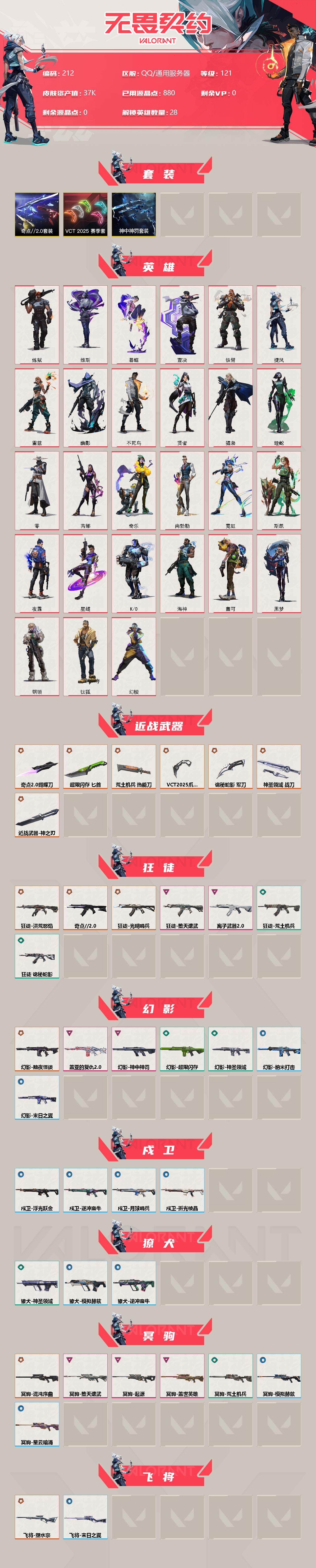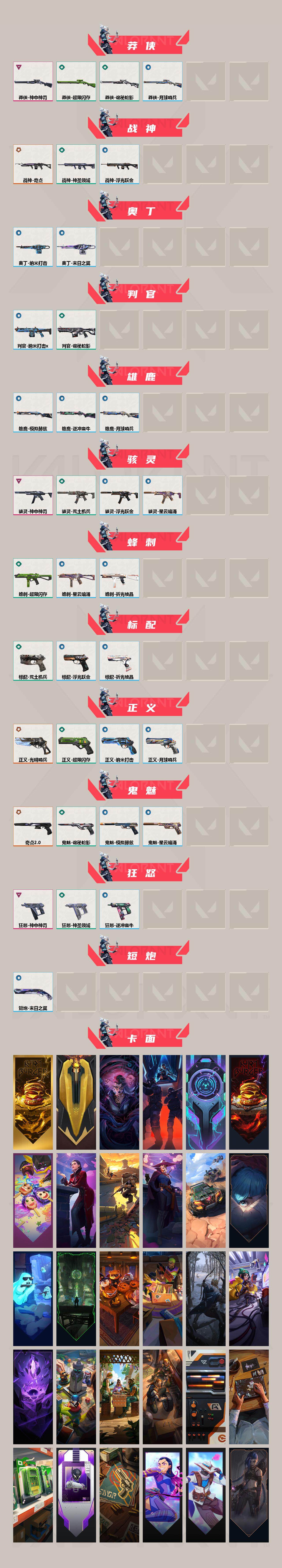 【212】【套装】:vct 2025 赛季套装,奇点//2.0套装,神中神罚套装 【英雄】:幻棱,炼狱,维斯,暮蝶,钛狐,壹决,铁臂,捷风,雷兹,幽影,不死鸟,贤者,猎枭,蝰蛇,零,芮娜,奇乐,尚勃勒,霓虹,斯凯,夜露,星礈,k/o,海神,盖可,黑梦,钢锁 【近战 武器】:近战武器-神之刃,近战武器-奇点//2.0 蝴蝶刀,近战武器-vct 2025 爪刀,近战武器-超限闪存 匕首,近战武器-荒土机兵 热能刀,近战武器-诡秘蛇影 军刀,近战武器-神圣领域 战刀 【狂徒】:狂徒-光明哨兵,狂徒-洪荒怒焰,狂徒-奇点//2.0,狂徒-堕天遗武,狂徒-离子武器//2.0,狂徒-荒土机兵,狂徒-诡秘蛇影 【幻影】:幻影-黯夜怪谈,幻影-盖亚的复仇//2.0,幻影-神中神罚,幻影-超限闪存,幻影-神圣领域,幻影-纳米打击,幻影-末日之翼 【戍卫】:戍卫-浮光跃金,戍卫-逆冲蛮牛,戍卫-月球哨兵,戍卫-折光棱晶 【獠犬】:獠犬-神圣领域,獠犬-模拟赫兹,獠犬-逆冲蛮牛 【冥驹】:冥驹-混沌序曲,冥驹-堕天遗武,冥驹-盖世英雄,冥驹-起源,冥驹-荒土机兵,冥驹-模拟赫兹,冥驹-星云暗涌 【飞将】:飞将-塑水宗,飞将-末日之翼 【莽侠】:莽侠-神中神罚,莽侠-超限闪存,莽侠-诡秘蛇影,莽侠-月球哨兵 【战神】:战神-奇点,战神-神圣领域,战神-浮光跃金 【奥丁】:奥丁-纳米打击,奥丁-末日之翼 【判官】:判官-诡秘蛇影,判官-纳米打击x 【雄鹿】:雄鹿-模拟赫兹,雄鹿-逆冲蛮牛,雄鹿-月球哨兵 【骇灵】:骇灵-神中神罚,骇灵-荒土机兵,骇灵-浮光跃金,骇灵-星云暗涌 【蜂刺】:蜂刺-超限闪存,蜂刺-星云暗涌,蜂刺-折光棱晶 【标配】:标配-荒土机兵,标配-浮光跃金,标配-折光棱晶 【正义】:正义-光明哨兵,正义-超限闪存,正义-纳米打击,正义-月球哨兵 【鬼魅】:鬼魅-奇点//2.0,鬼魅-诡秘蛇影,鬼魅-模拟赫兹,鬼魅-星云暗涌 【狂怒】:狂怒-神中神罚,狂怒-神圣领域,狂怒-逆冲蛮牛 【短炮】:短炮-末日之翼 【卡面】:终章:激斗汉堡 卡面,进入射程 卡面,分崩离析 卡面,纳米打击 卡面,抑制技术 卡面,激斗汉堡 卡面,瓦娃脸雪糕 p2 卡面,从黄昏到黎明 卡面,荒土机兵 卡面,银弹猎手 卡面,逆冲蛮牛 卡面,《双城之战》拥抱 卡面,精灵大战 卡面,欢迎来到底城 卡面,南瓜盛典 卡面,唱片的故事 卡面,钢弓与箭弦 卡面,排除故障 卡面,奇点//2.0 卡面,战术桌游 卡面,悠享食光 卡面,修车达人 卡面,模拟赫兹 卡面,浮光跃金 卡面,超限闪存 卡面,维斯工牌 卡面,正义的化身 卡面,无畏契约go!第一卷:芮娜 卡面,无畏契约go!第一卷:零 卡面,《双城之战》金克丝 卡面,代号红色 卡面,新兵报到 卡面,v契约 卡面,无畏契约 卡面 【喷漆】:小小心意 喷漆,战“素”兔 喷漆,宇宙的指引 喷漆,请求重启 喷漆,逆冲蛮牛 喷漆,纳米打击 喷漆,鼻尖上的蝴蝶 喷漆,简笔画黯兽 喷漆,独守蝰腹 喷漆,他们将落荒而逃 喷漆,通缉:战术企鹅 喷漆,荒土机兵 喷漆,别挡我吃球! 喷漆,嗨宝南瓜灯 喷漆,嘭! 喷漆,都算到了 喷漆,控场勿近 喷漆,皮蛋呼呼 喷漆,像素星礈 喷漆,图谋不轨的零 喷漆,小丑猫 喷漆,模拟赫兹 喷漆,高丽风情小熊 喷漆,奇点//2.0 喷漆,蹲到一个 喷漆,全力集中 喷漆,超限闪存 喷漆,rua一下 喷漆,熊抱 喷漆,高丽风情小虎 喷漆,记在小本本 喷漆,防弹企鹅 喷漆,高丽风情小蛙 喷漆,买装还是存钱 喷漆,暴走萝莉 喷漆,胜利属于无畏契约 喷漆,glhf 喷漆,无畏契约 喷漆 【挂饰】:终章:猫猫木乃伊 挂饰,荒土机兵 挂饰,悠闲鸡块 挂饰,猫猫木乃伊 挂饰,水壶 挂饰,纳米打击 挂饰,逆冲蛮牛 挂饰,可爱糖糖 挂饰,伞绳 挂饰,《双城之战》小蛋糕 挂饰,第九季//第三幕 纪念币 挂饰,拳击战术熊 挂饰,工具腰带 挂饰,无畏契约go!第一卷 芮娜 挂饰,无畏契约go!第一卷 零 挂饰,暗藏猫腻 挂饰,高丽风情 挂饰,奇点//2.0 挂饰,熔岩灯 挂饰,超限闪存 挂饰,迷你k/o 挂饰,模拟赫兹 挂饰,第九季//第二幕 纪念币 挂饰,天外飞客 挂饰,无畏契约 纪念币 挂饰