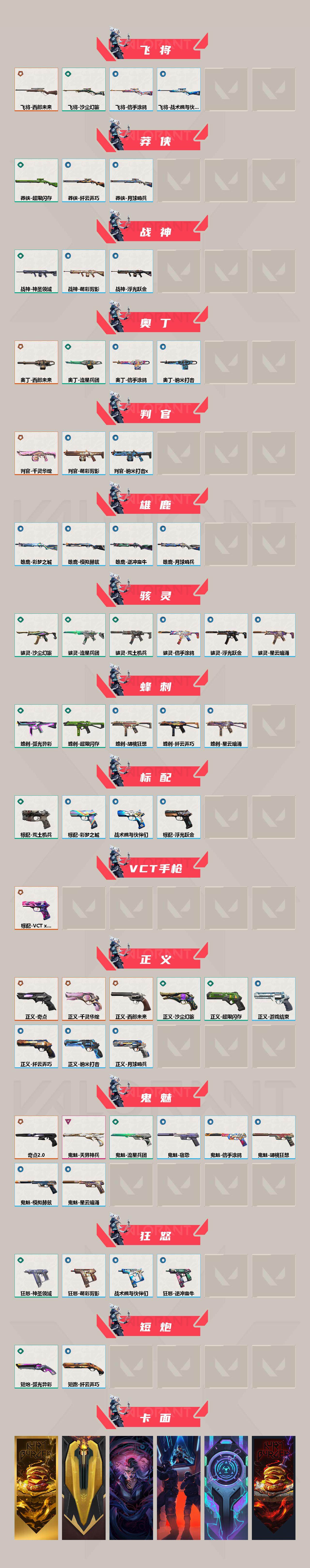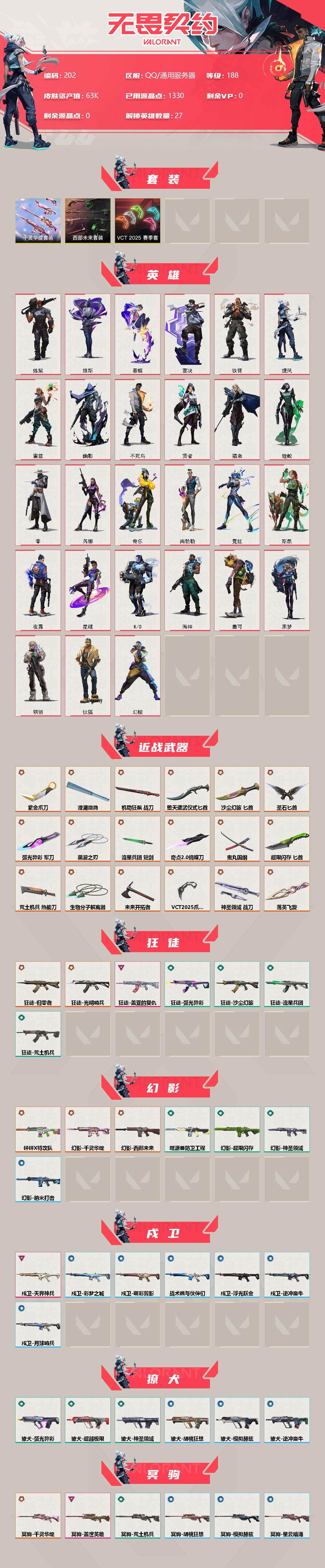 【202】【套装】:vct 2025 赛季套装,西部未来套装,千灵华绽套装 【英雄】:幻棱,炼狱,维斯,暮蝶,钛狐,壹决,铁臂,捷风,雷兹,幽影,不死鸟,贤者,猎枭,蝰蛇,零,芮娜,奇乐,尚勃勒,霓虹,斯凯,夜露,星礈,k/o,海神,盖可,黑梦,钢锁 【近战 武器】:近战武器-奇点//2.0 蝴蝶刀,近战武器-vct 2025 爪刀,近战武器-紫金爪刀,近战武器-黑波之刃,近战武器-落英飞旋,近战武器-澄湖潋滟,近战武器-鬼丸国纲,近战武器-未来开拓者,近战武器-流星兵团 短剑,近战武器-超限闪存 匕首,近战武器-堕天遗武 仪式匕首,近战武器-弧光异彩 军刀,近战武器-荒土机兵 热能刀,近战武器-机动狂飙 战刀,近战武器-沙尘幻旅 匕首,近战武器-生物分子解离器,近战武器-圣石匕首,近战武器-神圣领域 战刀 【狂徒】:狂徒-光明哨兵,狂徒-归零者,狂徒-盖亚的复仇,狂徒-弧光异彩,狂徒-荒土机兵,狂徒-流星兵团,狂徒-沙尘幻旅 【幻影】:幻影-砰砰x特攻队,幻影-千灵华绽,幻影-西部未来,幻影-超限闪存,幻影-噬源兽防卫工程,幻影-神圣领域,幻影-纳米打击,幻影-西部未来 【戍卫】:戍卫-天界神兵,戍卫-彩梦之城,戍卫-浮光跃金,戍卫-萌彩剪影,戍卫-逆冲蛮牛,戍卫-战术熊与伙伴们,戍卫-月球哨兵 【獠犬】:獠犬-弧光异彩,獠犬-神圣领域,獠犬-胡桃狂想,獠犬-模拟赫兹,獠犬-逆冲蛮牛 【冥驹】:冥驹-千灵华绽,冥驹-盖世英雄,冥驹-荒土机兵,冥驹-胡桃狂想,冥驹-模拟赫兹,冥驹-星云暗涌 【飞将】:飞将-西部未来,飞将-沙尘幻旅,飞将-信手涂鸦,飞将-战术熊与伙伴们 【莽侠】:莽侠-超限闪存,莽侠-纤云弄巧,莽侠-月球哨兵 【战神】:战神-神圣领域,战神-浮光跃金,战神-萌彩剪影 【奥丁】:奥丁-西部未来,奥丁-流星兵团,奥丁-纳米打击,奥丁-信手涂鸦 【判官】:判官-千灵华绽,判官-萌彩剪影,判官-纳米打击x 【雄鹿】:雄鹿-彩梦之城,雄鹿-模拟赫兹,雄鹿-逆冲蛮牛,雄鹿-月球哨兵 【骇灵】:骇灵-荒土机兵,骇灵-流星兵团,骇灵-沙尘幻旅,骇灵-浮光跃金,骇灵-信手涂鸦,骇灵-星云暗涌 【蜂刺】:蜂刺-超限闪存,蜂刺-弧光异彩,蜂刺-胡桃狂想,蜂刺-纤云弄巧,蜂刺-星云暗涌 【标配】:标配-荒土机兵,标配-彩梦之城,标配-浮光跃金,标配-战术熊与伙伴们 【vct手呛】:标配-vct x prx 【正义】:正义-奇点,正义-千灵华绽,正义-西部未来,正义-超限闪存,正义-沙尘幻旅,正义-纳米打击,正义-纤云弄巧,正义-游戏结束,正义-月球哨兵 【鬼魅】:鬼魅-奇点//2.0,鬼魅-天界神兵,鬼魅-流星兵团,鬼魅-胡桃狂想,鬼魅-模拟赫兹,鬼魅-宿怨,鬼魅-信手涂鸦,鬼魅-星云暗涌 【狂怒】:狂怒-神圣领域,狂怒-萌彩剪影,狂怒-逆冲蛮牛,狂怒-战术熊与伙伴们 【短炮】:短炮-弧光异彩,短炮-纤云弄巧 【卡面】:终章:激斗汉堡 卡面,进入射程 卡面,分崩离析 卡面,纳米打击 卡面,抑制技术 卡面,激斗汉堡 卡面,瓦娃脸雪糕 p2 卡面,从黄昏到黎明 卡面,荒土机兵 卡面,银弹猎手 卡面,逆冲蛮牛 卡面,《双城之战》拥抱 卡面,精灵大战 卡面,欢迎来到底城 卡面,南瓜盛典 卡面,唱片的故事 卡面,钢弓与箭弦 卡面,无畏契约:暮蝶 卡面,排除故障 卡面,战术桌游 卡面,悠享食光 卡面,修车达人 卡面,模拟赫兹 卡面,浮光跃金 卡面,超限闪存 卡面,维斯工牌 卡面,正义的化身 卡面,时间到 卡面,最高舞台 卡面,声感陷阱设计图 卡面,梦幻奶茶 卡面,终章:打造专属狂徒 卡面,趁热吃 卡面,西装暴徒 卡面,失控边缘 卡面,哨卫者之领域 卡面,无畏契约:尚勃勒 卡面,暮蝶工牌 卡面,战术熊与伙伴们 卡面,源能反应 卡面,流星兵团 卡面,纤云弄巧 卡面,暂别喧嚣 卡面,打造专属狂徒 卡面,零点嗅探设计图 卡面,沙雕爆能器 卡面,无畏契约go!第一卷:芮娜 卡面,清除名单 卡面,无畏契约go!第一卷:零 卡面,龍记 卡面,化茧成蝶 卡面,完美调谐 卡面 ,暗呛 卡面,终章:黑影先生的咖啡! 卡面,铁臂vs雷兹 卡面,纪念照 p2 卡面,一击全倒 卡面,黑影先生的咖啡! 卡面,天台狂欢 卡面,胡桃狂想 卡面,沙尘幻旅 卡面,壹决工牌 卡面,萌彩剪影 卡面,势不可挡//k/o 卡面,夯实根基 卡面,"luie" 卡面,热烈欢迎 卡面,铁臂设计图 卡面,代号红色 卡面,冰淇淋店 卡面,新兵报到 卡面,友军火力 卡面,v契约 卡面,无畏契约 卡面 【喷漆】:小小心意 喷漆,战“素”兔 喷漆,宇宙的指引 喷漆,请求重启 喷漆,逆冲蛮牛 喷漆,纳米打击 喷漆,鼻尖上的蝴蝶 喷漆,简笔画黯兽 喷漆,独守蝰腹 喷漆,他们将落荒而逃 喷漆,通缉:战术企鹅 喷漆,荒土机兵 喷漆,别挡我吃球! 喷漆,嗨宝南瓜灯 喷漆,嘭! 喷漆,都算到了 喷漆,控场勿近 喷漆,皮蛋呼呼 喷漆,像素星礈 喷漆,图谋不轨的零 喷漆,伤心心 喷漆,小丑猫 喷漆,模拟赫兹 喷漆,高丽风情小熊 喷漆,蹲到一个 喷漆,全力集中 喷漆,超限闪存 喷漆,rua一下 喷漆,熊抱 喷漆,高丽风情小虎 喷漆,记在小本本 喷漆,防弹企鹅 喷漆,高丽风情小蛙 喷漆,超级粉丝 喷漆,捷风差距 喷漆,惊声尖叫 喷漆,拼一呛 喷漆,加油!加油! 喷漆,开心到爆炸 喷漆,皮蛋萌舞 喷漆,我觉得不行 喷漆,头号粉丝 喷漆,致命优雅 喷漆,吸一口快乐 喷漆,永远的答案 喷漆,再来一次? 喷漆,别挡我的路! 喷漆,我的刀呢? 喷漆,当然可以 喷漆,流星兵团 喷漆,战术熊与伙伴们 喷漆,禁止喷漆 喷漆,纤云弄巧 喷漆,新潮流 喷漆,双击点赞 喷漆,买装还是存钱 喷漆,醒狮贺春 喷漆,旅行小熊 喷漆,蕊形灯 喷漆,这招不行了 喷漆,真相只有一个 喷漆,自信满满 喷漆,凌空惊