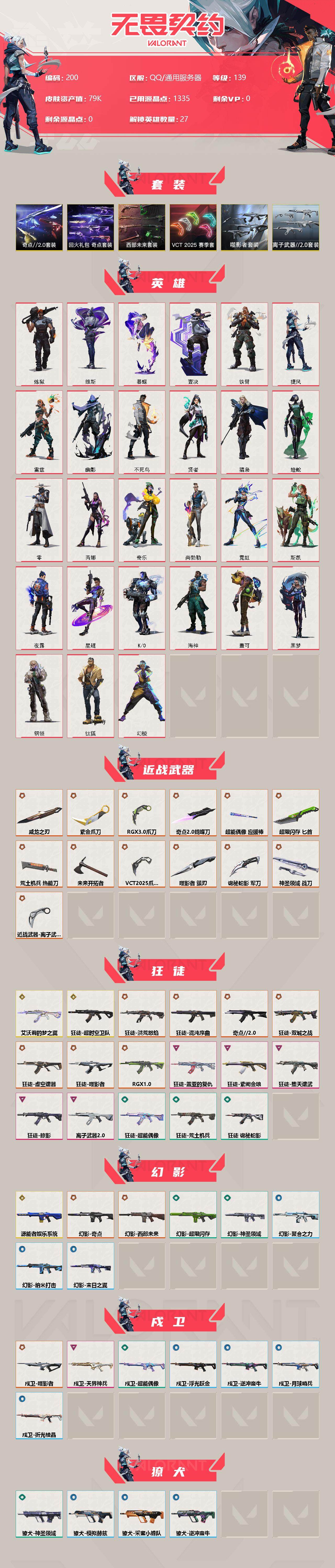 【200】【套装】:噬影者套装,vct 2025 赛季套装,西部未来套装,奇点//2.0套装,回火礼包:奇点套装,离子武器//2.0套装 【英雄】:幻棱,炼狱,维斯,暮蝶,钛狐,壹决,铁臂,捷风,雷兹,幽影,不死鸟,贤者,猎枭,蝰蛇,零,芮娜,奇乐,尚勃勒,霓虹,斯凯,夜露,星礈,k/o,海神,盖可,黑梦,钢锁 【近战 武器】:近战武器-奇点//2.0 蝴蝶刀,近战武器-vct 2025 爪刀,近战武器-紫金爪刀,近战武器-rgx 11z pro//3.0 爪刀,近战武器-噬影者 簇刃,近战武器-威龙之刃,近战武器-离子武器//2.0 爪刀,近战武器-未来开拓者,近战武器-超能偶像 应援棒,近战武器-超限闪存 匕首,近战武器-荒土机兵 热能刀,近战武器-诡秘蛇影 军刀,近战武器-神圣领域 战刀 【狂徒】:狂徒-艾沃莉的梦之翼,狂徒-超时空卫队,狂徒-洪荒怒焰,狂徒-混沌序曲,狂徒-奇点//2.0,狂徒-双城之战,狂徒-虚空遗器,狂徒-噬影者,狂徒-rgx 11z pro,狂徒-堕天遗武,狂徒-掠影,狂徒-盖亚的复仇,狂徒-紫阙金琅,狂徒-离子武器//2.0,狂徒-超能偶像,狂徒-荒土机兵,狂徒-诡秘蛇影 【幻影】:幻影-源能者娱乐系统,幻影-奇点,幻影-西部未来,幻影-超限闪存,幻影-神圣领域,幻影-聚合之力,幻影-纳米打击,幻影-末日之翼,幻影-西部未来 【戍卫】:戍卫-噬影者,戍卫-天界神兵,戍卫-超能偶像,戍卫-浮光跃金,戍卫-逆冲蛮牛,戍卫-月球哨兵,戍卫-折光棱晶 【獠犬】:獠犬-神圣领域,獠犬-采蜜小蜂队,獠犬-模拟赫兹,獠犬-逆冲蛮牛 【冥驹】:冥驹-偃月苍龙,冥驹-堕天遗武,冥驹-荒土机兵,冥驹-模拟赫兹,冥驹-星云暗涌 【飞将】:飞将-西部未来,飞将-聚合之力,飞将-末日之翼 【莽侠】:莽侠-神中神罚,莽侠-超限闪存,莽侠-诡秘蛇影,莽侠-月球哨兵 【战神】:战神-离子武器//2.0,战神-神圣领域,战神-采蜜小蜂队,战神-浮光跃金 【奥丁】:奥丁-西部未来,奥丁-纳米打击,奥丁-末日之翼 【判官】:判官-超能偶像,判官-诡秘蛇影,判官-采蜜小蜂队,判官-纳米打击x 【雄鹿】:雄鹿-盖亚的复仇//2.0,雄鹿-模拟赫兹,雄鹿-逆冲蛮牛,雄鹿-月球哨兵 【骇灵】:骇灵-奇点,骇灵-离子武器//2.0,骇灵-荒土机兵,骇灵-浮光跃金,骇灵-星云暗涌 【蜂刺】:蜂刺-噬影者,蜂刺-超限闪存,蜂刺-聚合之力,蜂刺-星云暗涌,蜂刺-折光棱晶 【标配】:标配-紫阙金琅,标配-超能偶像,标配-荒土机兵,标配-浮光跃金,标配-折光棱晶 【正义】:正义-奇点,正义-西部未来,正义-超限闪存,正义-纳米打击,正义-月球哨兵 【鬼魅】:鬼魅-奇点//2.0,鬼魅-噬影者,鬼魅-耀鳞威龙,鬼魅-诡秘蛇影,鬼魅-采蜜小蜂队,鬼魅-模拟赫兹,鬼魅-星云暗涌 【狂怒】:狂怒-离子武器//2.0,狂怒-神圣领域,狂怒-聚合之力,狂怒-逆冲蛮牛 【短炮】:短炮-末日之翼 【卡面】:进入射程 卡面,分崩离析 卡面,纳米打击 卡面,抑制技术 卡面,激斗汉堡 卡面,瓦娃脸雪糕 p2 卡面,从黄昏到黎明 卡面,荒土机兵 卡面,银弹猎手 卡面,逆冲蛮牛 卡面,《双城之战》拥抱 卡面,精灵大战 卡面,欢迎来到底城 卡面,南瓜盛典 卡面,vct cn首冠 卡面,唱片的故事 卡面,钢弓与箭弦 卡面,排除故障 卡面,奇点//2.0 卡面,战术桌游 卡面,悠享食光 卡面,修车达人 卡面,热舞环节 卡面,模拟赫兹 卡面,浮光跃金 卡面,超限闪存 卡面,维斯工牌 卡面,正义的化身 卡面,终章:生意人麦宝 卡面,铁之华 卡面,失而复得 卡面,时间到 卡面,最高舞台 卡面,复活专家 卡面,归乡 // 蝰蛇 卡面,超能偶像 卡面,生意人麦宝 卡面,声感陷阱设计图 卡面,钢锁工牌 卡面,战术小伙伴的夏日 卡面,采蜜小蜂队 卡面,聚合之力 卡面,梦幻奶茶 卡面,纤云弄巧 卡面,无畏契约go!第一卷:芮娜 卡面,无畏契约go!第一卷:零 卡面,无垠星环 卡面,《双城之战》金克丝 卡面,代号红色 卡面,新兵报到 卡面,v契约 卡面,无畏契约 卡面 【喷漆】:小小心意 喷漆,战“素”兔 喷漆,宇宙的指引 喷漆,请求重启 喷漆,逆冲蛮牛 喷漆,纳米打击 喷漆,鼻尖上的蝴蝶 喷漆,简笔画黯兽 喷漆,独守蝰腹 喷漆,他们将落荒而逃 喷漆,通缉:战术企鹅 喷漆,荒土机兵 喷漆,别挡我吃球! 喷漆,嗨宝南瓜灯 喷漆,嘭! 喷漆,都算到了 喷漆,控场勿近 喷漆,皮蛋呼呼 喷漆,像素星礈 喷漆,图谋不轨的零 喷漆,小丑猫 喷漆,模拟赫兹 喷漆,高丽风情小熊 喷漆,奇点//2.0 喷漆,蹲到一个 喷漆,全力集中 喷漆,超限闪存 喷漆,rua一下 喷漆,熊抱 喷漆,蛋糕还是爆能器? 喷漆,高丽风情小虎 喷漆,记在小本本 喷漆,防弹企鹅 喷漆,高丽风情小蛙 喷漆,又被闪了 喷漆,终极羞辱 喷漆,超级粉丝 喷漆,黯兽卖萌 喷漆,捷风差距 喷漆,惊声尖叫 喷漆,五人成星 喷漆,超能偶像 喷漆,放我出去 喷漆,掩护我 喷漆,大佬发呛 喷漆,边缘试探 喷漆,拼一呛 喷漆,聚合之力 喷漆,采蜜小蜂队 喷漆,梦幻小队 喷漆,五个全都齐了 喷漆,买装还是存钱 喷漆,胜利属于无畏契约 喷漆,glhf 喷漆,无畏契约 喷漆 【挂饰】:第九季:超凡 挂饰,终章:猫猫木乃伊 挂饰,荒土机兵 挂饰,悠闲鸡块 挂饰,猫猫木乃伊 挂饰,水壶 挂饰,纳米打击 挂饰,逆冲蛮牛 挂饰,可爱糖糖 挂饰,伞绳 挂饰,《双城之战》小蛋糕 挂饰,第九季//第三幕 纪念币 挂饰,拳击战术熊 挂饰,工具腰带 挂饰,暗藏猫腻 挂饰,高丽风情 挂饰,奇点//2.0 挂饰,鱼骨头 挂饰,熔岩灯 挂饰,超限闪存 挂饰,瞬云履 挂饰,迷你k/o 挂饰,模拟赫兹 挂饰,第九季//第二幕 纪念币 挂饰,薰衣草之心 挂饰,终章:这瓜保熟 挂饰,炼狱雪糕 挂饰,糖葫芦 挂饰,袖珍捷风 挂饰,冲上云霄 挂饰,超能偶像 