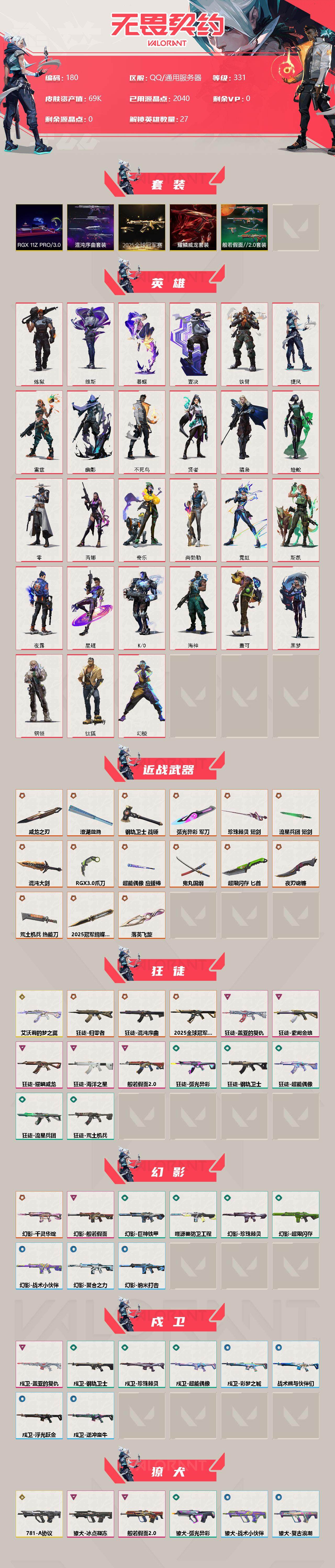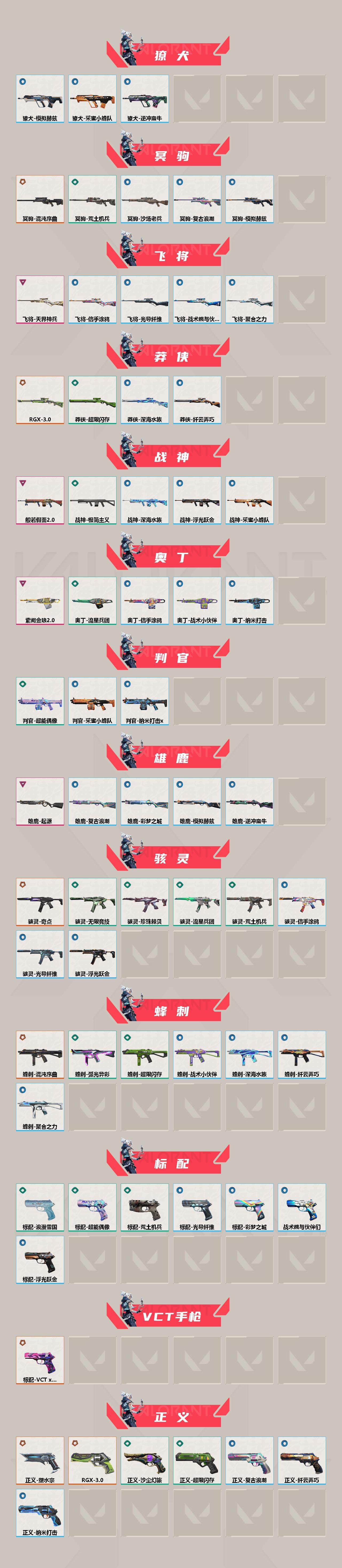 【180】【套装】:2025全球冠军赛套装,rgx 11z pro//3.0套装,混沌序曲套装,般若假面//2.0套装,耀鳞威龙套装 【英雄】:幻棱,炼狱,维斯,暮蝶,钛狐,壹决,铁臂,捷风,雷兹,幽影,不死鸟,贤者,猎枭,蝰蛇,零,芮娜,奇乐,尚勃勒,霓虹,斯凯,夜露,星礈,k/o,海神,盖可,黑梦,钢锁 【近战 武器】:近战武器-2025全球冠军赛 蝴蝶刀,近战武器-rgx 11z pro//3.0 爪刀,近战武器-落英飞旋,近战武器-威龙之刃,近战武器-澄湖潋滟,近战武器-鬼丸国纲,近战武器-珍珠棘贝 短剑,近战武器-混沌大剑,近战武器-流星兵团 短剑,近战武器-超能偶像 应援棒,近战武器-超限闪存 匕首,近战武器-钢轨卫士 战锤,近战武器-弧光异彩 军刀,近战武器-荒土机兵 热能刀,近战武器-夜刃诡镰 【狂徒】:狂徒-艾沃莉的梦之翼,狂徒-2025全球冠军赛,狂徒-归零者,狂徒-混沌序曲,狂徒-般若假面//2.0,狂徒-盖亚的复仇,狂徒-海洋之星,狂徒-耀鳞威龙,狂徒-紫阙金琅,狂徒-超能偶像,狂徒-钢轨卫士,狂徒-弧光异彩,狂徒-荒土机兵,狂徒-流星兵团 【幻影】:幻影-千灵华绽,幻影-般若假面,幻影-超限闪存,幻影-巨神铁甲,幻影-噬源兽防卫工程,幻影-珍珠棘贝,幻影-聚合之力,幻影-纳米打击,幻影-战术小伙伴 【戍卫】:戍卫-盖亚的复仇,戍卫-超能偶像,戍卫-钢轨卫士,戍卫-珍珠棘贝,戍卫-彩梦之城,戍卫-浮光跃金,戍卫-逆冲蛮牛,戍卫-战术熊与伙伴们 【獠犬】:獠犬-781-a协议,獠犬-般若假面//2.0,獠犬-冰点凝冻,獠犬-弧光异彩,獠犬-采蜜小蜂队,獠犬-复古浪潮,獠犬-模拟赫兹,獠犬-逆冲蛮牛,獠犬-战术小伙伴 【冥驹】:冥驹-混沌序曲,冥驹-荒土机兵,冥驹-复古浪潮,冥驹-模拟赫兹,冥驹-沙场老兵 【飞将】:飞将-天界神兵,飞将-聚合之力,飞将-信手涂鸦,飞将-光导纤维,飞将-战术熊与伙伴们 【莽侠】:莽侠-rgx 11z pro//3.0,莽侠-超限闪存,莽侠-深海水族,莽侠-纤云弄巧 【战神】:战神-般若假面//2.0,战神-极简主义,战神-采蜜小蜂队,战神-浮光跃金,战神-深海水族 【奥丁】:奥丁-紫阙金琅//2.0,奥丁-流星兵团,奥丁-纳米打击,奥丁-信手涂鸦,奥丁-战术小伙伴 【判官】:判官-超能偶像,判官-采蜜小蜂队,判官-纳米打击x 【雄鹿】:雄鹿-起源,雄鹿-彩梦之城,雄鹿-复古浪潮,雄鹿-模拟赫兹,雄鹿-逆冲蛮牛 【骇灵】:骇灵-奇点,骇灵-荒土机兵,骇灵-流星兵团,骇灵-珍珠棘贝,骇灵-无限竞技,骇灵-浮光跃金,骇灵-光导纤维,骇灵-信手涂鸦 【蜂刺】:蜂刺-混沌序曲,蜂刺-超限闪存,蜂刺-弧光异彩,蜂刺-聚合之力,蜂刺-深海水族,蜂刺-纤云弄巧,蜂刺-战术小伙伴 【标配】:标配-超能偶像,标配-荒土机兵,标配-浪漫雪国,标配-彩梦之城,标配-浮光跃金,标配-光导纤维,标配-战术熊与伙伴们 【vct手呛】:标配-vct x prx 【正义】:正义-rgx 11z pro//3.0,正义-塑水宗,正义-超限闪存,正义-沙尘幻旅,正义-复古浪潮,正义-纳米打击,正义-纤云弄巧 【鬼魅】:鬼魅-耀鳞威龙,鬼魅-流星兵团,鬼魅-诡秘蛇影,鬼魅-采蜜小蜂队,鬼魅-光导纤维,鬼魅-模拟赫兹,鬼魅-信手涂鸦,鬼魅-星云暗涌 【狂怒】:狂怒-般若假面//2.0,狂怒-钢轨卫士,狂怒-珍珠棘贝,狂怒-聚合之力,狂怒-逆冲蛮牛,狂怒-战术熊与伙伴们 【短炮】:短炮-混沌序曲,短炮-钢轨卫士,短炮-弧光异彩,短炮-深海水族,短炮-纤云弄巧 【卡面】:终章:激斗汉堡 卡面,进入射程 卡面,分崩离析 卡面,纳米打击 卡面,抑制技术 卡面,激斗汉堡 卡面,瓦娃脸雪糕 p2 卡面,从黄昏到黎明 卡面,荒土机兵 卡面,银弹猎手 卡面,逆冲蛮牛 卡面,《双城之战》拥抱 卡面,精灵大战 卡面,欢迎来到底城 卡面,南瓜盛典 卡面,vct cn首冠 卡面,唱片的故事 卡面,钢弓与箭弦 卡面,排除故障 卡面,战术桌游 卡面,悠享食光 卡面,修车达人 卡面,热舞环节 卡面,模拟赫兹 卡面,浮光跃金 卡面,超限闪存 卡面,维斯工牌 卡面,正义的化身 卡面,终章:生意人麦宝 卡面,铁之华 卡面,失而复得 卡面,时间到 卡面,最高舞台 卡面,复活专家 卡面,归乡 // 蝰蛇 卡面,rgx 11z pro//3.0 卡面,超能偶像 卡面,生意人麦宝 卡面,树懒大作战 卡面,声感陷阱设计图 卡面,clutch 卡面,霓帧牛蛙 卡面,钢锁工牌 卡面,战术小伙伴的夏日 卡面,采蜜小蜂队 卡面,聚合之力 卡面,梦幻奶茶 卡面,终章:打造专属狂徒 卡面,趁热吃 卡面,西装暴徒 卡面,失控边缘 卡面,哨卫者之领域 卡面,暮蝶工牌 卡面,战术熊与伙伴们 卡面,源能反应 卡面,流星兵团 卡面,纤云弄巧 卡面,暂别喧嚣 卡面,打造专属狂徒 卡面,零点嗅探设计图 卡面,终章:瓦娃脸雪糕 卡面,表象之下 卡面,虹吸式咖啡壶 卡面,源能者美容 卡面,脚踝终结者 卡面 ,夜班 卡面,瓦娃脸雪糕 卡面 ,沙雕爆能器 卡面,无畏契约go!第一卷:芮娜 卡面,深海水族 卡面,珍珠棘贝 卡面,复古浪潮 卡面,盖可工牌 卡面,清除名单 卡面,无畏契约go!第一卷:零 卡面,终章:同步耍酷 卡面,龍记 卡面,化茧成蝶 卡面,比比看谁快? 卡面,无垠星环 卡面,《双城之战》金克丝 卡面,蝰蛇vs幽影 卡面,势不可挡//盖可 卡面,逆向独行 卡面 ,同步耍酷 卡面,完美调谐 卡面 ,没有什么能逃过我的眼睛 卡面,光导纤维 卡面,战术小伙伴 卡面,钢轨卫士 卡面,暗呛 卡面,终章:黑影先生的咖啡! 卡面,铁臂vs雷兹 卡面,钢锁vs盖可 卡面,别冒尖 卡面,夯实根基 卡面,"luie" 卡面,热烈欢迎 卡面,铁臂设计图 卡面,代号红色 卡面,冰淇淋店 卡面,新兵报到 卡面,友军火力 卡面,v契约 卡面,无畏契约 卡面 【喷漆】:小小心意 喷漆,战“素”