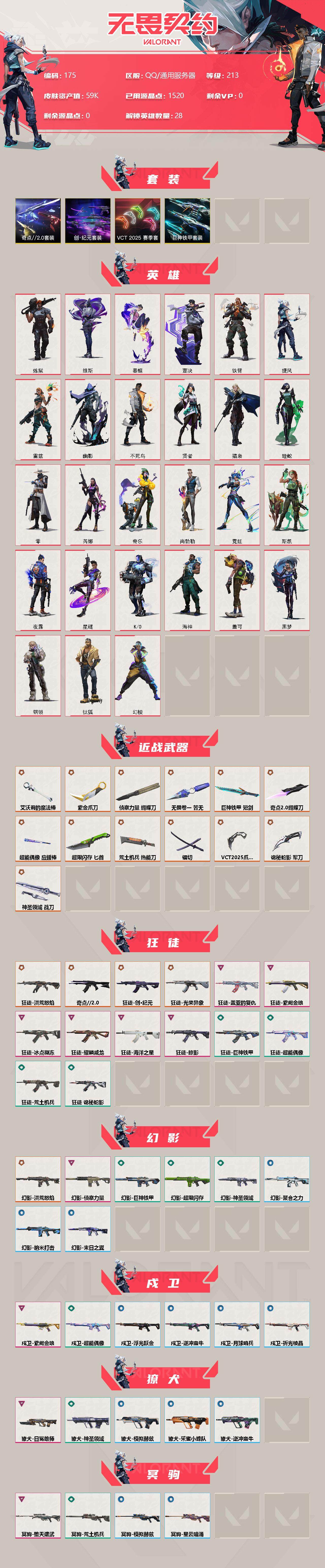 【175】【套装】:vct 2025 赛季套装,创·纪元套装,奇点//2.0套装,巨神铁甲套装 【英雄】:幻棱,炼狱,维斯,暮蝶,钛狐,壹决,铁臂,捷风,雷兹,幽影,不死鸟,贤者,猎枭,蝰蛇,零,芮娜,奇乐,尚勃勒,霓虹,斯凯,夜露,星礈,k/o,海神,盖可,黑梦,钢锁 【近战 武器】:近战武器-无畏契约go!第一卷 苦无,近战武器-侦察力量 蝴蝶刀,近战武器-奇点//2.0 蝴蝶刀,近战武器-vct 2025 爪刀,近战武器-紫金爪刀,近战武器-镭切,近战武器-艾沃莉的魔法棒,近战武器-巨神铁甲 短剑,近战武器-超能偶像 应援棒,近战武器-超限闪存 匕首,近战武器-荒土机兵 热能刀,近战武器-诡秘蛇影 军刀,近战武器-神圣领域 战刀 【狂徒】:狂徒-洪荒怒焰,狂徒-奇点//2.0,狂徒-创·纪元,狂徒-光荣异象,狂徒-冰点凝冻,狂徒-掠影,狂徒-盖亚的复仇,狂徒-海洋之星,狂徒-耀鳞威龙,狂徒-紫阙金琅,狂徒-超能偶像,狂徒-荒土机兵,狂徒-巨神铁甲,狂徒-诡秘蛇影 【幻影】:幻影-洪荒怒焰,幻影-侦察力量,幻影-超限闪存,幻影-巨神铁甲,幻影-神圣领域,幻影-聚合之力,幻影-纳米打击,幻影-末日之翼 【戍卫】:戍卫-紫阙金琅,戍卫-超能偶像,戍卫-浮光跃金,戍卫-逆冲蛮牛,戍卫-月球哨兵,戍卫-折光棱晶 【獠犬】:獠犬-日冕雄师,獠犬-神圣领域,獠犬-采蜜小蜂队,獠犬-模拟赫兹,獠犬-逆冲蛮牛 【冥驹】:冥驹-堕天遗武,冥驹-荒土机兵,冥驹-模拟赫兹,冥驹-星云暗涌 【飞将】:飞将-聚合之力,飞将-末日之翼 【莽侠】:莽侠-创·纪元,莽侠-超限闪存,莽侠-诡秘蛇影,莽侠-月球哨兵 【战神】:战神-神圣领域,战神-采蜜小蜂队,战神-浮光跃金 【奥丁】:奥丁-巨神铁甲,奥丁-纳米打击,奥丁-末日之翼 【判官】:判官-超能偶像,判官-诡秘蛇影,判官-采蜜小蜂队,判官-纳米打击x 【雄鹿】:雄鹿-模拟赫兹,雄鹿-逆冲蛮牛,雄鹿-月球哨兵 【骇灵】:骇灵-创·纪元,骇灵-荒土机兵,骇灵-浮光跃金,骇灵-星云暗涌 【蜂刺】:蜂刺-超限闪存,蜂刺-聚合之力,蜂刺-星云暗涌,蜂刺-折光棱晶 【标配】:标配-紫阙金琅,标配-超能偶像,标配-荒土机兵,标配-浮光跃金,标配-折光棱晶 【正义】:正义-塑水宗,正义-创·纪元,正义-超限闪存,正义-复古浪潮,正义-纳米打击,正义-月球哨兵 【鬼魅】:鬼魅-奇点//2.0,鬼魅-噬影者,鬼魅-流星兵团,鬼魅-诡秘蛇影,鬼魅-采蜜小蜂队,鬼魅-模拟赫兹,鬼魅-星云暗涌 【狂怒】:狂怒-巨神铁甲,狂怒-神圣领域,狂怒-聚合之力,狂怒-逆冲蛮牛 【短炮】:短炮-末日之翼 【卡面】:终章:激斗汉堡 卡面,进入射程 卡面,分崩离析 卡面,纳米打击 卡面,抑制技术 卡面,激斗汉堡 卡面,瓦娃脸雪糕 p2 卡面,从黄昏到黎明 卡面,荒土机兵 卡面,银弹猎手 卡面,逆冲蛮牛 卡面,《双城之战》拥抱 卡面,精灵大战 卡面,欢迎来到底城 卡面,南瓜盛典 卡面,唱片的故事 卡面,钢弓与箭弦 卡面,排除故障 卡面,奇点//2.0 卡面,战术桌游 卡面,悠享食光 卡面,修车达人 卡面,模拟赫兹 卡面,浮光跃金 卡面,超限闪存 卡面,维斯工牌 卡面,正义的化身 卡面,终章:生意人麦宝 卡面,铁之华 卡面,失而复得 卡面,时间到 卡面,最高舞台 卡面,复活专家 卡面,归乡 // 蝰蛇 卡面,超能偶像 卡面,生意人麦宝 卡面,声感陷阱设计图 卡面,钢锁工牌 卡面,战术小伙伴的夏日 卡面,采蜜小蜂队 卡面,聚合之力 卡面,梦幻奶茶 卡面,终章:打造专属狂徒 卡面,趁热吃 卡面,无畏契约:尚勃勒 卡面,暮蝶工牌 卡面,源能反应 卡面,零点嗅探设计图 卡面,终章:瓦娃脸雪糕 卡面,表象之下 卡面,沙雕爆能器 卡面,无畏契约go!第一卷:芮娜 卡面,清除名单 卡面,无畏契约go!第一卷:零 卡面,龍记 卡面,势不可挡//盖可 卡面,逆向独行 卡面 ,完美调谐 卡面 ,暗呛 卡面,铁臂vs雷兹 卡面,黑影先生的咖啡! 卡面,热烈欢迎 卡面,铁臂设计图 卡面,代号红色 卡面,冰淇淋店 卡面,新兵报到 卡面,友军火力 卡面,v契约 卡面,无畏契约 卡面 【喷漆】:小小心意 喷漆,战“素”兔 喷漆,宇宙的指引 喷漆,请求重启 喷漆,逆冲蛮牛 喷漆,纳米打击 喷漆,鼻尖上的蝴蝶 喷漆,简笔画黯兽 喷漆,独守蝰腹 喷漆,他们将落荒而逃 喷漆,通缉:战术企鹅 喷漆,荒土机兵 喷漆,别挡我吃球! 喷漆,嗨宝南瓜灯 喷漆,嘭! 喷漆,都算到了 喷漆,控场勿近 喷漆,皮蛋呼呼 喷漆,像素星礈 喷漆,图谋不轨的零 喷漆,小丑猫 喷漆,模拟赫兹 喷漆,高丽风情小熊 喷漆,奇点//2.0 喷漆,蹲到一个 喷漆,全力集中 喷漆,超限闪存 喷漆,rua一下 喷漆,熊抱 喷漆,高丽风情小虎 喷漆,记在小本本 喷漆,防弹企鹅 喷漆,高丽风情小蛙 喷漆,又被闪了 喷漆,终极羞辱 喷漆,超级粉丝 喷漆,黯兽卖萌 喷漆,捷风差距 喷漆,惊声尖叫 喷漆,五人成星 喷漆,超能偶像 喷漆,放我出去 喷漆,掩护我 喷漆,大佬发呛 喷漆,边缘试探 喷漆,拼一呛 喷漆,聚合之力 喷漆,采蜜小蜂队 喷漆,梦幻小队 喷漆,五个全都齐了 喷漆,我觉得不行 喷漆,致命优雅 喷漆,我的刀呢? 喷漆,uwu 喷漆,新潮流 喷漆,双击点赞 喷漆,买装还是存钱 喷漆,醒狮贺春 喷漆,蕊形灯 喷漆,老铁困了 喷漆,口袋贤者 喷漆,胜利属于无畏契约 喷漆,glhf 喷漆,无畏契约 喷漆 【挂饰】:终章:猫猫木乃伊 挂饰,荒土机兵 挂饰,悠闲鸡块 挂饰,猫猫木乃伊 挂饰,水壶 挂饰,纳米打击 挂饰,逆冲蛮牛 挂饰,可爱糖糖 挂饰,伞绳 挂饰,《双城之战》小蛋糕 挂饰,第九季//第三幕 纪念币 挂饰,拳击战术熊 挂饰,工具腰带 挂饰,无畏契约go!第一卷 芮娜 挂饰,无畏契约go!第一卷 零 