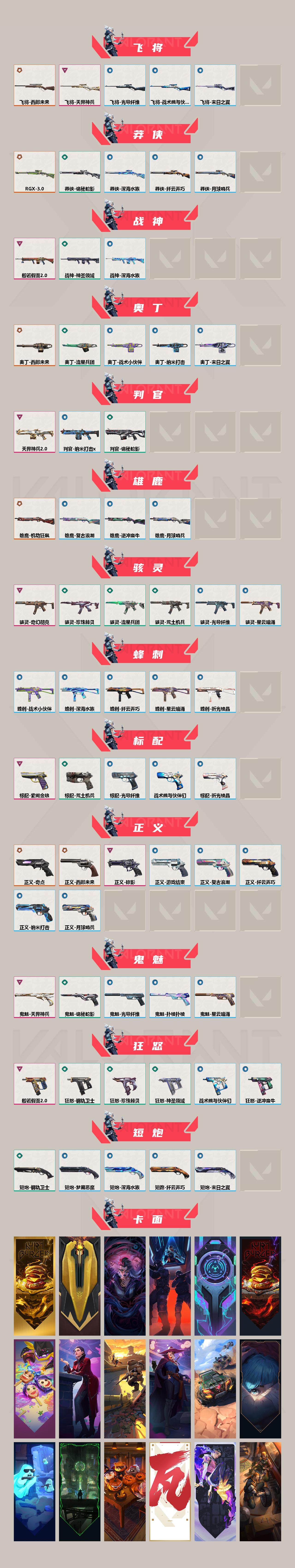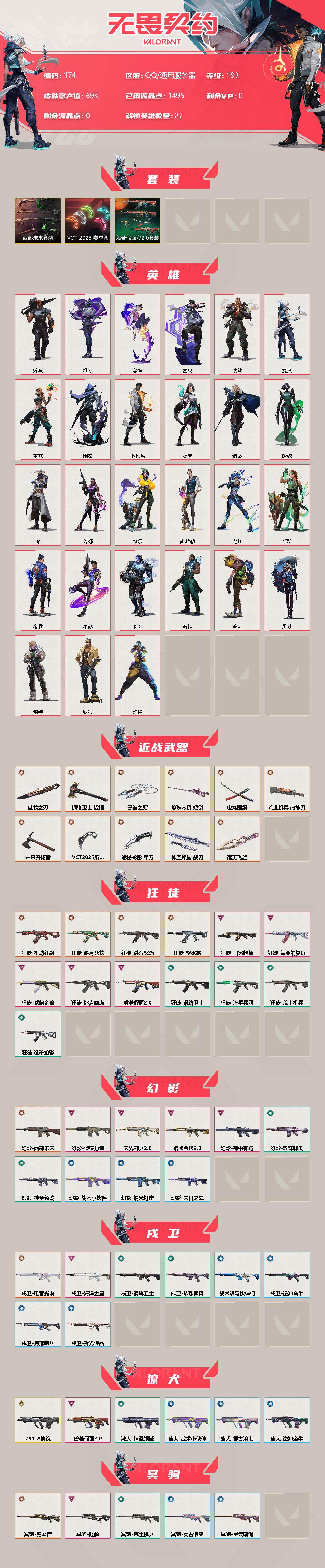 【174】【套装】:vct 2025 赛季套装,西部未来套装,般若假面//2.0套装 【英雄】:幻棱,炼狱,维斯,暮蝶,钛狐,壹决,铁臂,捷风,雷兹,幽影,不死鸟,贤者,猎枭,蝰蛇,零,芮娜,奇乐,尚勃勒,霓虹,斯凯,夜露,星礈,k/o,海神,盖可,黑梦,钢锁 【近战 武器】:近战武器-vct 2025 爪刀,近战武器-黑波之刃,近战武器-落英飞旋,近战武器-威龙之刃,近战武器-鬼丸国纲,近战武器-未来开拓者,近战武器-珍珠棘贝 短剑,近战武器-钢轨卫士 战锤,近战武器-荒土机兵 热能刀,近战武器-诡秘蛇影 军刀,近战武器-神圣领域 战刀 【狂徒】:狂徒-洪荒怒焰,狂徒-机动狂飙,狂徒-塑水宗,狂徒-偃月苍龙,狂徒-般若假面//2.0,狂徒-冰点凝冻,狂徒-盖亚的复仇,狂徒-日冕雄师,狂徒-紫阙金琅,狂徒-钢轨卫士,狂徒-荒土机兵,狂徒-流星兵团,狂徒-诡秘蛇影 【幻影】:幻影-西部未来,幻影-天界神兵//2.0,幻影-侦察力量,幻影-紫阙金琅//2.0,幻影-神中神罚,幻影-珍珠棘贝,幻影-神圣领域,幻影-纳米打击,幻影-战术小伙伴,幻影-末日之翼,幻影-西部未来 【戍卫】:戍卫-电音光谱,戍卫-海洋之星,戍卫-钢轨卫士,戍卫-珍珠棘贝,戍卫-逆冲蛮牛,戍卫-战术熊与伙伴们,戍卫-月球哨兵,戍卫-折光棱晶,戍卫-电音光谱 【獠犬】:獠犬-781-a协议,獠犬-般若假面//2.0,獠犬-神圣领域,獠犬-复古浪潮,獠犬-逆冲蛮牛,獠犬-战术小伙伴 【冥驹】:冥驹-归零者,冥驹-起源,冥驹-荒土机兵,冥驹-复古浪潮,冥驹-星云暗涌 【飞将】:飞将-西部未来,飞将-天界神兵,飞将-光导纤维,飞将-战术熊与伙伴们,飞将-末日之翼 【莽侠】:莽侠-rgx 11z pro//3.0,莽侠-诡秘蛇影,莽侠-深海水族,莽侠-纤云弄巧,莽侠-月球哨兵 【战神】:战神-般若假面//2.0,战神-神圣领域,战神-深海水族 【奥丁】:奥丁-西部未来,奥丁-流星兵团,奥丁-纳米打击,奥丁-战术小伙伴,奥丁-末日之翼 【判官】:判官-天界神兵//2.0,判官-诡秘蛇影,判官-纳米打击x 【雄鹿】:雄鹿-机动狂飙,雄鹿-复古浪潮,雄鹿-逆冲蛮牛,雄鹿-月球哨兵 【骇灵】:骇灵-奇幻朋克,骇灵-荒土机兵,骇灵-流星兵团,骇灵-珍珠棘贝,骇灵-光导纤维,骇灵-星云暗涌 【蜂刺】:蜂刺-深海水族,蜂刺-纤云弄巧,蜂刺-战术小伙伴,蜂刺-星云暗涌,蜂刺-折光棱晶 【标配】:标配-紫阙金琅,标配-荒土机兵,标配-光导纤维,标配-战术熊与伙伴们,标配-折光棱晶 【正义】:正义-奇点,正义-西部未来,正义-掠影,正义-复古浪潮,正义-纳米打击,正义-纤云弄巧,正义-游戏结束,正义-月球哨兵 【鬼魅】:鬼魅-天界神兵,鬼魅-诡秘蛇影,鬼魅-光导纤维,鬼魅-扑棱扑棱,鬼魅-星云暗涌 【狂怒】:狂怒-般若假面//2.0,狂怒-钢轨卫士,狂怒-珍珠棘贝,狂怒-神圣领域,狂怒-逆冲蛮牛,狂怒-战术熊与伙伴们 【短炮】:短炮-钢轨卫士,短炮-梦魇恶魔,短炮-深海水族,短炮-纤云弄巧,短炮-末日之翼 【卡面】:终章:激斗汉堡 卡面,进入射程 卡面,分崩离析 卡面,纳米打击 卡面,抑制技术 卡面,激斗汉堡 卡面,瓦娃脸雪糕 p2 卡面,从黄昏到黎明 卡面,荒土机兵 卡面,银弹猎手 卡面,逆冲蛮牛 卡面,《双城之战》拥抱 卡面,精灵大战 卡面,欢迎来到底城 卡面,南瓜盛典 卡面,vct cn首冠 卡面,无畏契约:暮蝶 卡面,修车达人 卡面,热舞环节 卡面,正义的化身 卡面,先瓦为敬 银色 卡面,红鳞松叶 卡面,梦幻奶茶 卡面,失控边缘 卡面,哨卫者之领域 卡面,暮蝶工牌 卡面,战术熊与伙伴们 卡面,源能反应 卡面,流星兵团 卡面,纤云弄巧 卡面,暂别喧嚣 卡面,打造专属狂徒 卡面,零点嗅探设计图 卡面,终章:瓦娃脸雪糕 卡面,表象之下 卡面,虹吸式咖啡壶 卡面,源能者美容 卡面,脚踝终结者 卡面 ,夜班 卡面,瓦娃脸雪糕 卡面 ,沙雕爆能器 卡面,无畏契约go!第一卷:芮娜 卡面,深海水族 卡面,珍珠棘贝 卡面,复古浪潮 卡面,盖可工牌 卡面,清除名单 卡面,无畏契约go!第一卷:零 卡面,终章:同步耍酷 卡面,龍记 卡面,化茧成蝶 卡面,比比看谁快? 卡面,《双城之战》金克丝 卡面,蝰蛇vs幽影 卡面,势不可挡//盖可 卡面,逆向独行 卡面 ,同步耍酷 卡面,完美调谐 卡面 ,没有什么能逃过我的眼睛 卡面,光导纤维 卡面,战术小伙伴 卡面,钢轨卫士 卡面,暗呛 卡面,无畏契约go!第一卷:贤者 卡面,钢锁vs盖可 卡面,别冒尖 卡面,夯实根基 卡面,"luie" 卡面,热烈欢迎 卡面,铁臂设计图 卡面,代号红色 卡面,冰淇淋店 卡面,新兵报到 卡面,友军火力 卡面,v契约 卡面,无畏契约 卡面,暗潮 卡面 【喷漆】:小小心意 喷漆,战“素”兔 喷漆,宇宙的指引 喷漆,请求重启 喷漆,逆冲蛮牛 喷漆,纳米打击 喷漆,鼻尖上的蝴蝶 喷漆,简笔画黯兽 喷漆,独守蝰腹 喷漆,他们将落荒而逃 喷漆,通缉:战术企鹅 喷漆,荒土机兵 喷漆,别挡我吃球! 喷漆,嗨宝南瓜灯 喷漆,嘭! 喷漆,都算到了 喷漆,控场勿近 喷漆,伤心心 喷漆,熊抱 喷漆,加油!加油! 喷漆,开心到爆炸 喷漆,皮蛋萌舞 喷漆,我觉得不行 喷漆,头号粉丝 喷漆,吸一口快乐 喷漆,永远的答案 喷漆,再来一次? 喷漆,别挡我的路! 喷漆,我的刀呢? 喷漆,当然可以 喷漆,流星兵团 喷漆,战术熊与伙伴们 喷漆,禁止喷漆 喷漆,纤云弄巧 喷漆,情绪控制 喷漆,哨卫滑步 喷漆,倒吸一口凉气 喷漆,uwu 喷漆,新潮流 喷漆,逮到一个 喷漆,一个人的孤岛 喷漆,双人比心 喷漆,不予置评 喷漆,三熊合一 喷漆,要喝完噢! 喷漆,双击点赞 喷漆,珍珠棘贝 喷漆,深海水族 喷漆,禁止标配 喷漆 ,铁臂尴尬 喷漆,买装还是存钱 喷漆,醒狮贺春 喷漆,萌化了 喷漆,无
