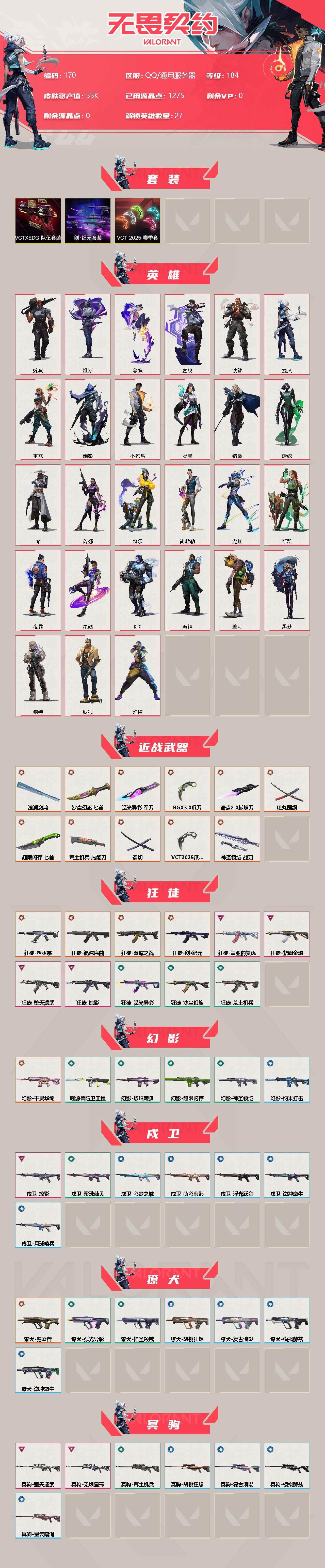 【170】【套装】:vct 2025 赛季套装,创·纪元套装,vctxedg 队伍套装 【英雄】:幻棱,炼狱,维斯,暮蝶,钛狐,壹决,铁臂,捷风,雷兹,幽影,不死鸟,贤者,猎枭,蝰蛇,零,芮娜,奇乐,尚勃勒,霓虹,斯凯,夜露,星礈,k/o,海神,盖可,黑梦,钢锁 【近战 武器】:近战武器-奇点//2.0 蝴蝶刀,近战武器-vct 2025 爪刀,近战武器-rgx 11z pro//3.0 爪刀,近战武器-镭切,近战武器-澄湖潋滟,近战武器-鬼丸国纲,近战武器-超限闪存 匕首,近战武器-弧光异彩 军刀,近战武器-荒土机兵 热能刀,近战武器-沙尘幻旅 匕首,近战武器-神圣领域 战刀 【狂徒】:狂徒-混沌序曲,狂徒-双城之战,狂徒-塑水宗,狂徒-创·纪元,狂徒-堕天遗武,狂徒-掠影,狂徒-盖亚的复仇,狂徒-紫阙金琅,狂徒-弧光异彩,狂徒-荒土机兵,狂徒-沙尘幻旅 【幻影】:幻影-千灵华绽,幻影-超限闪存,幻影-噬源兽防卫工程,幻影-珍珠棘贝,幻影-神圣领域,幻影-纳米打击 【戍卫】:戍卫-掠影,戍卫-珍珠棘贝,戍卫-彩梦之城,戍卫-浮光跃金,戍卫-萌彩剪影,戍卫-逆冲蛮牛,戍卫-月球哨兵 【獠犬】:獠犬-归零者,獠犬-弧光异彩,獠犬-神圣领域,獠犬-复古浪潮,獠犬-胡桃狂想,獠犬-模拟赫兹,獠犬-逆冲蛮牛 【冥驹】:冥驹-堕天遗武,冥驹-无垠星环,冥驹-荒土机兵,冥驹-复古浪潮,冥驹-胡桃狂想,冥驹-模拟赫兹,冥驹-星云暗涌 【飞将】:飞将-黯夜怪谈,飞将-沙尘幻旅,飞将-信手涂鸦 【莽侠】:莽侠-创·纪元,莽侠-超限闪存,莽侠-深海水族,莽侠-月球哨兵 【战神】:战神-神圣领域,战神-浮光跃金,战神-萌彩剪影,战神-深海水族 【奥丁】:奥丁-光明哨兵//2.0,奥丁-纳米打击,奥丁-信手涂鸦 【判官】:判官-萌彩剪影,判官-纳米打击x 【雄鹿】:雄鹿-离子武器,雄鹿-彩梦之城,雄鹿-复古浪潮,雄鹿-模拟赫兹,雄鹿-逆冲蛮牛,雄鹿-月球哨兵 【骇灵】:骇灵-创·纪元,骇灵-荒土机兵,骇灵-沙尘幻旅,骇灵-珍珠棘贝,骇灵-浮光跃金,骇灵-信手涂鸦,骇灵-星云暗涌 【蜂刺】:蜂刺-混沌序曲,蜂刺-超限闪存,蜂刺-弧光异彩,蜂刺-胡桃狂想,蜂刺-深海水族,蜂刺-星云暗涌 【标配】:标配-超能偶像,标配-荒土机兵,标配-彩梦之城,标配-浮光跃金 【vct手呛】:标配-vct x edg 【正义】:正义-奇点,正义-创·纪元,正义-超限闪存,正义-沙尘幻旅,正义-纳米打击,正义-月球哨兵 【鬼魅】:鬼魅-天界神兵,鬼魅-流星兵团,鬼魅-胡桃狂想,鬼魅-模拟赫兹,鬼魅-信手涂鸦,鬼魅-星云暗涌 【狂怒】:狂怒-全息波普,狂怒-珍珠棘贝,狂怒-神圣领域,狂怒-萌彩剪影,狂怒-逆冲蛮牛,狂怒-喷火式 【短炮】:短炮-弧光异彩,短炮-蛇吻,短炮-深海水族 【卡面】:终章:激斗汉堡 卡面,进入射程 卡面,分崩离析 卡面,纳米打击 卡面,抑制技术 卡面,激斗汉堡 卡面,瓦娃脸雪糕 p2 卡面,从黄昏到黎明 卡面,荒土机兵 卡面,银弹猎手 卡面,逆冲蛮牛 卡面,《双城之战》拥抱 卡面,精灵大战 卡面,欢迎来到底城 卡面,南瓜盛典 卡面,vct cn首冠 卡面,唱片的故事 卡面,钢弓与箭弦 卡面,无畏契约:暮蝶 卡面,排除故障 卡面,战术桌游 卡面,悠享食光 卡面,修车达人 卡面,热舞环节 卡面,模拟赫兹 卡面,浮光跃金 卡面,超限闪存 卡面,维斯工牌 卡面,正义的化身 卡面,至黑之夜 卡面,终章:生意人麦宝 卡面,铁之华 卡面,时间到 卡面,最高舞台 卡面,声感陷阱设计图 卡面,梦幻奶茶 卡面,终章:打造专属狂徒 卡面,趁热吃 卡面,源能反应 卡面,零点嗅探设计图 卡面,无畏契约:蝰蛇 卡面,源能者美容 卡面,脚踝终结者 卡面 ,夜班 卡面,瓦娃脸雪糕 卡面 ,沙雕爆能器 卡面,无畏契约go!第一卷:芮娜 卡面,深海水族 卡面,珍珠棘贝 卡面,复古浪潮 卡面,盖可工牌 卡面,清除名单 卡面,无畏契约go!第一卷:零 卡面,龍记 卡面,《双城之战》金克丝 卡面,完美调谐 卡面 ,暗呛 卡面,终章:黑影先生的咖啡! 卡面,铁臂vs雷兹 卡面,纪念照 p2 卡面,钢锁vs盖可 卡面,别冒尖 卡面,一击全倒 卡面,黑影先生的咖啡! 卡面,天台狂欢 卡面,胡桃狂想 卡面,沙尘幻旅 卡面,壹决工牌 卡面,萌彩剪影 卡面,势不可挡//k/o 卡面,夯实根基 卡面,"luie" 卡面,热烈欢迎 卡面,铁臂设计图 卡面,代号红色 卡面,冰淇淋店 卡面,新兵报到 卡面,友军火力 卡面,v契约 卡面,无畏契约 卡面 【喷漆】:小小心意 喷漆,战“素”兔 喷漆,宇宙的指引 喷漆,请求重启 喷漆,逆冲蛮牛 喷漆,纳米打击 喷漆,鼻尖上的蝴蝶 喷漆,简笔画黯兽 喷漆,独守蝰腹 喷漆,他们将落荒而逃 喷漆,通缉:战术企鹅 喷漆,荒土机兵 喷漆,别挡我吃球! 喷漆,嗨宝南瓜灯 喷漆,嘭! 喷漆,都算到了 喷漆,控场勿近 喷漆,皮蛋呼呼 喷漆,像素星礈 喷漆,图谋不轨的零 喷漆,伤心心 喷漆,小丑猫 喷漆,模拟赫兹 喷漆,高丽风情小熊 喷漆,蹲到一个 喷漆,全力集中 喷漆,超限闪存 喷漆,rua一下 喷漆,熊抱 喷漆,蛋糕还是爆能器? 喷漆,高丽风情小虎 喷漆,记在小本本 喷漆,防弹企鹅 喷漆,高丽风情小蛙 喷漆,超级粉丝 喷漆,捷风差距 喷漆,惊声尖叫 喷漆,2021冠军巡回赛花火 喷漆,审判之爪 喷漆,拼一呛 喷漆,我觉得不行 喷漆,蝰蛇 喷漆,我的刀呢? 喷漆,致命毒素 喷漆,喜欢哪种毒? 喷漆,情绪控制 喷漆,哨卫滑步 喷漆,倒吸一口凉气 喷漆,uwu 喷漆,新潮流 喷漆,逮到一个 喷漆,一个人的孤岛 喷漆,双人比心 喷漆,不予置评 喷漆,三熊合一 喷漆,要喝完噢! 喷漆,双击点赞 喷漆,珍珠棘贝 喷漆,深海水族 喷漆,禁止标配 喷漆 ,铁臂尴尬 喷漆,买装还是存钱 喷漆,醒狮贺春 喷漆,关门放狗 喷漆,无