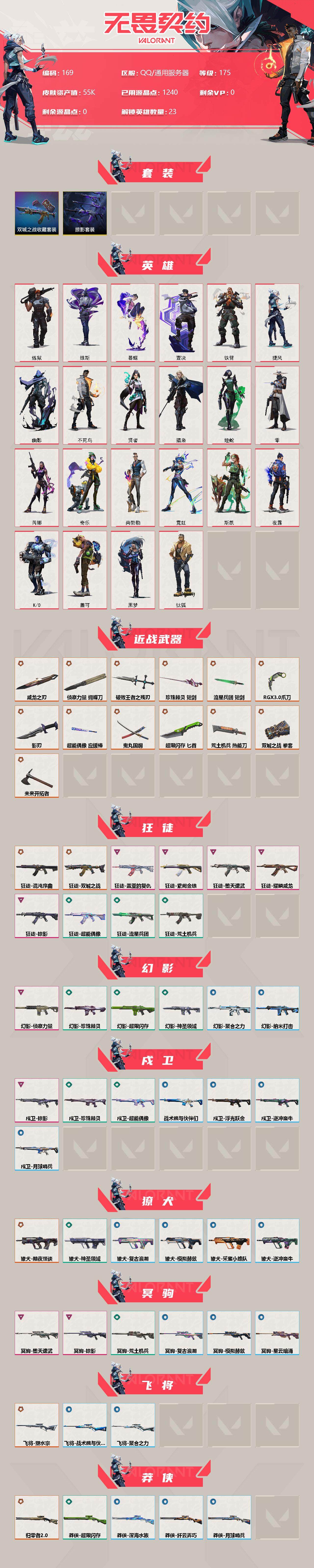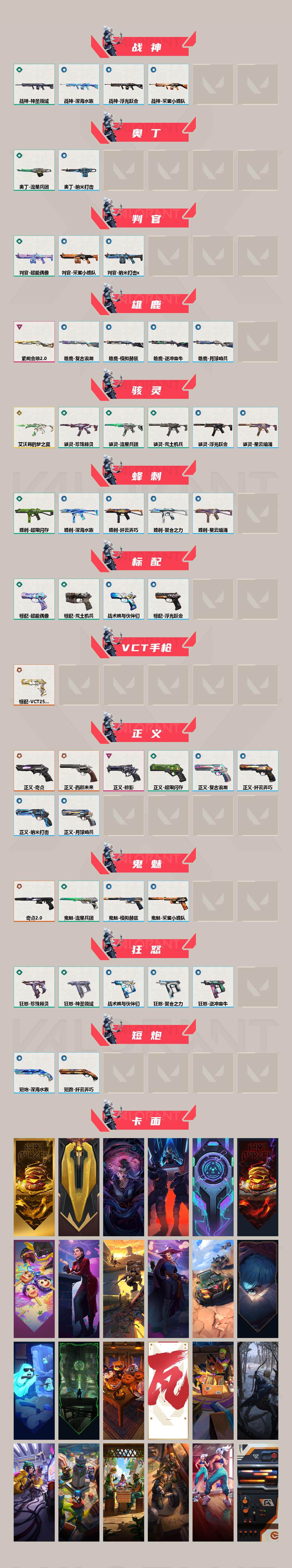 【169】【套装】:《双城之战》收藏套装,掠影套装 【英雄】:炼狱,维斯,暮蝶,钛狐,壹决,铁臂,捷风,幽影,不死鸟,贤者,猎枭,蝰蛇,零,芮娜,奇乐,尚勃勒,霓虹,斯凯,夜露,k/o,盖可,黑梦 【近战 武器】:近战武器-侦察力量 蝴蝶刀,近战武器-rgx 11z pro//3.0 爪刀,近战武器-威龙之刃,近战武器-鬼丸国纲,近战武器-双城之战 拳套,近战武器-未来开拓者,近战武器-珍珠棘贝 短剑,近战武器-流星兵团 短剑,近战武器-超能偶像 应援棒,近战武器-超限闪存 匕首,近战武器-荒土机兵 热能刀,近战武器-破败王者之残刃,近战武器-影刃 【狂徒】:狂徒-混沌序曲,狂徒-双城之战,狂徒-堕天遗武,狂徒-掠影,狂徒-盖亚的复仇,狂徒-耀鳞威龙,狂徒-紫阙金琅,狂徒-超能偶像,狂徒-荒土机兵,狂徒-流星兵团 【幻影】:幻影-侦察力量,幻影-超限闪存,幻影-珍珠棘贝,幻影-神圣领域,幻影-聚合之力,幻影-纳米打击 【戍卫】:戍卫-掠影,戍卫-超能偶像,戍卫-珍珠棘贝,戍卫-浮光跃金,戍卫-逆冲蛮牛,戍卫-战术熊与伙伴们,戍卫-月球哨兵 【獠犬】:獠犬-黯夜怪谈,獠犬-神圣领域,獠犬-采蜜小蜂队,獠犬-复古浪潮,獠犬-模拟赫兹,獠犬-逆冲蛮牛 【冥驹】:冥驹-堕天遗武,冥驹-掠影,冥驹-荒土机兵,冥驹-复古浪潮,冥驹-模拟赫兹,冥驹-星云暗涌 【飞将】:飞将-塑水宗,飞将-聚合之力,飞将-战术熊与伙伴们 【莽侠】:莽侠-归零者//2.0,莽侠-超限闪存,莽侠-深海水族,莽侠-纤云弄巧,莽侠-月球哨兵 【战神】:战神-神圣领域,战神-采蜜小蜂队,战神-浮光跃金,战神-深海水族 【奥丁】:奥丁-流星兵团,奥丁-纳米打击 【判官】:判官-超能偶像,判官-采蜜小蜂队,判官-纳米打击x 【雄鹿】:雄鹿-紫阙金琅//2.0,雄鹿-复古浪潮,雄鹿-模拟赫兹,雄鹿-逆冲蛮牛,雄鹿-月球哨兵 【骇灵】:骇灵-艾沃莉的梦之翼,骇灵-荒土机兵,骇灵-流星兵团,骇灵-珍珠棘贝,骇灵-浮光跃金,骇灵-星云暗涌 【蜂刺】:蜂刺-超限闪存,蜂刺-聚合之力,蜂刺-深海水族,蜂刺-纤云弄巧,蜂刺-星云暗涌 【标配】:标配-超能偶像,标配-荒土机兵,标配-浮光跃金,标配-战术熊与伙伴们 【vct手呛】:标配-vct25 x bbl 【正义】:正义-奇点,正义-西部未来,正义-掠影,正义-超限闪存,正义-复古浪潮,正义-纳米打击,正义-纤云弄巧,正义-月球哨兵 【鬼魅】:鬼魅-奇点//2.0,鬼魅-流星兵团,鬼魅-采蜜小蜂队,鬼魅-模拟赫兹 【狂怒】:狂怒-珍珠棘贝,狂怒-神圣领域,狂怒-聚合之力,狂怒-逆冲蛮牛,狂怒-战术熊与伙伴们 【短炮】:短炮-深海水族,短炮-纤云弄巧 【卡面】:终章:激斗汉堡 卡面,进入射程 卡面,分崩离析 卡面,纳米打击 卡面,抑制技术 卡面,激斗汉堡 卡面,瓦娃脸雪糕 p2 卡面,从黄昏到黎明 卡面,荒土机兵 卡面,银弹猎手 卡面,逆冲蛮牛 卡面,《双城之战》拥抱 卡面,精灵大战 卡面,欢迎来到底城 卡面,南瓜盛典 卡面,vct cn首冠 卡面,唱片的故事 卡面,钢弓与箭弦 卡面,排除故障 卡面,战术桌游 卡面,悠享食光 卡面,修车达人 卡面,热舞环节 卡面,模拟赫兹 卡面,浮光跃金 卡面,超限闪存 卡面,维斯工牌 卡面,正义的化身 卡面,终章:生意人麦宝 卡面,铁之华 卡面,失而复得 卡面,时间到 卡面,最高舞台 卡面,复活专家 卡面,归乡 // 蝰蛇 卡面,超能偶像 卡面,生意人麦宝 卡面,音熊登场 卡面,树懒大作战 卡面,声感陷阱设计图 卡面,clutch 卡面,钢锁工牌 卡面,战术小伙伴的夏日 卡面,采蜜小蜂队 卡面,聚合之力 卡面,梦幻奶茶 卡面,趁热吃 卡面,西装暴徒 卡面,失控边缘 卡面,哨卫者之领域 卡面,暮蝶工牌 卡面,战术熊与伙伴们 卡面,源能反应 卡面,流星兵团 卡面,纤云弄巧 卡面,暂别喧嚣 卡面,打造专属狂徒 卡面,零点嗅探设计图 卡面,终章:瓦娃脸雪糕 卡面,表象之下 卡面,虹吸式咖啡壶 卡面,源能者美容 卡面,脚踝终结者 卡面 ,夜班 卡面,瓦娃脸雪糕 卡面 ,沙雕爆能器 卡面,无畏契约go!第一卷:芮娜 卡面,深海水族 卡面,珍珠棘贝 卡面,复古浪潮 卡面,盖可工牌 卡面,清除名单 卡面,无畏契约go!第一卷:零 卡面,龍记 卡面,无垠星环 卡面,《双城之战》金克丝 卡面,完美调谐 卡面 ,没有什么能逃过我的眼睛 卡面,暗呛 卡面,势不可挡//k/o 卡面,铁臂设计图 卡面,代号红色 卡面,新兵报到 卡面,v契约 卡面,无畏契约 卡面,809特遣队 卡面 【喷漆】:小小心意 喷漆,战“素”兔 喷漆,宇宙的指引 喷漆,请求重启 喷漆,逆冲蛮牛 喷漆,纳米打击 喷漆,鼻尖上的蝴蝶 喷漆,简笔画黯兽 喷漆,独守蝰腹 喷漆,他们将落荒而逃 喷漆,通缉:战术企鹅 喷漆,荒土机兵 喷漆,别挡我吃球! 喷漆,嗨宝南瓜灯 喷漆,嘭! 喷漆,都算到了 喷漆,控场勿近 喷漆,皮蛋呼呼 喷漆,像素星礈 喷漆,图谋不轨的零 喷漆,小丑猫 喷漆,模拟赫兹 喷漆,高丽风情小熊 喷漆,蹲到一个 喷漆,全力集中 喷漆,超限闪存 喷漆,rua一下 喷漆,熊抱 喷漆,蛋糕还是爆能器? 喷漆,高丽风情小虎 喷漆,记在小本本 喷漆,防弹企鹅 喷漆,高丽风情小蛙 喷漆,又被闪了 喷漆,终极羞辱 喷漆,超级粉丝 喷漆,黯兽卖萌 喷漆,捷风差距 喷漆,惊声尖叫 喷漆,五人成星 喷漆,超能偶像 喷漆,放我出去 喷漆,战术熊的巴拉莱卡琴 喷漆,掩护我 喷漆,大佬发呛 喷漆,边缘试探 喷漆,拼一呛 喷漆,聚合之力 喷漆,采蜜小蜂队 喷漆,梦幻小队 喷漆,五个全都齐了 喷漆,加油!加油! 喷漆,开心到爆炸 喷漆,皮蛋萌舞 喷漆,我觉得不行 喷漆,头号粉丝 喷漆,吸一口快乐 喷漆,永远的答案 喷漆,再来一次? 喷漆,别