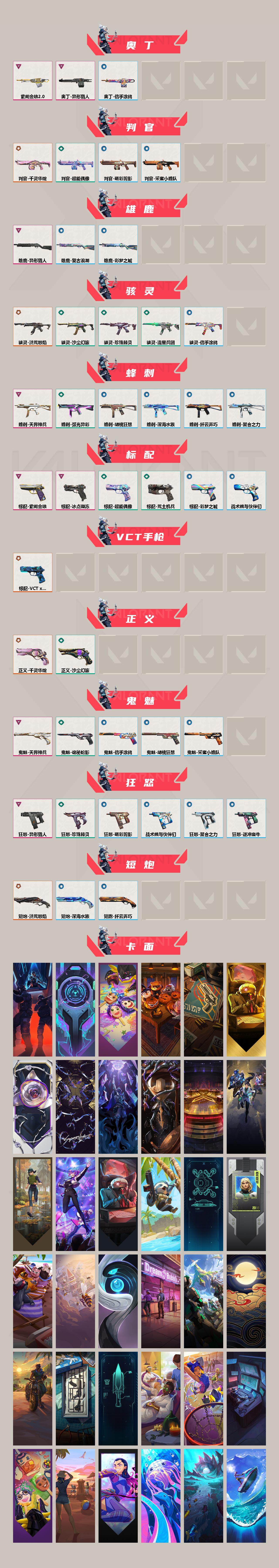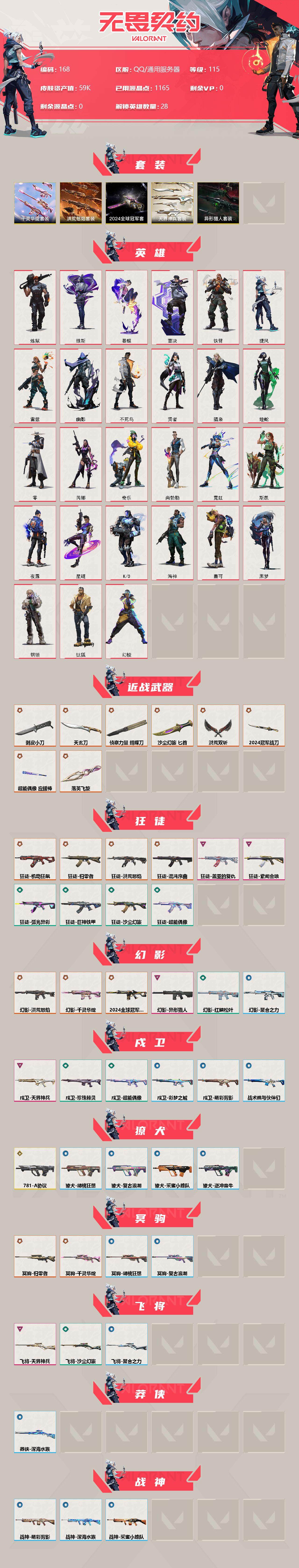 【168】【套装】:2024全球冠军赛套装,千灵华绽套装,洪荒怒焰套装,异形猎人套装,天界神兵套装 【英雄】:幻棱,炼狱,维斯,暮蝶,钛狐,壹决,铁臂,捷风,雷兹,幽影,不死鸟,贤者,猎枭,蝰蛇,零,芮娜,奇乐,尚勃勒,霓虹,斯凯,夜露,星礈,k/o,海神,盖可,黑梦,钢锁 【近战 武器】:近战武器-2024全球冠军赛 战刀,近战武器-侦察力量 蝴蝶刀,近战武器-剥皮小刀,近战武器-落英飞旋,近战武器-超能偶像 应援棒,近战武器-洪荒双斩,近战武器-沙尘幻旅 匕首,近战武器-天玄刀 【狂徒】:狂徒-归零者,狂徒-洪荒怒焰,狂徒-混沌序曲,狂徒-机动狂飙,狂徒-盖亚的复仇,狂徒-紫阙金琅,狂徒-超能偶像,狂徒-弧光异彩,狂徒-巨神铁甲,狂徒-沙尘幻旅 【幻影】:幻影-2024全球冠军赛,幻影-洪荒怒焰,幻影-千灵华绽,幻影-异形猎人,幻影-红鳞松叶,幻影-聚合之力 【戍卫】:戍卫-天界神兵,戍卫-超能偶像,戍卫-珍珠棘贝,戍卫-彩梦之城,戍卫-萌彩剪影,戍卫-战术熊与伙伴们 【獠犬】:獠犬-781-a协议,獠犬-采蜜小蜂队,獠犬-复古浪潮,獠犬-胡桃狂想,獠犬-逆冲蛮牛 【冥驹】:冥驹-归零者,冥驹-千灵华绽,冥驹-复古浪潮,冥驹-胡桃狂想 【飞将】:飞将-天界神兵,飞将-沙尘幻旅,飞将-聚合之力 【莽侠】:莽侠-深海水族 【战神】:战神-采蜜小蜂队,战神-萌彩剪影,战神-深海水族 【奥丁】:奥丁-异形猎人,奥丁-紫阙金琅//2.0,奥丁-信手涂鸦 【判官】:判官-千灵华绽,判官-超能偶像,判官-采蜜小蜂队,判官-萌彩剪影 【雄鹿】:雄鹿-异形猎人,雄鹿-彩梦之城,雄鹿-复古浪潮 【骇灵】:骇灵-洪荒怒焰,骇灵-流星兵团,骇灵-沙尘幻旅,骇灵-珍珠棘贝,骇灵-信手涂鸦 【蜂刺】:蜂刺-天界神兵,蜂刺-弧光异彩,蜂刺-胡桃狂想,蜂刺-聚合之力,蜂刺-深海水族,蜂刺-纤云弄巧 【标配】:标配-冰点凝冻,标配-紫阙金琅,标配-超能偶像,标配-荒土机兵,标配-彩梦之城,标配-战术熊与伙伴们 【vct手呛】:标配-vct x lev 【正义】:正义-千灵华绽,正义-沙尘幻旅 【鬼魅】:鬼魅-天界神兵,鬼魅-诡秘蛇影,鬼魅-采蜜小蜂队,鬼魅-胡桃狂想,鬼魅-信手涂鸦 【狂怒】:狂怒-异形猎人,狂怒-珍珠棘贝,狂怒-聚合之力,狂怒-萌彩剪影,狂怒-逆冲蛮牛,狂怒-战术熊与伙伴们 【短炮】:短炮-洪荒怒焰,短炮-深海水族,短炮-纤云弄巧 【卡面】:纳米打击 卡面,抑制技术 卡面,瓦娃脸雪糕 p2 卡面,南瓜盛典 卡面,正义的化身 卡面,终章:生意人麦宝 卡面,铁之华 卡面,2024全球冠军赛 卡面,失而复得 卡面,时间到 卡面,最高舞台 卡面,复活专家 卡面,归乡 // 蝰蛇 卡面,超能偶像 卡面,生意人麦宝 卡面,树懒大作战 卡面,声感陷阱设计图 卡面,钢锁工牌 卡面,战术小伙伴的夏日 卡面,采蜜小蜂队 卡面,聚合之力 卡面,梦幻奶茶 卡面,流星兵团 卡面,纤云弄巧 卡面,暂别喧嚣 卡面,打造专属狂徒 卡面,零点嗅探设计图 卡面,源能者美容 卡面,脚踝终结者 卡面 ,夜班 卡面,瓦娃脸雪糕 卡面 ,沙雕爆能器 卡面,无畏契约go!第一卷:芮娜 卡面,深海水族 卡面,珍珠棘贝 卡面,复古浪潮 卡面,盖可工牌 卡面,清除名单 卡面,无畏契约go!第一卷:零 卡面,终章:黑影先生的咖啡! 卡面,铁臂vs雷兹 卡面,纪念照 p2 卡面,一击全倒 卡面,黑影先生的咖啡! 卡面,天台狂欢 卡面,胡桃狂想 卡面,沙尘幻旅 卡面,壹决工牌 卡面,萌彩剪影 卡面,势不可挡//k/o 卡面,夯实根基 卡面,"luie" 卡面,热烈欢迎 卡面,铁臂设计图 卡面,代号红色 卡面,冰淇淋店 卡面,新兵报到 卡面,v契约 卡面,无畏契约 卡面 【喷漆】:独守蝰腹 喷漆,通缉:战术企鹅 喷漆,2024全球冠军赛 喷漆,又被闪了 喷漆,终极羞辱 喷漆,超级粉丝 喷漆,黯兽卖萌 喷漆,捷风差距 喷漆,惊声尖叫 喷漆,五人成星 喷漆,超能偶像 喷漆,放我出去 喷漆,掩护我 喷漆,大佬发呛 喷漆,边缘试探 喷漆,拼一呛 喷漆,聚合之力 喷漆,采蜜小蜂队 喷漆,梦幻小队 喷漆,五个全都齐了 喷漆,别挡我的路! 喷漆,我的刀呢? 喷漆,当然可以 喷漆,流星兵团 喷漆,战术熊与伙伴们 喷漆,禁止喷漆 喷漆,纤云弄巧 喷漆,uwu 喷漆,新潮流 喷漆,逮到一个 喷漆,一个人的孤岛 喷漆,双人比心 喷漆,不予置评 喷漆,三熊合一 喷漆,要喝完噢! 喷漆,双击点赞 喷漆,珍珠棘贝 喷漆,深海水族 喷漆,禁止标配 喷漆 ,铁臂尴尬 喷漆,买装还是存钱 喷漆,这招不行了 喷漆,真相只有一个 喷漆,自信满满 喷漆,凌空惊吓 喷漆,再吃最后一口 喷漆,我一个滑铲 喷漆,放手一搏 喷漆,沙尘幻旅 喷漆,萌彩剪影 喷漆,电烫 喷漆,暗中偷瞄 喷漆,胡桃狂想 喷漆,红牌退场 喷漆,爆泉领域 喷漆,老铁困了 喷漆,口袋贤者 喷漆,胜利属于无畏契约 喷漆,glhf 喷漆,无畏契约 喷漆 【挂饰】:v25第三幕:超凡 挂饰,第九季:超凡 挂饰,第七季:超凡 挂饰,水壶 挂饰,第九季//第三幕 纪念币 挂饰,第九季//第二幕 纪念币 挂饰,终章:这瓜保熟 挂饰,2024全球冠军赛 挂饰,炼狱雪糕 挂饰,糖葫芦 挂饰,袖珍捷风 挂饰,冲上云霄 挂饰,超能偶像 挂饰,迷你浓缩 挂饰,这瓜保熟 挂饰,采蜜小蜂队 挂饰,第九季//第一幕 纪念币 挂饰,聚合之力 挂饰,章鱼烧先生 挂饰,流星兵团 挂饰,云开见日 挂饰,第八季//第三幕 纪念币 挂饰,复古浪潮 挂饰,深海水母 挂饰,传世莲华 挂饰,扭结饼干 挂饰 ,珍珠棘贝 挂饰,深海水族 挂饰 ,第八季//第二幕 纪念币 挂饰 ,天外飞客 挂饰,终章:高音谱号 挂饰,再烧一会 挂饰,彩糖面包 挂饰,萌彩剪影 挂饰,针织蜜蜂 挂饰,高音谱号 挂饰,沙尘幻旅 挂饰,