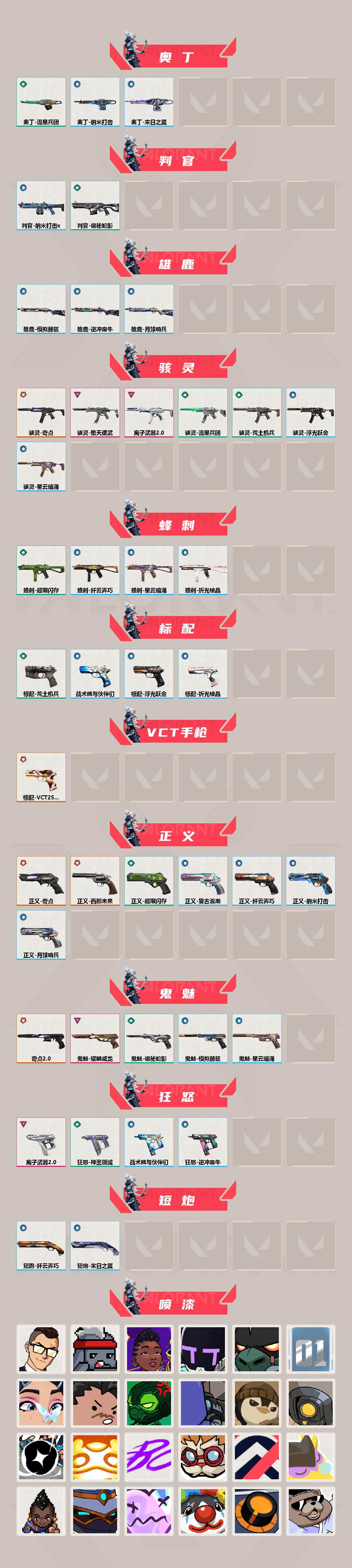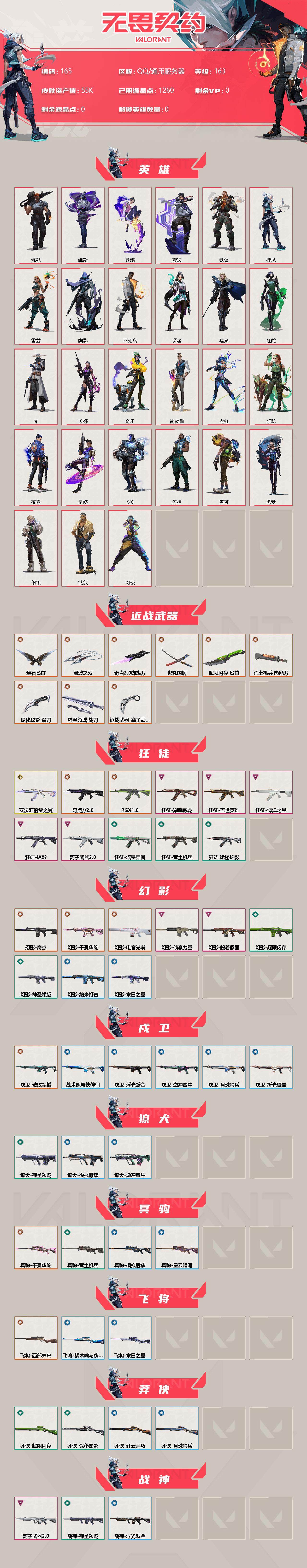 【165】【套装】:奇点//2.0套装,回火礼包:奇点套装,离子武器//2.0套装 【英雄】:幻棱,炼狱,维斯,暮蝶,钛狐,壹决,铁臂,捷风,雷兹,幽影,不死鸟,贤者,猎枭,蝰蛇,零,芮娜,奇乐,尚勃勒,霓虹,斯凯,夜露,星礈,k/o,海神,盖可,黑梦,钢锁 【近战 武器】:近战武器-奇点//2.0 蝴蝶刀,近战武器-黑波之刃,近战武器-鬼丸国纲,近战武器-离子武器//2.0 爪刀,近战武器-超限闪存 匕首,近战武器-荒土机兵 热能刀,近战武器-圣石匕首,近战武器-诡秘蛇影 军刀,近战武器-神圣领域 战刀 【狂徒】:狂徒-艾沃莉的梦之翼,狂徒-奇点//2.0,狂徒-rgx 11z pro,狂徒-掠影,狂徒-盖世英雄,狂徒-海洋之星,狂徒-耀鳞威龙,狂徒-离子武器//2.0,狂徒-荒土机兵,狂徒-流星兵团,狂徒-诡秘蛇影 【幻影】:幻影-奇点,幻影-千灵华绽,幻影-电音光谱,幻影-般若假面,幻影-侦察力量,幻影-超限闪存,幻影-神圣领域,幻影-纳米打击,幻影-末日之翼,幻影-电音光谱 【戍卫】:戍卫-破败军械,戍卫-浮光跃金,戍卫-逆冲蛮牛,戍卫-战术熊与伙伴们,戍卫-月球哨兵,戍卫-折光棱晶 【獠犬】:獠犬-神圣领域,獠犬-模拟赫兹,獠犬-逆冲蛮牛 【冥驹】:冥驹-千灵华绽,冥驹-荒土机兵,冥驹-模拟赫兹,冥驹-星云暗涌 【飞将】:飞将-西部未来,飞将-战术熊与伙伴们,飞将-末日之翼 【莽侠】:莽侠-超限闪存,莽侠-诡秘蛇影,莽侠-纤云弄巧,莽侠-月球哨兵 【战神】:战神-离子武器//2.0,战神-神圣领域,战神-浮光跃金 【奥丁】:奥丁-流星兵团,奥丁-纳米打击,奥丁-末日之翼 【判官】:判官-诡秘蛇影,判官-纳米打击x 【雄鹿】:雄鹿-模拟赫兹,雄鹿-逆冲蛮牛,雄鹿-月球哨兵 【骇灵】:骇灵-奇点,骇灵-堕天遗武,骇灵-离子武器//2.0,骇灵-荒土机兵,骇灵-流星兵团,骇灵-浮光跃金,骇灵-星云暗涌 【蜂刺】:蜂刺-超限闪存,蜂刺-纤云弄巧,蜂刺-星云暗涌,蜂刺-折光棱晶 【标配】:标配-荒土机兵,标配-浮光跃金,标配-战术熊与伙伴们,标配-折光棱晶 【vct手呛】:标配-vct25 x edg 【正义】:正义-奇点,正义-西部未来,正义-超限闪存,正义-复古浪潮,正义-纳米打击,正义-纤云弄巧,正义-月球哨兵 【鬼魅】:鬼魅-奇点//2.0,鬼魅-耀鳞威龙,鬼魅-诡秘蛇影,鬼魅-模拟赫兹,鬼魅-星云暗涌 【狂怒】:狂怒-离子武器//2.0,狂怒-神圣领域,狂怒-逆冲蛮牛,狂怒-战术熊与伙伴们 【短炮】:短炮-纤云弄巧,短炮-末日之翼 【卡面】:终章:激斗汉堡 卡面,进入射程 卡面,分崩离析 卡面,纳米打击 卡面,抑制技术 卡面,激斗汉堡 卡面,瓦娃脸雪糕 p2 卡面,从黄昏到黎明 卡面,荒土机兵 卡面,银弹猎手 卡面,逆冲蛮牛 卡面,《双城之战》拥抱 卡面,精灵大战 卡面,欢迎来到底城 卡面,南瓜盛典 卡面,vct cn首冠 卡面,唱片的故事 卡面,钢弓与箭弦 卡面,无畏契约:暮蝶 卡面,排除故障 卡面,奇点//2.0 卡面,战术桌游 卡面,悠享食光 卡面,修车达人 卡面,热舞环节 卡面,模拟赫兹 卡面,浮光跃金 卡面,超限闪存 卡面,维斯工牌 卡面,正义的化身 卡面,铁之华 卡面,时间到 卡面,最高舞台 卡面,音熊登场 卡面,声感陷阱设计图 卡面,红鳞松叶 卡面,clutch 卡面,梦幻奶茶 卡面,失控边缘 卡面,哨卫者之领域 卡面,暮蝶工牌 卡面,战术熊与伙伴们 卡面,源能反应 卡面,流星兵团 卡面,纤云弄巧 卡面,暂别喧嚣 卡面,打造专属狂徒 卡面,零点嗅探设计图 卡面,表象之下 卡面,沙雕爆能器 卡面,无畏契约go!第一卷:芮娜 卡面,清除名单 卡面,无畏契约go!第一卷:零 卡面,无垠星环 卡面,先瓦为敬 绿色 卡面,《双城之战》金克丝 卡面,无畏契约go!第一卷:贤者 卡面,钢锁vs盖可 卡面,别冒尖 卡面,代号红色 卡面,新兵报到 卡面,v契约 卡面,无畏契约 卡面 【喷漆】:小小心意 喷漆,战“素”兔 喷漆,宇宙的指引 喷漆,请求重启 喷漆,逆冲蛮牛 喷漆,纳米打击 喷漆,鼻尖上的蝴蝶 喷漆,简笔画黯兽 喷漆,独守蝰腹 喷漆,他们将落荒而逃 喷漆,通缉:战术企鹅 喷漆,荒土机兵 喷漆,别挡我吃球! 喷漆,嗨宝南瓜灯 喷漆,嘭! 喷漆,都算到了 喷漆,控场勿近 喷漆,皮蛋呼呼 喷漆,像素星礈 喷漆,图谋不轨的零 喷漆,伤心心 喷漆,小丑猫 喷漆,模拟赫兹 喷漆,高丽风情小熊 喷漆,奇点//2.0 喷漆,蹲到一个 喷漆,全力集中 喷漆,超限闪存 喷漆,rua一下 喷漆,熊抱 喷漆,蛋糕还是爆能器? 喷漆,高丽风情小虎 喷漆,记在小本本 喷漆,防弹企鹅 喷漆,高丽风情小蛙 喷漆,超级粉丝 喷漆,捷风差距 喷漆,惊声尖叫 喷漆,战术熊的巴拉莱卡琴 喷漆,拼一呛 喷漆,开心到爆炸 喷漆,皮蛋萌舞 喷漆,我觉得不行 喷漆,头号粉丝 喷漆,吸一口快乐 喷漆,永远的答案 喷漆,再来一次? 喷漆,别挡我的路! 喷漆,我的刀呢? 喷漆,当然可以 喷漆,流星兵团 喷漆,战术熊与伙伴们 喷漆,禁止喷漆 喷漆,纤云弄巧 喷漆,uwu 喷漆,新潮流 喷漆,双击点赞 喷漆,买装还是存钱 喷漆,无畏契约go!第一卷:芮娜 喷漆,胜利属于无畏契约 喷漆,glhf 喷漆,无畏契约 喷漆 【挂饰】:终章:猫猫木乃伊 挂饰,荒土机兵 挂饰,悠闲鸡块 挂饰,猫猫木乃伊 挂饰,水壶 挂饰,纳米打击 挂饰,逆冲蛮牛 挂饰,可爱糖糖 挂饰,伞绳 挂饰,《双城之战》小蛋糕 挂饰,第九季//第三幕 纪念币 挂饰,拳击战术熊 挂饰,工具腰带 挂饰,无畏契约go!第一卷 芮娜 挂饰,无畏契约go!第一卷 零 挂饰,暗藏猫腻 挂饰,高丽风情 挂饰,奇点//2.0 挂饰,熔岩灯 挂饰,超限闪存 挂饰,瞬云履 挂饰,迷你k/o 挂饰,模拟赫兹 挂饰,第九季//第二幕 纪念币 挂饰,袖珍捷风 挂饰,丢麦 挂饰,