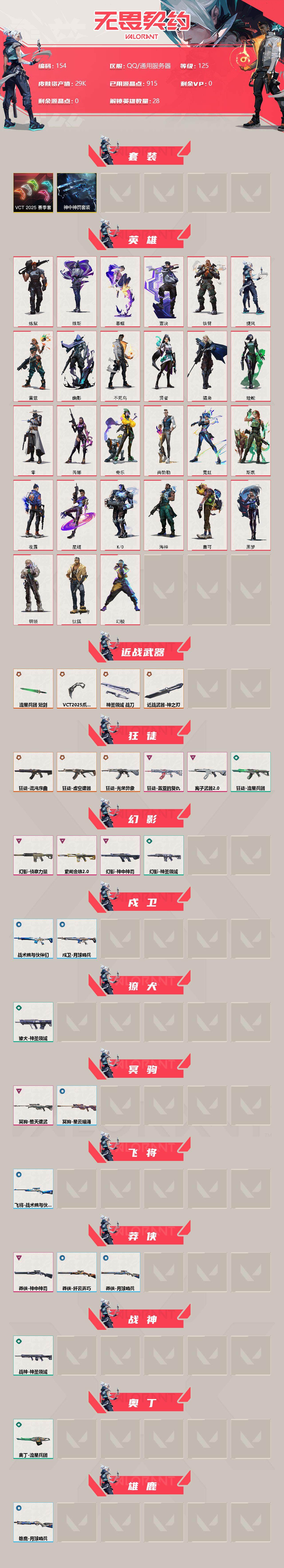 【154】【套装】:vct 2025 赛季套装,神中神罚套装 【英雄】:幻棱,炼狱,维斯,暮蝶,钛狐,壹决,铁臂,捷风,雷兹,幽影,不死鸟,贤者,猎枭,蝰蛇,零,芮娜,奇乐,尚勃勒,霓虹,斯凯,夜露,星礈,k/o,海神,盖可,黑梦,钢锁 【近战 武器】:近战武器-神之刃,近战武器-vct 2025 爪刀,近战武器-流星兵团 短剑,近战武器-神圣领域 战刀 【狂徒】:狂徒-混沌序曲,狂徒-虚空遗器,狂徒-光荣异象,狂徒-盖亚的复仇,狂徒-离子武器//2.0,狂徒-流星兵团 【幻影】:幻影-侦察力量,幻影-紫阙金琅//2.0,幻影-神中神罚,幻影-神圣领域 【戍卫】:戍卫-战术熊与伙伴们,戍卫-月球哨兵 【獠犬】:獠犬-神圣领域 【冥驹】:冥驹-堕天遗武,冥驹-星云暗涌 【飞将】:飞将-战术熊与伙伴们 【莽侠】:莽侠-神中神罚,莽侠-纤云弄巧,莽侠-月球哨兵 【战神】:战神-神圣领域 【奥丁】:奥丁-流星兵团 【雄鹿】:雄鹿-月球哨兵 【骇灵】:骇灵-神中神罚,骇灵-流星兵团,骇灵-星云暗涌 【蜂刺】:蜂刺-纤云弄巧,蜂刺-星云暗涌 【标配】:标配-电音光谱,标配-超能偶像,标配-战术熊与伙伴们,标配-电音光谱 【vct手呛】:标配-vct25 x edg 【正义】:正义-西部未来,正义-纤云弄巧,正义-月球哨兵 【鬼魅】:鬼魅-天界神兵,鬼魅-流星兵团,鬼魅-诡秘蛇影,鬼魅-星云暗涌 【狂怒】:狂怒-神中神罚,狂怒-神圣领域,狂怒-战术熊与伙伴们 【短炮】:短炮-纤云弄巧 【卡面】:《双城之战》拥抱 卡面,精灵大战 卡面,欢迎来到底城 卡面,南瓜盛典 卡面,vct cn首冠 卡面,修车达人 卡面,热舞环节 卡面,正义的化身 卡面,终章:生意人麦宝 卡面,铁之华 卡面,时间到 卡面,最高舞台 卡面,声感陷阱设计图 卡面,梦幻奶茶 卡面,终章:打造专属狂徒 卡面,趁热吃 卡面,西装暴徒 卡面,失控边缘 卡面,哨卫者之领域 卡面,暮蝶工牌 卡面,战术熊与伙伴们 卡面,源能反应 卡面,流星兵团 卡面,纤云弄巧 卡面,暂别喧嚣 卡面,打造专属狂徒 卡面,零点嗅探设计图 卡面,无畏契约go!第一卷:芮娜 卡面,无畏契约go!第一卷:零 卡面,比比看谁快? 卡面,无畏契约go!第一卷:贤者 卡面,代号红色 卡面,新兵报到 卡面,v契约 卡面,无畏契约 卡面 【喷漆】:嘭! 喷漆,都算到了 喷漆,控场勿近 喷漆,熊抱 喷漆,蛋糕还是爆能器? 喷漆,超级粉丝 喷漆,捷风差距 喷漆,惊声尖叫 喷漆,2021冠军巡回赛花火 喷漆,拼一呛 喷漆,加油!加油! 喷漆,开心到爆炸 喷漆,皮蛋萌舞 喷漆,我觉得不行 喷漆,头号粉丝 喷漆,吸一口快乐 喷漆,永远的答案 喷漆,再来一次? 喷漆,别挡我的路! 喷漆,我的刀呢? 喷漆,当然可以 喷漆,流星兵团 喷漆,战术熊与伙伴们 喷漆,禁止喷漆 喷漆,纤云弄巧 喷漆,双人比心 喷漆,买装还是存钱 喷漆,酷熊冲浪 喷漆,胜利属于无畏契约 喷漆,glhf 喷漆,无畏契约 喷漆 【挂饰】:《双城之战》小蛋糕 挂饰,第九季//第三幕 纪念币 挂饰,瞬云履 挂饰,第九季//第二幕 纪念币 挂饰,薰衣草之心 挂饰,终章:这瓜保熟 挂饰,糖葫芦 挂饰,袖珍捷风 挂饰,迷你浓缩 挂饰,z世代特饮 挂饰,第九季//第一幕 纪念币 挂饰,终章:迷你机甲 挂饰,犯困的布鲁诺 挂饰,战术河童 挂饰,招财猫熊 挂饰,迷你机甲 挂饰,荧光棒 挂饰,vct x edg 挂饰,章鱼烧先生 挂饰,流星兵团 挂饰,云开见日 挂饰,第八季//第三幕 纪念币 挂饰,天外飞客 挂饰,好运福爪 挂饰,《双城之战》魄罗 挂饰,无畏契约 纪念币 挂饰