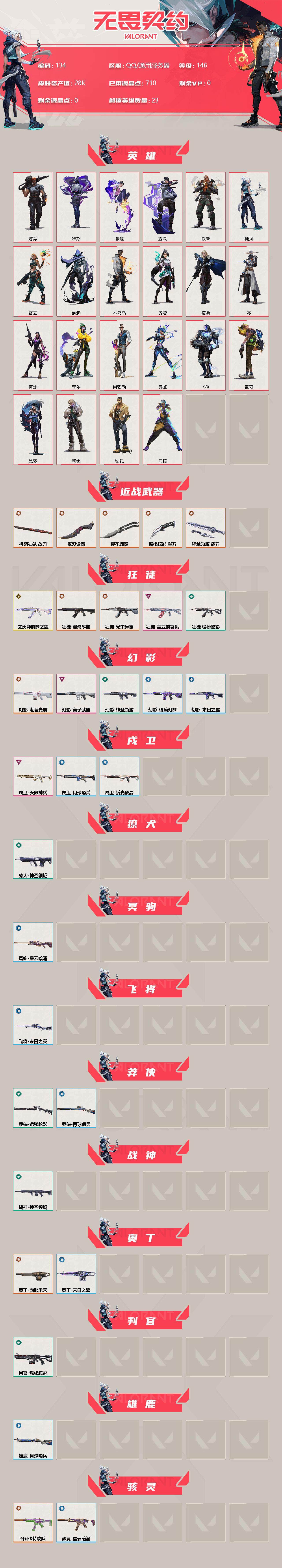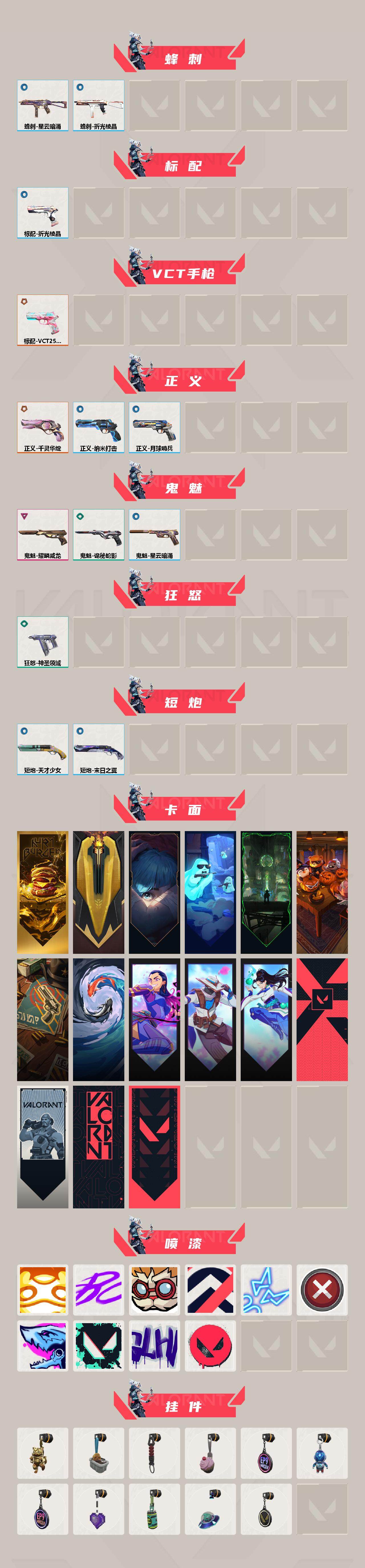 【134】【英雄】:幻棱,炼狱,维斯,暮蝶,钛狐,壹决,铁臂,捷风,雷兹,幽影,不死鸟,贤者,猎枭,零,芮娜,奇乐,尚勃勒,霓虹,k/o,盖可,黑梦,钢锁 【近战 武器】:近战武器-穿花蝴蝶,近战武器-机动狂飙 战刀,近战武器-夜刃诡镰,近战武器-诡秘蛇影 军刀,近战武器-神圣领域 战刀 【狂徒】:狂徒-艾沃莉的梦之翼,狂徒-混沌序曲,狂徒-光荣异象,狂徒-盖亚的复仇,狂徒-诡秘蛇影 【幻影】:幻影-电音光谱,幻影-离子武器,幻影-神圣领域,幻影-琉璃幻梦,幻影-末日之翼,幻影-电音光谱 【戍卫】:戍卫-天界神兵,戍卫-月球哨兵,戍卫-折光棱晶 【獠犬】:獠犬-神圣领域 【冥驹】:冥驹-星云暗涌 【飞将】:飞将-末日之翼 【莽侠】:莽侠-诡秘蛇影,莽侠-月球哨兵 【战神】:战神-神圣领域 【奥丁】:奥丁-西部未来,奥丁-末日之翼 【判官】:判官-诡秘蛇影 【雄鹿】:雄鹿-月球哨兵 【骇灵】:骇灵-砰砰x特攻队,骇灵-星云暗涌 【蜂刺】:蜂刺-星云暗涌,蜂刺-折光棱晶 【标配】:标配-折光棱晶 【vct手呛】:标配-vct25 x blg 【正义】:正义-千灵华绽,正义-纳米打击,正义-月球哨兵 【鬼魅】:鬼魅-耀鳞威龙,鬼魅-诡秘蛇影,鬼魅-星云暗涌 【狂怒】:狂怒-神圣领域 【短炮】:短炮-天才少女,短炮-末日之翼 【卡面】:终章:激斗汉堡 卡面,进入射程 卡面,《双城之战》拥抱 卡面,精灵大战 卡面,欢迎来到底城 卡面,南瓜盛典 卡面,正义的化身 卡面,红鳞松叶 卡面,无畏契约go!第一卷:芮娜 卡面,无畏契约go!第一卷:零 卡面,无畏契约go!第一卷:贤者 卡面,代号红色 卡面,新兵报到 卡面,v契约 卡面,无畏契约 卡面 【喷漆】:嗨宝南瓜灯 喷漆,嘭! 喷漆,都算到了 喷漆,控场勿近 喷漆,霓光四射 喷漆,买装还是存钱 喷漆,暴走萝莉 喷漆,胜利属于无畏契约 喷漆,glhf 喷漆,无畏契约 喷漆 【挂饰】:终章:猫猫木乃伊 挂饰,悠闲鸡块 挂饰,伞绳 挂饰,《双城之战》小蛋糕 挂饰,第九季//第三幕 纪念币 挂饰,迷你k/o 挂饰,第九季//第二幕 纪念币 挂饰,薰衣草之心 挂饰,z世代特饮 挂饰,天外飞客 挂饰,无畏契约 纪念币 挂饰