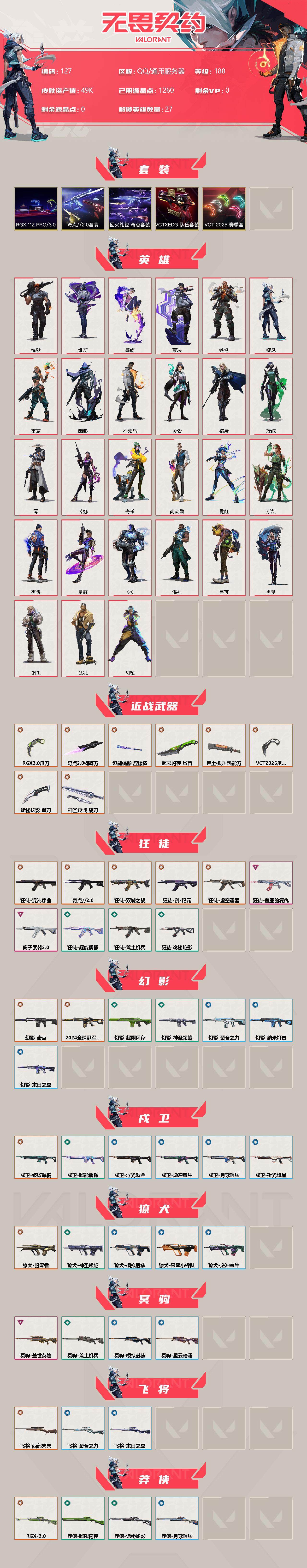 【127】【套装】:vct 2025 赛季套装,rgx 11z pro//3.0套装,奇点//2.0套装,vctxedg 队伍套装,回火礼包:奇点套装 【英雄】:幻棱,炼狱,维斯,暮蝶,钛狐,壹决,铁臂,捷风,雷兹,幽影,不死鸟,贤者,猎枭,蝰蛇,零,芮娜,奇乐,尚勃勒,霓虹,斯凯,夜露,星礈,k/o,海神,盖可,黑梦,钢锁 【近战 武器】:近战武器-奇点//2.0 蝴蝶刀,近战武器-vct 2025 爪刀,近战武器-rgx 11z pro//3.0 爪刀,近战武器-超能偶像 应援棒,近战武器-超限闪存 匕首,近战武器-荒土机兵 热能刀,近战武器-诡秘蛇影 军刀,近战武器-神圣领域 战刀 【狂徒】:狂徒-混沌序曲,狂徒-奇点//2.0,狂徒-双城之战,狂徒-创·纪元,狂徒-虚空遗器,狂徒-盖亚的复仇,狂徒-离子武器//2.0,狂徒-超能偶像,狂徒-荒土机兵,狂徒-诡秘蛇影 【幻影】:幻影-2024全球冠军赛,幻影-奇点,幻影-超限闪存,幻影-神圣领域,幻影-聚合之力,幻影-纳米打击,幻影-末日之翼 【戍卫】:戍卫-破败军械,戍卫-超能偶像,戍卫-浮光跃金,戍卫-逆冲蛮牛,戍卫-月球哨兵,戍卫-折光棱晶 【獠犬】:獠犬-归零者,獠犬-神圣领域,獠犬-采蜜小蜂队,獠犬-模拟赫兹,獠犬-逆冲蛮牛 【冥驹】:冥驹-盖世英雄,冥驹-荒土机兵,冥驹-模拟赫兹,冥驹-星云暗涌 【飞将】:飞将-西部未来,飞将-聚合之力,飞将-末日之翼 【莽侠】:莽侠-rgx 11z pro//3.0,莽侠-超限闪存,莽侠-诡秘蛇影,莽侠-月球哨兵 【战神】:战神-神圣领域,战神-采蜜小蜂队,战神-浮光跃金 【奥丁】:奥丁-纳米打击,奥丁-末日之翼 【判官】:判官-天界神兵//2.0,判官-超能偶像,判官-诡秘蛇影,判官-采蜜小蜂队,判官-纳米打击x 【雄鹿】:雄鹿-盖亚的复仇//2.0,雄鹿-起源,雄鹿-模拟赫兹,雄鹿-逆冲蛮牛,雄鹿-月球哨兵 【骇灵】:骇灵-奇点,骇灵-荒土机兵,骇灵-浮光跃金,骇灵-星云暗涌 【蜂刺】:蜂刺-混沌序曲,蜂刺-超限闪存,蜂刺-聚合之力,蜂刺-星云暗涌,蜂刺-折光棱晶 【标配】:标配-超能偶像,标配-荒土机兵,标配-浮光跃金,标配-折光棱晶 【vct手呛】:标配-vct x edg,标配-vct25 x edg 【正义】:正义-rgx 11z pro//3.0,正义-奇点,正义-西部未来,正义-超限闪存,正义-纳米打击,正义-月球哨兵 【鬼魅】:鬼魅-奇点//2.0,鬼魅-盖亚的复仇,鬼魅-诡秘蛇影,鬼魅-采蜜小蜂队,鬼魅-模拟赫兹,鬼魅-星云暗涌 【狂怒】:狂怒-神圣领域,狂怒-聚合之力,狂怒-逆冲蛮牛 【短炮】:短炮-末日之翼 【卡面】:终章:激斗汉堡 卡面,进入射程 卡面,分崩离析 卡面,纳米打击 卡面,抑制技术 卡面,激斗汉堡 卡面,瓦娃脸雪糕 p2 卡面,从黄昏到黎明 卡面,荒土机兵 卡面,银弹猎手 卡面,逆冲蛮牛 卡面,《双城之战》拥抱 卡面,精灵大战 卡面,欢迎来到底城 卡面,南瓜盛典 卡面,vct cn首冠 卡面,唱片的故事 卡面,钢弓与箭弦 卡面,排除故障 卡面,奇点//2.0 卡面,战术桌游 卡面,悠享食光 卡面,修车达人 卡面,热舞环节 卡面,模拟赫兹 卡面,浮光跃金 卡面,超限闪存 卡面,维斯工牌 卡面,正义的化身 卡面,终章:生意人麦宝 卡面,铁之华 卡面,失而复得 卡面,时间到 卡面,最高舞台 卡面,复活专家 卡面,归乡 // 蝰蛇 卡面,rgx 11z pro//3.0 卡面,超能偶像 卡面,生意人麦宝 卡面,音熊登场 卡面,声感陷阱设计图 卡面,红鳞松叶 卡面,霓帧牛蛙 卡面,钢锁工牌 卡面,战术小伙伴的夏日 卡面,采蜜小蜂队 卡面,聚合之力 卡面,梦幻奶茶 卡面,无畏契约:尚勃勒 卡面,无畏契约go!第一卷:芮娜 卡面,清除名单 卡面,无畏契约go!第一卷:零 卡面,龍记 卡面,无垠星环 卡面,完美调谐 卡面 ,暗呛 卡面,钢锁vs盖可 卡面,"luie" 卡面,代号红色 卡面,冰淇淋店 卡面,新兵报到 卡面,v契约 卡面,无畏契约 卡面 【喷漆】:小小心意 喷漆,战“素”兔 喷漆,宇宙的指引 喷漆,请求重启 喷漆,逆冲蛮牛 喷漆,纳米打击 喷漆,鼻尖上的蝴蝶 喷漆,简笔画黯兽 喷漆,独守蝰腹 喷漆,他们将落荒而逃 喷漆,通缉:战术企鹅 喷漆,荒土机兵 喷漆,别挡我吃球! 喷漆,嗨宝南瓜灯 喷漆,嘭! 喷漆,都算到了 喷漆,控场勿近 喷漆,皮蛋呼呼 喷漆,像素星礈 喷漆,图谋不轨的零 喷漆,小丑猫 喷漆,模拟赫兹 喷漆,高丽风情小熊 喷漆,奇点//2.0 喷漆,蹲到一个 喷漆,全力集中 喷漆,超限闪存 喷漆,rua一下 喷漆,熊抱 喷漆,蛋糕还是爆能器? 喷漆,高丽风情小虎 喷漆,记在小本本 喷漆,防弹企鹅 喷漆,高丽风情小蛙 喷漆,又被闪了 喷漆,终极羞辱 喷漆,超级粉丝 喷漆,黯兽卖萌 喷漆,捷风差距 喷漆,惊声尖叫 喷漆,2021冠军巡回赛花火 喷漆,五人成星 喷漆,超能偶像 喷漆,rgx 11z pro//3.0 喷漆,放我出去 喷漆,战术熊的巴拉莱卡琴 喷漆,审判之爪 喷漆,掩护我 喷漆,大佬发呛 喷漆,边缘试探 喷漆,拼一呛 喷漆,聚合之力 喷漆,采蜜小蜂队 喷漆,梦幻小队 喷漆,五个全都齐了 喷漆,分身有术 喷漆,致命优雅 喷漆,uwu 喷漆,买装还是存钱 喷漆,醒狮贺春 喷漆,蕊形灯 喷漆,胜利属于无畏契约 喷漆,glhf 喷漆,无畏契约 喷漆 【挂饰】:终章:猫猫木乃伊 挂饰,荒土机兵 挂饰,悠闲鸡块 挂饰,猫猫木乃伊 挂饰,水壶 挂饰,纳米打击 挂饰,逆冲蛮牛 挂饰,可爱糖糖 挂饰,伞绳 挂饰,《双城之战》小蛋糕 挂饰,第九季//第三幕 纪念币 挂饰,拳击战术熊 挂饰,工具腰带 挂饰,无畏契约go!第一卷 芮娜 挂饰,无畏契约go!第一卷 零 挂饰,暗藏猫腻 挂饰,高丽风情 挂饰,奇点//2.0 挂饰,熔岩灯 挂饰,超限闪存 挂饰,瞬云履 挂饰,迷你k/o 挂饰,模拟赫兹 挂饰,第九季//第二幕 纪念币 挂饰,终章:这瓜保熟 挂饰,炼狱雪糕 挂饰,糖葫芦 挂饰,袖珍