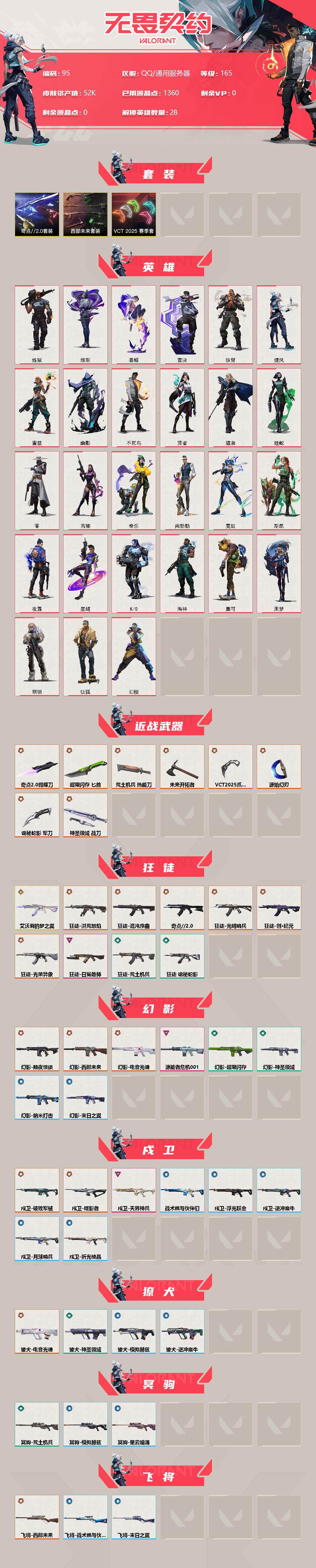 【95】【套装】:vct 2025 赛季套装,西部未来套装,奇点//2.0套装 【英雄】:幻棱,炼狱,维斯,暮蝶,钛狐,壹决,铁臂,捷风,雷兹,幽影,不死鸟,贤者,猎枭,蝰蛇,零,芮娜,奇乐,尚勃勒,霓虹,斯凯,夜露,星礈,k/o,海神,盖可,黑梦,钢锁 【近战 武器】:近战武器-奇点//2.0 蝴蝶刀,近战武器-vct 2025 爪刀,近战武器-源始幻刃,近战武器-未来开拓者,近战武器-超限闪存 匕首,近战武器-荒土机兵 热能刀,近战武器-诡秘蛇影 军刀,近战武器-神圣领域 战刀 【狂徒】:狂徒-艾沃莉的梦之翼,狂徒-光明哨兵,狂徒-洪荒怒焰,狂徒-混沌序曲,狂徒-奇点//2.0,狂徒-创·纪元,狂徒-光荣异象,狂徒-日冕雄师,狂徒-荒土机兵,狂徒-诡秘蛇影 【幻影】:幻影-黯夜怪谈,幻影-西部未来,幻影-电音光谱,幻影-源能者危机001,幻影-超限闪存,幻影-神圣领域,幻影-纳米打击,幻影-末日之翼,幻影-西部未来,幻影-电音光谱 【戍卫】:戍卫-破败军械,戍卫-噬影者,戍卫-天界神兵,戍卫-浮光跃金,戍卫-逆冲蛮牛,戍卫-战术熊与伙伴们,戍卫-月球哨兵,戍卫-折光棱晶 【獠犬】:獠犬-电音光谱,獠犬-神圣领域,獠犬-模拟赫兹,獠犬-逆冲蛮牛,獠犬-电音光谱 【冥驹】:冥驹-荒土机兵,冥驹-模拟赫兹,冥驹-星云暗涌 【飞将】:飞将-西部未来,飞将-战术熊与伙伴们,飞将-末日之翼 【莽侠】:莽侠-神中神罚,莽侠-超限闪存,莽侠-诡秘蛇影,莽侠-纤云弄巧,莽侠-月球哨兵 【战神】:战神-神圣领域,战神-浮光跃金 【奥丁】:奥丁-西部未来,奥丁-流星兵团,奥丁-纳米打击,奥丁-末日之翼 【判官】:判官-诡秘蛇影,判官-纳米打击x 【雄鹿】:雄鹿-模拟赫兹,雄鹿-逆冲蛮牛,雄鹿-月球哨兵 【骇灵】:骇灵-艾沃莉的梦之翼,骇灵-荒土机兵,骇灵-流星兵团,骇灵-浮光跃金,骇灵-星云暗涌 【蜂刺】:蜂刺-超限闪存,蜂刺-纤云弄巧,蜂刺-星云暗涌,蜂刺-折光棱晶 【标配】:标配-源能者危机001,标配-荒土机兵,标配-浮光跃金,标配-战术熊与伙伴们,标配-折光棱晶 【vct手呛】:标配-vct25 x blg 【正义】:正义-奇点,正义-西部未来,正义-超限闪存,正义-复古浪潮,正义-纳米打击,正义-纤云弄巧,正义-月球哨兵 【鬼魅】:鬼魅-奇点//2.0,鬼魅-诡秘蛇影,鬼魅-模拟赫兹,鬼魅-星云暗涌 【狂怒】:狂怒-神圣领域,狂怒-逆冲蛮牛,狂怒-战术熊与伙伴们 【短炮】:短炮-纤云弄巧,短炮-末日之翼 【卡面】:终章:激斗汉堡 卡面,进入射程 卡面,分崩离析 卡面,纳米打击 卡面,抑制技术 卡面,激斗汉堡 卡面,瓦娃脸雪糕 p2 卡面,从黄昏到黎明 卡面,荒土机兵 卡面,银弹猎手 卡面,逆冲蛮牛 卡面,《双城之战》拥抱 卡面,精灵大战 卡面,欢迎来到底城 卡面,南瓜盛典 卡面,vct cn首冠 卡面,唱片的故事 卡面,钢弓与箭弦 卡面,排除故障 卡面,奇点//2.0 卡面,战术桌游 卡面,悠享食光 卡面,修车达人 卡面,热舞环节 卡面,模拟赫兹 卡面,浮光跃金 卡面,超限闪存 卡面,维斯工牌 卡面,正义的化身 卡面,铁之华 卡面,最高舞台 卡面,声感陷阱设计图 卡面,clutch 卡面,霓帧牛蛙 卡面,梦幻奶茶 卡面,失控边缘 卡面,哨卫者之领域 卡面,无畏契约:尚勃勒 卡面,暮蝶工牌 卡面,战术熊与伙伴们 卡面,源能反应 卡面,流星兵团 卡面,纤云弄巧 卡面,暂别喧嚣 卡面,打造专属狂徒 卡面,零点嗅探设计图 卡面,表象之下 卡面,沙雕爆能器 卡面,无畏契约go!第一卷:芮娜 卡面,清除名单 卡面,无畏契约go!第一卷:零 卡面,龍记 卡面,《双城之战》金克丝 卡面,完美调谐 卡面 ,暗呛 卡面,无畏契约go!第一卷:贤者 卡面,钢锁vs盖可 卡面,胡桃狂想 卡面,夯实根基 卡面,铁臂设计图 卡面,代号红色 卡面,冰淇淋店 卡面,新兵报到 卡面,友军火力 卡面,v契约 卡面,无畏契约 卡面 【喷漆】:小小心意 喷漆,战“素”兔 喷漆,宇宙的指引 喷漆,请求重启 喷漆,逆冲蛮牛 喷漆,纳米打击 喷漆,鼻尖上的蝴蝶 喷漆,简笔画黯兽 喷漆,独守蝰腹 喷漆,他们将落荒而逃 喷漆,通缉:战术企鹅 喷漆,荒土机兵 喷漆,别挡我吃球! 喷漆,嗨宝南瓜灯 喷漆,嘭! 喷漆,都算到了 喷漆,控场勿近 喷漆,皮蛋呼呼 喷漆,像素星礈 喷漆,图谋不轨的零 喷漆,小丑猫 喷漆,模拟赫兹 喷漆,高丽风情小熊 喷漆,奇点//2.0 喷漆,蹲到一个 喷漆,全力集中 喷漆,超限闪存 喷漆,rua一下 喷漆,熊抱 喷漆,蛋糕还是爆能器? 喷漆,高丽风情小虎 喷漆,记在小本本 喷漆,防弹企鹅 喷漆,高丽风情小蛙 喷漆,超级粉丝 喷漆,捷风差距 喷漆,审判之爪 喷漆,拼一呛 喷漆,皮蛋萌舞 喷漆,分身有术 喷漆,我觉得不行 喷漆,头号粉丝 喷漆,致命优雅 喷漆,吸一口快乐 喷漆,永远的答案 喷漆,再来一次? 喷漆,别挡我的路! 喷漆,我的刀呢? 喷漆,当然可以 喷漆,流星兵团 喷漆,战术熊与伙伴们 喷漆,禁止喷漆 喷漆,纤云弄巧 喷漆,哨卫滑步 喷漆,uwu 喷漆,新潮流 喷漆,双击点赞 喷漆,买装还是存钱 喷漆,醒狮贺春 喷漆,酷熊冲浪 喷漆,无畏契约go!第一卷:芮娜 喷漆,红鳞 喷漆,松叶 喷漆,旅行小熊 喷漆,蕊形灯 喷漆,口袋贤者 喷漆,胜利属于无畏契约 喷漆,glhf 喷漆,无畏契约 喷漆 【挂饰】:终章:猫猫木乃伊 挂饰,荒土机兵 挂饰,悠闲鸡块 挂饰,猫猫木乃伊 挂饰,水壶 挂饰,纳米打击 挂饰,逆冲蛮牛 挂饰,可爱糖糖 挂饰,伞绳 挂饰,《双城之战》小蛋糕 挂饰,第九季//第三幕 纪念币 挂饰,拳击战术熊 挂饰,工具腰带 挂饰,无畏契约go!第一卷 芮娜 挂饰,无畏契约go!第一卷 零 挂饰,暗藏猫腻 挂饰,高丽风情 挂饰,奇点//2.0 挂饰,鱼骨头 挂饰,熔岩灯 