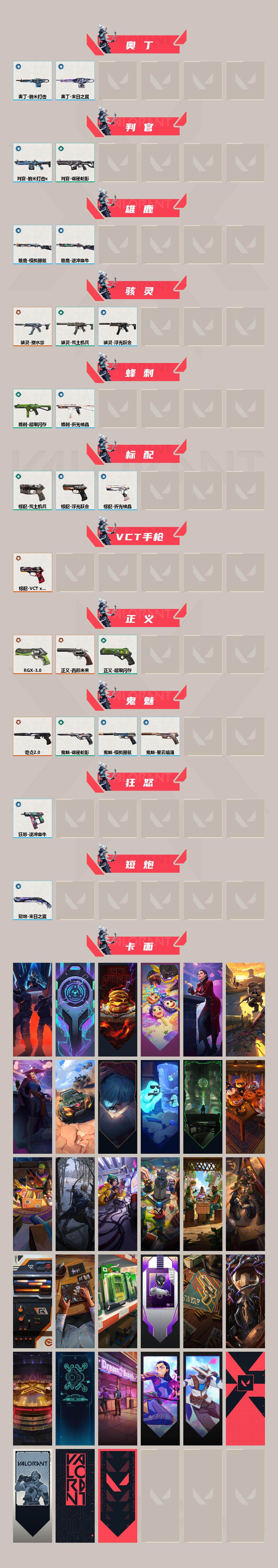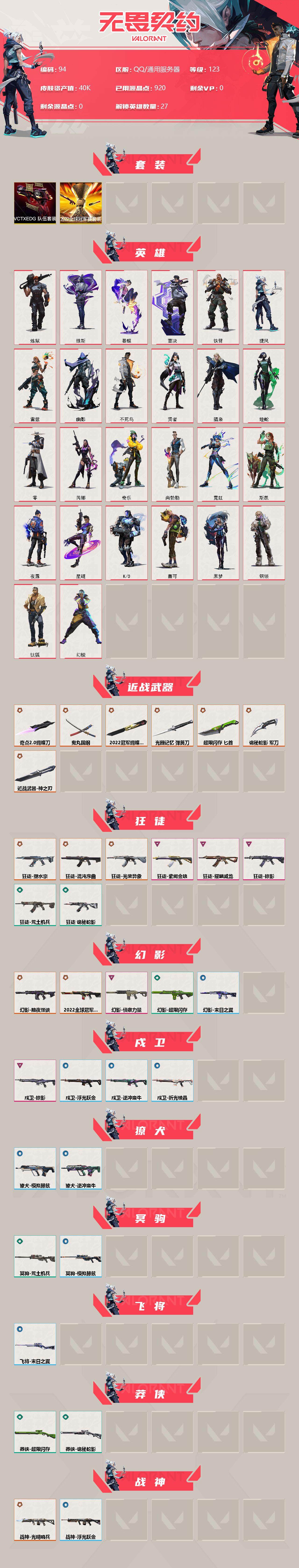 【94】【套装】:2022全球冠军赛套装,vctxedg 队伍套装 【英雄】:幻棱,炼狱,维斯,暮蝶,钛狐,壹决,铁臂,捷风,雷兹,幽影,不死鸟,贤者,猎枭,蝰蛇,零,芮娜,奇乐,尚勃勒,霓虹,斯凯,夜露,星礈,k/o,盖可,黑梦,钢锁 【近战 武器】:近战武器-2022全球冠军赛 蝴蝶刀,近战武器-神之刃,近战武器-奇点//2.0 蝴蝶刀,近战武器-鬼丸国纲,近战武器-超限闪存 匕首,近战武器-光圈记忆 弹簧刀,近战武器-诡秘蛇影 军刀 【狂徒】:狂徒-混沌序曲,狂徒-塑水宗,狂徒-光荣异象,狂徒-掠影,狂徒-耀鳞威龙,狂徒-紫阙金琅,狂徒-荒土机兵,狂徒-诡秘蛇影 【幻影】:幻影-2022全球冠军赛,幻影-黯夜怪谈,幻影-侦察力量,幻影-超限闪存,幻影-末日之翼 【戍卫】:戍卫-掠影,戍卫-浮光跃金,戍卫-逆冲蛮牛,戍卫-折光棱晶 【獠犬】:獠犬-模拟赫兹,獠犬-逆冲蛮牛 【冥驹】:冥驹-荒土机兵,冥驹-模拟赫兹 【飞将】:飞将-末日之翼 【莽侠】:莽侠-超限闪存,莽侠-诡秘蛇影 【战神】:战神-光明哨兵,战神-浮光跃金 【奥丁】:奥丁-纳米打击,奥丁-末日之翼 【判官】:判官-诡秘蛇影,判官-纳米打击x 【雄鹿】:雄鹿-模拟赫兹,雄鹿-逆冲蛮牛 【骇灵】:骇灵-塑水宗,骇灵-荒土机兵,骇灵-浮光跃金 【蜂刺】:蜂刺-超限闪存,蜂刺-折光棱晶 【标配】:标配-荒土机兵,标配-浮光跃金,标配-折光棱晶 【vct手呛】:标配-vct x edg 【正义】:正义-rgx 11z pro//3.0,正义-西部未来,正义-超限闪存 【鬼魅】:鬼魅-奇点//2.0,鬼魅-诡秘蛇影,鬼魅-模拟赫兹,鬼魅-星云暗涌 【狂怒】:狂怒-逆冲蛮牛 【短炮】:短炮-末日之翼 【卡面】:纳米打击 卡面,抑制技术 卡面,激斗汉堡 卡面,瓦娃脸雪糕 p2 卡面,从黄昏到黎明 卡面,荒土机兵 卡面,银弹猎手 卡面,逆冲蛮牛 卡面,《双城之战》拥抱 卡面,精灵大战 卡面,欢迎来到底城 卡面,南瓜盛典 卡面,唱片的故事 卡面,钢弓与箭弦 卡面,排除故障 卡面,战术桌游 卡面,悠享食光 卡面,修车达人 卡面,模拟赫兹 卡面,浮光跃金 卡面,超限闪存 卡面,维斯工牌 卡面,正义的化身 卡面,时间到 卡面,最高舞台 卡面,声感陷阱设计图 卡面,梦幻奶茶 卡面,无畏契约go!第一卷:芮娜 卡面,无畏契约go!第一卷:零 卡面,代号红色 卡面,新兵报到 卡面,v契约 卡面,无畏契约 卡面 【喷漆】:战“素”兔 喷漆,宇宙的指引 喷漆,请求重启 喷漆,逆冲蛮牛 喷漆,纳米打击 喷漆,鼻尖上的蝴蝶 喷漆,简笔画黯兽 喷漆,独守蝰腹 喷漆,他们将落荒而逃 喷漆,通缉:战术企鹅 喷漆,荒土机兵 喷漆,别挡我吃球! 喷漆,嗨宝南瓜灯 喷漆,嘭! 喷漆,都算到了 喷漆,控场勿近 喷漆,皮蛋呼呼 喷漆,像素星礈 喷漆,图谋不轨的零 喷漆,小丑猫 喷漆,模拟赫兹 喷漆,高丽风情小熊 喷漆,蹲到一个 喷漆,全力集中 喷漆,超限闪存 喷漆,rua一下 喷漆,熊抱 喷漆,高丽风情小虎 喷漆,记在小本本 喷漆,防弹企鹅 喷漆,高丽风情小蛙 喷漆,超级粉丝 喷漆,捷风差距 喷漆,拼一呛 喷漆,买装还是存钱 喷漆,是大风刮来的 喷漆 ,这是你掉的吗? 喷漆,胜利属于无畏契约 喷漆,glhf 喷漆,无畏契约 喷漆 【挂饰】:猫猫木乃伊 挂饰,水壶 挂饰,纳米打击 挂饰,逆冲蛮牛 挂饰,可爱糖糖 挂饰,伞绳 挂饰,《双城之战》小蛋糕 挂饰,第九季//第三幕 纪念币 挂饰,拳击战术熊 挂饰,工具腰带 挂饰,无畏契约go!第一卷 芮娜 挂饰,无畏契约go!第一卷 零 挂饰,暗藏猫腻 挂饰,高丽风情 挂饰,熔岩灯 挂饰,超限闪存 挂饰,迷你k/o 挂饰,模拟赫兹 挂饰,第九季//第二幕 纪念币 挂饰,袖珍捷风 挂饰,迷你浓缩 挂饰,第九季//第一幕 纪念币 挂饰,vct x edg 挂饰,流星兵团 挂饰,天外飞客 挂饰,无畏契约 纪念币 挂饰