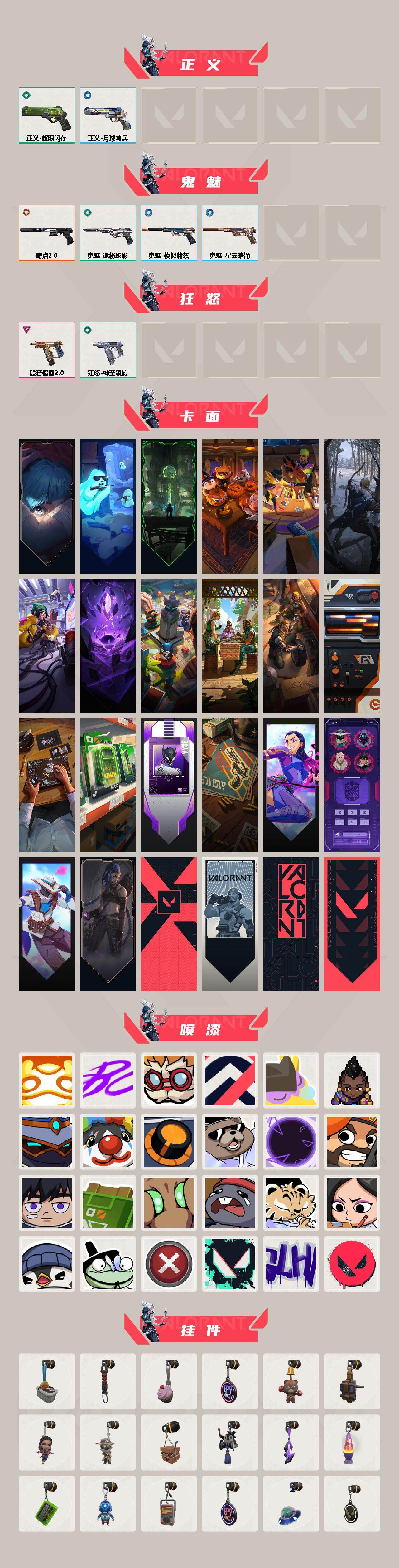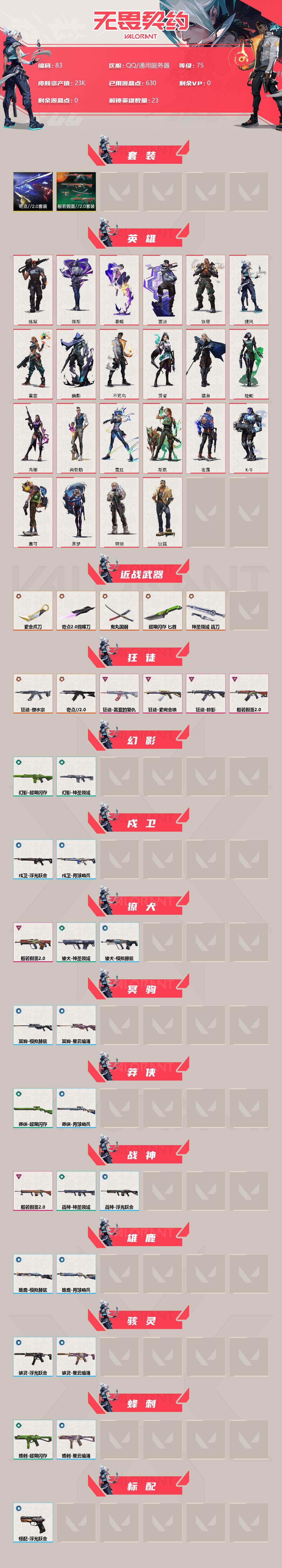 【83】【套装】:奇点//2.0套装,般若假面//2.0套装 【英雄】:炼狱,维斯,暮蝶,钛狐,壹决,铁臂,捷风,雷兹,幽影,不死鸟,贤者,猎枭,蝰蛇,芮娜,尚勃勒,霓虹,斯凯,夜露,k/o,盖可,黑梦,钢锁 【近战 武器】:近战武器-奇点//2.0 蝴蝶刀,近战武器-紫金爪刀,近战武器-鬼丸国纲,近战武器-超限闪存 匕首,近战武器-神圣领域 战刀 【狂徒】:狂徒-奇点//2.0,狂徒-塑水宗,狂徒-般若假面//2.0,狂徒-掠影,狂徒-盖亚的复仇,狂徒-紫阙金琅 【幻影】:幻影-超限闪存,幻影-神圣领域 【戍卫】:戍卫-浮光跃金,戍卫-月球哨兵 【獠犬】:獠犬-般若假面//2.0,獠犬-神圣领域,獠犬-模拟赫兹 【冥驹】:冥驹-模拟赫兹,冥驹-星云暗涌 【莽侠】:莽侠-超限闪存,莽侠-月球哨兵 【战神】:战神-般若假面//2.0,战神-神圣领域,战神-浮光跃金 【雄鹿】:雄鹿-模拟赫兹,雄鹿-月球哨兵 【骇灵】:骇灵-浮光跃金,骇灵-星云暗涌 【蜂刺】:蜂刺-超限闪存,蜂刺-星云暗涌 【标配】:标配-浮光跃金 【正义】:正义-超限闪存,正义-月球哨兵 【鬼魅】:鬼魅-奇点//2.0,鬼魅-诡秘蛇影,鬼魅-模拟赫兹,鬼魅-星云暗涌 【狂怒】:狂怒-般若假面//2.0,狂怒-神圣领域 【卡面】:《双城之战》拥抱 卡面,精灵大战 卡面,欢迎来到底城 卡面,南瓜盛典 卡面,唱片的故事 卡面,钢弓与箭弦 卡面,排除故障 卡面,奇点//2.0 卡面,战术桌游 卡面,悠享食光 卡面,修车达人 卡面,模拟赫兹 卡面,浮光跃金 卡面,超限闪存 卡面,维斯工牌 卡面,正义的化身 卡面,无畏契约go!第一卷:芮娜 卡面,清除名单 卡面,无畏契约go!第一卷:零 卡面,《双城之战》金克丝 卡面,代号红色 卡面,新兵报到 卡面,v契约 卡面,无畏契约 卡面 【喷漆】:嗨宝南瓜灯 喷漆,嘭! 喷漆,都算到了 喷漆,控场勿近 喷漆,皮蛋呼呼 喷漆,像素星礈 喷漆,图谋不轨的零 喷漆,小丑猫 喷漆,模拟赫兹 喷漆,高丽风情小熊 喷漆,奇点//2.0 喷漆,蹲到一个 喷漆,全力集中 喷漆,超限闪存 喷漆,rua一下 喷漆,熊抱 喷漆,高丽风情小虎 喷漆,记在小本本 喷漆,防弹企鹅 喷漆,高丽风情小蛙 喷漆,买装还是存钱 喷漆,胜利属于无畏契约 喷漆,glhf 喷漆,无畏契约 喷漆 【挂饰】:悠闲鸡块 挂饰,伞绳 挂饰,《双城之战》小蛋糕 挂饰,第九季//第三幕 纪念币 挂饰,拳击战术熊 挂饰,工具腰带 挂饰,无畏契约go!第一卷 芮娜 挂饰,无畏契约go!第一卷 零 挂饰,暗藏猫腻 挂饰,高丽风情 挂饰,奇点//2.0 挂饰,熔岩灯 挂饰,超限闪存 挂饰,迷你k/o 挂饰,模拟赫兹 挂饰,第九季//第二幕 纪念币 挂饰,天外飞客 挂饰,无畏契约 纪念币 挂饰