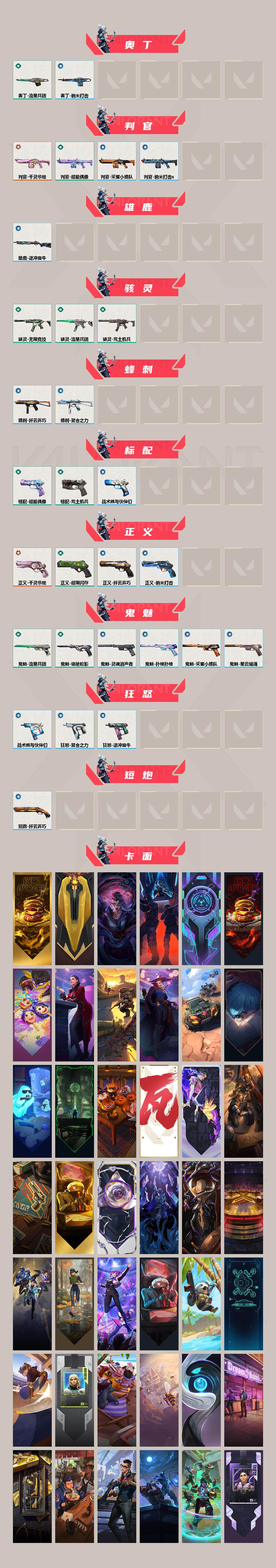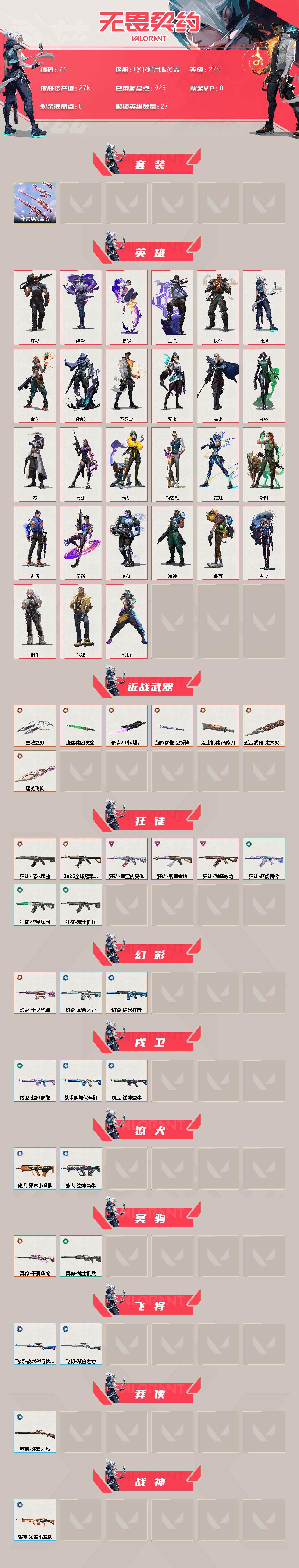 【74】【套装】:千灵华绽套装 【英雄】:幻棱,炼狱,维斯,暮蝶,钛狐,壹决,铁臂,捷风,雷兹,幽影,不死鸟,贤者,猎枭,蝰蛇,零,芮娜,奇乐,尚勃勒,霓虹,斯凯,夜露,星礈,k/o,海神,盖可,黑梦,钢锁 【近战 武器】:近战武器-魔术火花,近战武器-奇点//2.0 蝴蝶刀,近战武器-黑波之刃,近战武器-落英飞旋,近战武器-流星兵团 短剑,近战武器-超能偶像 应援棒,近战武器-荒土机兵 热能刀,近战武器-魔术火花 【狂徒】:狂徒-2025全球冠军赛,狂徒-混沌序曲,狂徒-盖亚的复仇,狂徒-耀鳞威龙,狂徒-紫阙金琅,狂徒-超能偶像,狂徒-荒土机兵,狂徒-流星兵团 【幻影】:幻影-千灵华绽,幻影-聚合之力,幻影-纳米打击 【戍卫】:戍卫-超能偶像,戍卫-逆冲蛮牛,戍卫-战术熊与伙伴们 【獠犬】:獠犬-采蜜小蜂队,獠犬-逆冲蛮牛 【冥驹】:冥驹-千灵华绽,冥驹-荒土机兵 【飞将】:飞将-聚合之力,飞将-战术熊与伙伴们 【莽侠】:莽侠-纤云弄巧 【战神】:战神-采蜜小蜂队 【奥丁】:奥丁-流星兵团,奥丁-纳米打击 【判官】:判官-千灵华绽,判官-超能偶像,判官-采蜜小蜂队,判官-纳米打击x 【雄鹿】:雄鹿-逆冲蛮牛 【骇灵】:骇灵-荒土机兵,骇灵-流星兵团,骇灵-无限竞技 【蜂刺】:蜂刺-聚合之力,蜂刺-纤云弄巧 【标配】:标配-超能偶像,标配-荒土机兵,标配-战术熊与伙伴们 【正义】:正义-千灵华绽,正义-超限闪存,正义-纳米打击,正义-纤云弄巧 【鬼魅】:鬼魅-流星兵团,鬼魅-诡秘蛇影,鬼魅-采蜜小蜂队,鬼魅-灵魂消声者,鬼魅-扑棱扑棱,鬼魅-星云暗涌 【狂怒】:狂怒-聚合之力,狂怒-逆冲蛮牛,狂怒-战术熊与伙伴们 【短炮】:短炮-纤云弄巧 【卡面】:终章:激斗汉堡 卡面,进入射程 卡面,分崩离析 卡面,纳米打击 卡面,抑制技术 卡面,激斗汉堡 卡面,瓦娃脸雪糕 p2 卡面,从黄昏到黎明 卡面,荒土机兵 卡面,银弹猎手 卡面,逆冲蛮牛 卡面,《双城之战》拥抱 卡面,精灵大战 卡面,欢迎来到底城 卡面,南瓜盛典 卡面,vct cn首冠 卡面,无畏契约:暮蝶 卡面,修车达人 卡面,正义的化身 卡面,终章:生意人麦宝 卡面,铁之华 卡面,失而复得 卡面,时间到 卡面,最高舞台 卡面,复活专家 卡面,归乡 // 蝰蛇 卡面,超能偶像 卡面,生意人麦宝 卡面,树懒大作战 卡面,声感陷阱设计图 卡面,clutch 卡面,钢锁工牌 卡面,战术小伙伴的夏日 卡面,采蜜小蜂队 卡面,聚合之力 卡面,梦幻奶茶 卡面,终章:打造专属狂徒 卡面,趁热吃 卡面,西装暴徒 卡面,失控边缘 卡面,哨卫者之领域 卡面,暮蝶工牌 卡面,战术熊与伙伴们 卡面,源能反应 卡面,流星兵团 卡面,纤云弄巧 卡面,暂别喧嚣 卡面,打造专属狂徒 卡面,零点嗅探设计图 卡面,瓦娃脸雪糕 卡面 ,无畏契约go!第一卷:芮娜 卡面,清除名单 卡面,无畏契约go!第一卷:零 卡面,化茧成蝶 卡面,《双城之战》金克丝 卡面,钢锁vs盖可 卡面,胡桃狂想 卡面,代号红色 卡面,新兵报到 卡面,v契约 卡面,无畏契约 卡面 【喷漆】:小小心意 喷漆,战“素”兔 喷漆,宇宙的指引 喷漆,请求重启 喷漆,逆冲蛮牛 喷漆,纳米打击 喷漆,鼻尖上的蝴蝶 喷漆,简笔画黯兽 喷漆,独守蝰腹 喷漆,他们将落荒而逃 喷漆,通缉:战术企鹅 喷漆,荒土机兵 喷漆,别挡我吃球! 喷漆,嗨宝南瓜灯 喷漆,嘭! 喷漆,都算到了 喷漆,通缉:战术熊 喷漆,控场勿近 喷漆,伤心心 喷漆,小丑猫 喷漆,熊抱 喷漆,高丽风情小蛙 喷漆,又被闪了 喷漆,终极羞辱 喷漆,超级粉丝 喷漆,黯兽卖萌 喷漆,捷风差距 喷漆,惊声尖叫 喷漆,五人成星 喷漆,超能偶像 喷漆,放我出去 喷漆,掩护我 喷漆,大佬发呛 喷漆,边缘试探 喷漆,拼一呛 喷漆,聚合之力 喷漆,采蜜小蜂队 喷漆,梦幻小队 喷漆,五个全都齐了 喷漆,加油!加油! 喷漆,开心到爆炸 喷漆,皮蛋萌舞 喷漆,我觉得不行 喷漆,头号粉丝 喷漆,吸一口快乐 喷漆,永远的答案 喷漆,再来一次? 喷漆,别挡我的路! 喷漆,我的刀呢? 喷漆,当然可以 喷漆,流星兵团 喷漆,战术熊与伙伴们 喷漆,禁止喷漆 喷漆,纤云弄巧 喷漆,双击点赞 喷漆,买装还是存钱 喷漆,关门放狗 喷漆,酷熊冲浪 喷漆,红鳞 喷漆,胜利属于无畏契约 喷漆,glhf 喷漆,无畏契约 喷漆 【挂饰】:终章:猫猫木乃伊 挂饰,荒土机兵 挂饰,悠闲鸡块 挂饰,猫猫木乃伊 挂饰,水壶 挂饰,纳米打击 挂饰,逆冲蛮牛 挂饰,可爱糖糖 挂饰,伞绳 挂饰,《双城之战》小蛋糕 挂饰,第九季//第三幕 纪念币 挂饰,工具腰带 挂饰,无畏契约go!第一卷 芮娜 挂饰,无畏契约go!第一卷 零 挂饰,熔岩灯 挂饰,第九季//第二幕 纪念币 挂饰,终章:这瓜保熟 挂饰,炼狱雪糕 挂饰,糖葫芦 挂饰,袖珍捷风 挂饰,冲上云霄 挂饰,超能偶像 挂饰,迷你浓缩 挂饰,这瓜保熟 挂饰,z世代特饮 挂饰,采蜜小蜂队 挂饰,第九季//第一幕 纪念币 挂饰,聚合之力 挂饰,第八季:白银 挂饰,终章:迷你机甲 挂饰,犯困的布鲁诺 挂饰,战术河童 挂饰,招财猫熊 挂饰,迷你机甲 挂饰,荧光棒 挂饰,章鱼烧先生 挂饰,流星兵团 挂饰,云开见日 挂饰,第八季//第三幕 纪念币 挂饰,第八季//第二幕 纪念币 挂饰 ,天外飞客 挂饰,无畏契约 纪念币 挂饰