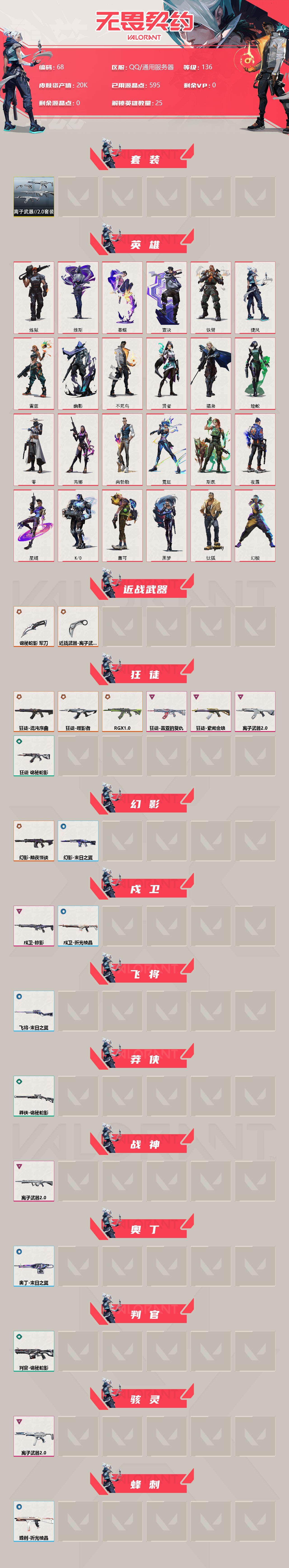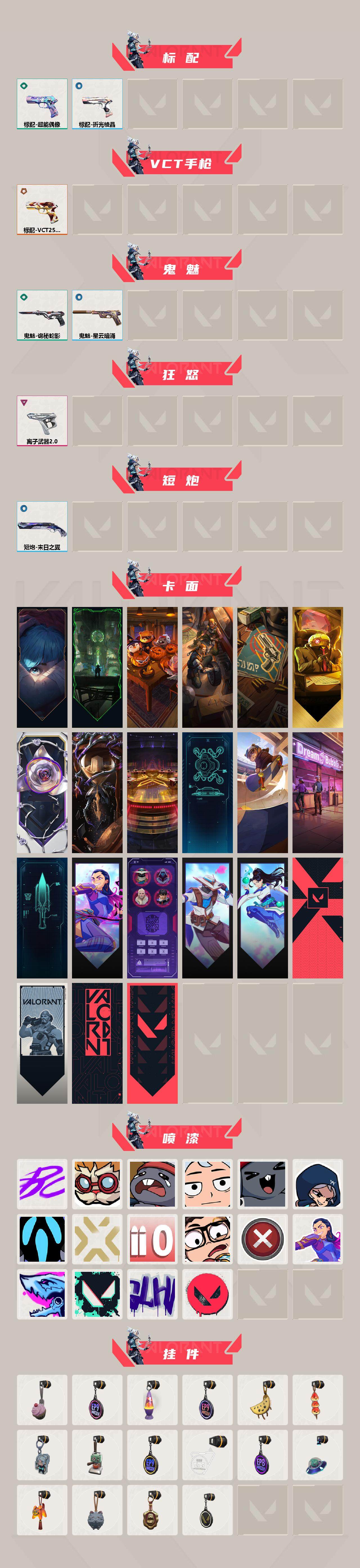 【68】【套装】:离子武器//2.0套装 【英雄】:幻棱,炼狱,维斯,暮蝶,钛狐,壹决,铁臂,捷风,雷兹,幽影,不死鸟,贤者,猎枭,蝰蛇,零,芮娜,尚勃勒,霓虹,斯凯,夜露,星礈,k/o,盖可,黑梦 【近战 武器】:近战武器-离子武器//2.0 爪刀,近战武器-诡秘蛇影 军刀 【狂徒】:狂徒-混沌序曲,狂徒-噬影者,狂徒-rgx 11z pro,狂徒-盖亚的复仇,狂徒-紫阙金琅,狂徒-离子武器//2.0,狂徒-诡秘蛇影 【幻影】:幻影-黯夜怪谈,幻影-末日之翼 【戍卫】:戍卫-掠影,戍卫-折光棱晶 【飞将】:飞将-末日之翼 【莽侠】:莽侠-诡秘蛇影 【战神】:战神-离子武器//2.0 【奥丁】:奥丁-末日之翼 【判官】:判官-诡秘蛇影 【骇灵】:骇灵-离子武器//2.0 【蜂刺】:蜂刺-折光棱晶 【标配】:标配-超能偶像,标配-折光棱晶 【vct手呛】:标配-vct25 x edg 【鬼魅】:鬼魅-诡秘蛇影,鬼魅-星云暗涌 【狂怒】:狂怒-离子武器//2.0 【短炮】:短炮-末日之翼 【卡面】:《双城之战》拥抱 卡面,欢迎来到底城 卡面,南瓜盛典 卡面,修车达人 卡面,正义的化身 卡面,终章:生意人麦宝 卡面,铁之华 卡面,时间到 卡面,最高舞台 卡面,声感陷阱设计图 卡面,clutch 卡面,梦幻奶茶 卡面,零点嗅探设计图 卡面,无畏契约go!第一卷:芮娜 卡面,清除名单 卡面,无畏契约go!第一卷:零 卡面,无畏契约go!第一卷:贤者 卡面,代号红色 卡面,新兵报到 卡面,v契约 卡面,无畏契约 卡面 【喷漆】:嘭! 喷漆,都算到了 喷漆,熊抱 喷漆,又被闪了 喷漆,超级粉丝 喷漆,捷风差距 喷漆,惊声尖叫 喷漆,2021冠军巡回赛花火 喷漆,拼一呛 喷漆,新潮流 喷漆,买装还是存钱 喷漆,无畏契约go!第一卷:芮娜 喷漆,暴走萝莉 喷漆,胜利属于无畏契约 喷漆,glhf 喷漆,无畏契约 喷漆 【挂饰】:《双城之战》小蛋糕 挂饰,第九季//第三幕 纪念币 挂饰,熔岩灯 挂饰,第九季//第二幕 纪念币 挂饰,终章:这瓜保熟 挂饰,糖葫芦 挂饰,袖珍捷风 挂饰,迷你浓缩 挂饰,第九季//第一幕 纪念币 挂饰,vct x edg 挂饰,第八季//第二幕 纪念币 挂饰 ,天外飞客 挂饰,好运福爪 挂饰,《双城之战》魄罗 挂饰,海豹的认可 挂饰,无畏契约 纪念币 挂饰