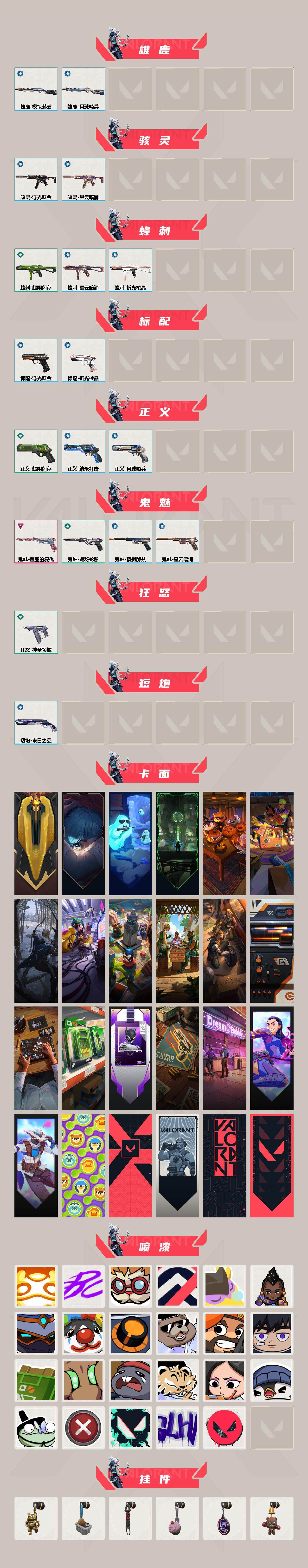 【62】【英雄】:幻棱,炼狱,维斯,暮蝶,钛狐,壹决,铁臂,捷风,雷兹,幽影,不死鸟,贤者,猎枭,零,芮娜,奇乐,尚勃勒,霓虹,斯凯,夜露,星礈,k/o,海神,盖可,黑梦,钢锁 【近战 武器】:近战武器-紫金爪刀,近战武器-超限闪存 匕首,近战武器-圣石匕首,近战武器-诡秘蛇影 军刀,近战武器-神圣领域 战刀 【狂徒】:狂徒-归零者,狂徒-塑水宗,狂徒-虚空遗器,狂徒-冰点凝冻,狂徒-堕天遗武,狂徒-掠影,狂徒-盖亚的复仇,狂徒-离子武器//2.0,狂徒-诡秘蛇影 【幻影】:幻影-黯夜怪谈,幻影-砰砰x特攻队,幻影-超限闪存,幻影-神圣领域,幻影-末日之翼 【戍卫】:戍卫-浮光跃金,戍卫-月球哨兵,戍卫-折光棱晶 【獠犬】:獠犬-神圣领域,獠犬-模拟赫兹 【冥驹】:冥驹-模拟赫兹,冥驹-星云暗涌 【飞将】:飞将-末日之翼 【莽侠】:莽侠-超限闪存,莽侠-诡秘蛇影,莽侠-月球哨兵 【战神】:战神-神圣领域,战神-浮光跃金 【奥丁】:奥丁-末日之翼 【判官】:判官-诡秘蛇影 【雄鹿】:雄鹿-模拟赫兹,雄鹿-月球哨兵 【骇灵】:骇灵-浮光跃金,骇灵-星云暗涌 【蜂刺】:蜂刺-超限闪存,蜂刺-星云暗涌,蜂刺-折光棱晶 【标配】:标配-浮光跃金,标配-折光棱晶 【正义】:正义-超限闪存,正义-纳米打击,正义-月球哨兵 【鬼魅】:鬼魅-盖亚的复仇,鬼魅-诡秘蛇影,鬼魅-模拟赫兹,鬼魅-星云暗涌 【狂怒】:狂怒-神圣领域 【短炮】:短炮-末日之翼 【卡面】:进入射程 卡面,《双城之战》拥抱 卡面,精灵大战 卡面,欢迎来到底城 卡面,南瓜盛典 卡面,唱片的故事 卡面,钢弓与箭弦 卡面,排除故障 卡面,战术桌游 卡面,悠享食光 卡面,修车达人 卡面,模拟赫兹 卡面,浮光跃金 卡面,超限闪存 卡面,维斯工牌 卡面,正义的化身 卡面,梦幻奶茶 卡面,无畏契约go!第一卷:芮娜 卡面,无畏契约go!第一卷:零 卡面,战术小伙伴 卡面,代号红色 卡面,新兵报到 卡面,v契约 卡面,无畏契约 卡面 【喷漆】:嗨宝南瓜灯 喷漆,嘭! 喷漆,都算到了 喷漆,控场勿近 喷漆,皮蛋呼呼 喷漆,像素星礈 喷漆,图谋不轨的零 喷漆,小丑猫 喷漆,模拟赫兹 喷漆,高丽风情小熊 喷漆,蹲到一个 喷漆,全力集中 喷漆,超限闪存 喷漆,rua一下 喷漆,熊抱 喷漆,高丽风情小虎 喷漆,记在小本本 喷漆,防弹企鹅 喷漆,高丽风情小蛙 喷漆,买装还是存钱 喷漆,胜利属于无畏契约 喷漆,glhf 喷漆,无畏契约 喷漆 【挂饰】:终章:猫猫木乃伊 挂饰,悠闲鸡块 挂饰,伞绳 挂饰,《双城之战》小蛋糕 挂饰,第九季//第三幕 纪念币 挂饰,拳击战术熊 挂饰,工具腰带 挂饰,无畏契约go!第一卷 芮娜 挂饰,无畏契约go!第一卷 零 挂饰,暗藏猫腻 挂饰,高丽风情 挂饰,熔岩灯 挂饰,超限闪存 挂饰,迷你k/o 挂饰,模拟赫兹 挂饰,第九季//第二幕 纪念币 挂饰,天外飞客 挂饰,无畏契约 纪念币 挂饰
