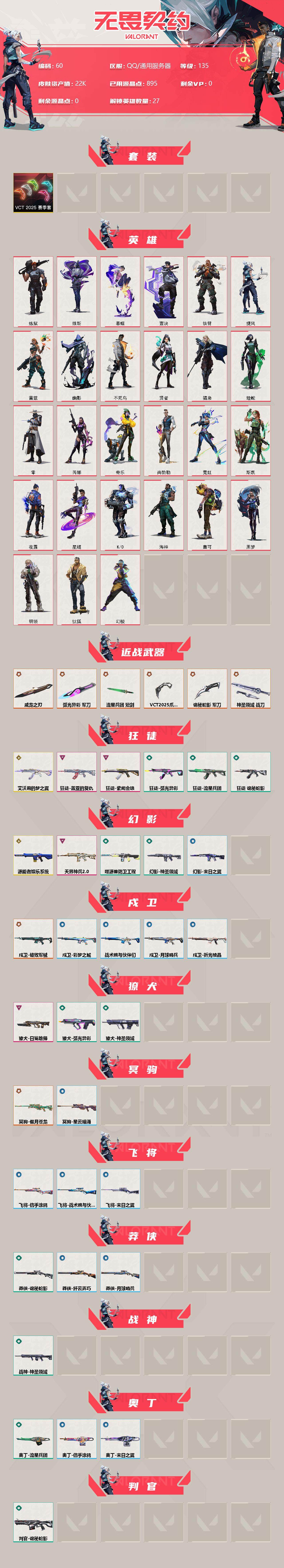 【60】【套装】:vct 2025 赛季套装 【英雄】:幻棱,炼狱,维斯,暮蝶,钛狐,壹决,铁臂,捷风,雷兹,幽影,不死鸟,贤者,猎枭,蝰蛇,零,芮娜,奇乐,尚勃勒,霓虹,斯凯,夜露,星礈,k/o,海神,盖可,黑梦,钢锁 【近战 武器】:近战武器-vct 2025 爪刀,近战武器-威龙之刃,近战武器-流星兵团 短剑,近战武器-弧光异彩 军刀,近战武器-诡秘蛇影 军刀,近战武器-神圣领域 战刀 【狂徒】:狂徒-艾沃莉的梦之翼,狂徒-盖亚的复仇,狂徒-紫阙金琅,狂徒-弧光异彩,狂徒-流星兵团,狂徒-诡秘蛇影 【幻影】:幻影-源能者娱乐系统,幻影-天界神兵//2.0,幻影-噬源兽防卫工程,幻影-神圣领域,幻影-末日之翼 【戍卫】:戍卫-破败军械,戍卫-彩梦之城,戍卫-战术熊与伙伴们,戍卫-月球哨兵,戍卫-折光棱晶 【獠犬】:獠犬-日冕雄师,獠犬-弧光异彩,獠犬-神圣领域 【冥驹】:冥驹-偃月苍龙,冥驹-星云暗涌 【飞将】:飞将-信手涂鸦,飞将-战术熊与伙伴们,飞将-末日之翼 【莽侠】:莽侠-诡秘蛇影,莽侠-纤云弄巧,莽侠-月球哨兵 【战神】:战神-神圣领域 【奥丁】:奥丁-流星兵团,奥丁-信手涂鸦,奥丁-末日之翼 【判官】:判官-诡秘蛇影 【雄鹿】:雄鹿-彩梦之城,雄鹿-月球哨兵 【骇灵】:骇灵-砰砰x特攻队,骇灵-流星兵团,骇灵-信手涂鸦,骇灵-星云暗涌 【蜂刺】:蜂刺-弧光异彩,蜂刺-纤云弄巧,蜂刺-星云暗涌,蜂刺-折光棱晶 【标配】:标配-超能偶像,标配-彩梦之城,标配-战术熊与伙伴们,标配-折光棱晶 【vct手呛】:标配-vct x te 【正义】:正义-塑水宗,正义-纤云弄巧,正义-月球哨兵 【鬼魅】:鬼魅-流星兵团,鬼魅-诡秘蛇影,鬼魅-信手涂鸦,鬼魅-星云暗涌 【狂怒】:狂怒-神圣领域,狂怒-战术熊与伙伴们 【短炮】:短炮-弧光异彩,短炮-纤云弄巧,短炮-末日之翼 【卡面】:精灵大战 卡面,南瓜盛典 卡面,无畏契约:暮蝶 卡面,正义的化身 卡面,终章:生意人麦宝 卡面,铁之华 卡面,时间到 卡面,最高舞台 卡面,树懒大作战 卡面,声感陷阱设计图 卡面,红鳞松叶 卡面,clutch 卡面,梦幻奶茶 卡面,终章:打造专属狂徒 卡面,趁热吃 卡面,西装暴徒 卡面,失控边缘 卡面,哨卫者之领域 卡面,艺无止境//全球冠军赛 卡面,暮蝶工牌 卡面,战术熊与伙伴们 卡面,源能反应 卡面,流星兵团 卡面,纤云弄巧 卡面,暂别喧嚣 卡面,打造专属狂徒 卡面,零点嗅探设计图 卡面,沙雕爆能器 卡面,无畏契约go!第一卷:芮娜 卡面,清除名单 卡面,无畏契约go!第一卷:零 卡面,龍记 卡面,先瓦为敬 绿色 卡面,《双城之战》金克丝 卡面,完美调谐 卡面 ,暗呛 卡面,钢锁vs盖可 卡面,别冒尖 卡面,热烈欢迎 卡面,铁臂设计图 卡面,代号红色 卡面,冰淇淋店 卡面,新兵报到 卡面,友军火力 卡面,v契约 卡面,无畏契约 卡面 【喷漆】:控场勿近 喷漆,伤心心 喷漆,超级粉丝 喷漆,捷风差距 喷漆,惊声尖叫 喷漆,2021冠军巡回赛花火 喷漆,拼一呛 喷漆,加油!加油! 喷漆,开心到爆炸 喷漆,皮蛋萌舞 喷漆,我觉得不行 喷漆,头号粉丝 喷漆,吸一口快乐 喷漆,永远的答案 喷漆,再来一次? 喷漆,别挡我的路! 喷漆,我的刀呢? 喷漆,当然可以 喷漆,流星兵团 喷漆,战术熊与伙伴们 喷漆,禁止喷漆 喷漆,纤云弄巧 喷漆,uwu 喷漆,新潮流 喷漆,双击点赞 喷漆,买装还是存钱 喷漆,醒狮贺春 喷漆,酷熊冲浪 喷漆,无畏契约go!第一卷:捷风 喷漆,蕊形灯 喷漆,放下武器 喷漆,口袋贤者 喷漆,胜利属于无畏契约 喷漆,glhf 喷漆,无畏契约 喷漆 【挂饰】:伞绳 挂饰,第九季//第三幕 纪念币 挂饰,无畏契约go!第一卷 芮娜 挂饰,无畏契约go!第一卷 零 挂饰,第九季//第二幕 纪念币 挂饰,终章:这瓜保熟 挂饰,糖葫芦 挂饰,袖珍捷风 挂饰,迷你浓缩 挂饰,z世代特饮 挂饰,动力机箱 挂饰,第九季//第一幕 纪念币 挂饰,终章:迷你机甲 挂饰,犯困的布鲁诺 挂饰,战术河童 挂饰,招财猫熊 挂饰,迷你机甲 挂饰,荧光棒 挂饰,章鱼烧先生 挂饰,流星兵团 挂饰,云开见日 挂饰,第八季//第三幕 纪念币 挂饰,瓶中信 挂饰,传世莲华 挂饰,第八季//第二幕 纪念币 挂饰 ,天外飞客 挂饰,好运福爪 挂饰,《双城之战》魄罗 挂饰,瞄这里 挂饰,第八季//第一幕 纪念币 挂饰,第七季:青铜 挂饰,海豹的认可 挂饰,第七季//第三幕 纪念币 挂饰,幸运中国结 挂饰,第七季//第二幕 纪念币 挂饰,无畏契约 纪念币 挂饰
