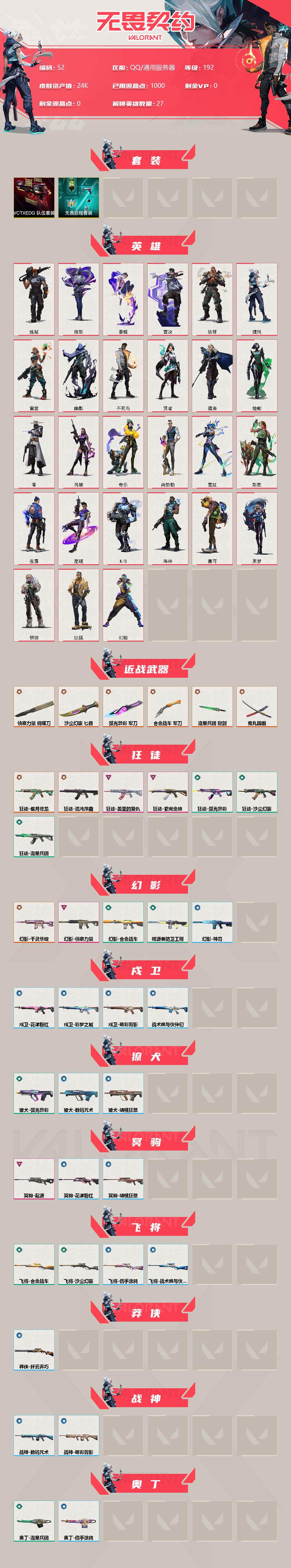 【52】【套装】:vctxedg 队伍套装,无畏启程套装 【英雄】:幻棱,炼狱,维斯,暮蝶,钛狐,壹决,铁臂,捷风,雷兹,幽影,不死鸟,贤者,猎枭,蝰蛇,零,芮娜,奇乐,尚勃勒,霓虹,斯凯,夜露,星礈,k/o,海神,盖可,黑梦,钢锁 【近战 武器】:近战武器-侦察力量 蝴蝶刀,近战武器-鬼丸国纲,近战武器-流星兵团 短剑,近战武器-合金战车 军刀,近战武器-弧光异彩 军刀,近战武器-沙尘幻旅 匕首 【狂徒】:狂徒-混沌序曲,狂徒-偃月苍龙,狂徒-盖亚的复仇,狂徒-紫阙金琅,狂徒-弧光异彩,狂徒-流星兵团,狂徒-沙尘幻旅 【幻影】:幻影-千灵华绽,幻影-侦察力量,幻影-合金战车,幻影-噬源兽防卫工程,幻影-神罚 【戍卫】:戍卫-彩梦之城,戍卫-花漾粉红,戍卫-萌彩剪影,戍卫-战术熊与伙伴们 【獠犬】:獠犬-弧光异彩,獠犬-胡桃狂想,獠犬-数码咒术 【冥驹】:冥驹-起源,冥驹-胡桃狂想,冥驹-花漾粉红 【飞将】:飞将-合金战车,飞将-沙尘幻旅,飞将-信手涂鸦,飞将-战术熊与伙伴们 【莽侠】:莽侠-纤云弄巧 【战神】:战神-萌彩剪影,战神-数码咒术 【奥丁】:奥丁-流星兵团,奥丁-信手涂鸦 【判官】:判官-萌彩剪影,判官-数码咒术 【雄鹿】:雄鹿-彩梦之城 【骇灵】:骇灵-奇点,骇灵-流星兵团,骇灵-沙尘幻旅,骇灵-花漾粉红,骇灵-信手涂鸦 【蜂刺】:蜂刺-合金战车,蜂刺-弧光异彩,蜂刺-胡桃狂想,蜂刺-纤云弄巧 【标配】:标配-彩梦之城,标配-超能冲撞,标配-艺高胆大,标配-战术熊与伙伴们 【vct手呛】:标配-vct x edg 【正义】:正义-光明哨兵,正义-西部未来,正义-合金战车,正义-沙尘幻旅,正义-传奇制造,正义-纳米打击,正义-纤云弄巧 【鬼魅】:鬼魅-天界神兵,鬼魅-流星兵团,鬼魅-胡桃狂想,鬼魅-数码咒术,鬼魅-信手涂鸦,鬼魅-星云暗涌 【狂怒】:狂怒-花漾粉红,狂怒-萌彩剪影,狂怒-战术熊与伙伴们 【短炮】:短炮-弧光异彩,短炮-纤云弄巧 【卡面】:进入射程 卡面,《双城之战》拥抱 卡面,精灵大战 卡面,欢迎来到底城 卡面,南瓜盛典 卡面,vct cn首冠 卡面,无畏契约:暮蝶 卡面,修车达人 卡面,热舞环节 卡面,正义的化身 卡面,时间到 卡面,最高舞台 卡面,声感陷阱设计图 卡面,风险合作 卡面,梦幻奶茶 卡面,终章:打造专属狂徒 卡面,趁热吃 卡面,西装暴徒 卡面,失控边缘 卡面,哨卫者之领域 卡面,无畏契约:尚勃勒 卡面,暮蝶工牌 卡面,战术熊与伙伴们 卡面,源能反应 卡面,流星兵团 卡面,纤云弄巧 卡面,暂别喧嚣 卡面,打造专属狂徒 卡面,零点嗅探设计图 卡面,夜班 卡面,无畏契约go!第一卷:芮娜 卡面,清除名单 卡面,无畏契约go!第一卷:零 卡面,龍记 卡面,完美调谐 卡面 ,暗呛 卡面,无畏契约go!第一卷:贤者 卡面,铁臂vs雷兹 卡面,纪念照 p2 卡面,钢锁vs盖可 卡面,别冒尖 卡面,一击全倒 卡面,黑影先生的咖啡! 卡面,天台狂欢 卡面,胡桃狂想 卡面,沙尘幻旅 卡面,壹决工牌 卡面,萌彩剪影 卡面,势不可挡//k/o 卡面,夯实根基 卡面,"luie" 卡面,热烈欢迎 卡面,铁臂设计图 卡面,代号红色 卡面,冰淇淋店 卡面,新兵报到 卡面,友军火力 卡面,v契约 卡面,无畏契约 卡面,809特遣队 卡面 【喷漆】:嗨宝南瓜灯 喷漆,完美熟度 喷漆,嘭! 喷漆,都算到了 喷漆,控场勿近 喷漆,伤心心 喷漆,小丑猫 喷漆,熊抱 喷漆,蛋糕还是爆能器? 喷漆,超级粉丝 喷漆,捷风差距 喷漆,惊声尖叫 喷漆,2021冠军巡回赛花火 喷漆,拼一呛 喷漆,尚勃勒 喷漆,加油!加油! 喷漆,开心到爆炸 喷漆,皮蛋萌舞 喷漆,分身有术 喷漆,我觉得不行 喷漆,头号粉丝 喷漆,致命优雅 喷漆,吸一口快乐 喷漆,永远的答案 喷漆,再来一次? 喷漆,别挡我的路! 喷漆,我的刀呢? 喷漆,当然可以 喷漆,流星兵团 喷漆,战术熊与伙伴们 喷漆,禁止喷漆 喷漆,纤云弄巧 喷漆,新潮流 喷漆,买装还是存钱 喷漆,醒狮贺春 喷漆,暴走萝莉 喷漆,旅行小熊 喷漆,蕊形灯 喷漆,这招不行了 喷漆,放下武器 喷漆,真相只有一个 喷漆,自信满满 喷漆,凌空惊吓 喷漆,再吃最后一口 喷漆,我一个滑铲 喷漆,放手一搏 喷漆,沙尘幻旅 喷漆,萌彩剪影 喷漆,电烫 喷漆,暗中偷瞄 喷漆,胡桃狂想 喷漆,红牌退场 喷漆,爆泉领域 喷漆,老铁困了 喷漆,口袋贤者 喷漆,胜利属于无畏契约 喷漆,glhf 喷漆,无畏契约 喷漆 【挂饰】:终章:猫猫木乃伊 挂饰,悠闲鸡块 挂饰,伞绳 挂饰,《双城之战》小蛋糕 挂饰,第九季//第三幕 纪念币 挂饰,无畏契约go!第一卷 芮娜 挂饰,无畏契约go!第一卷 零 挂饰,熔岩灯 挂饰,第九季//第二幕 纪念币 挂饰,糖葫芦 挂饰,袖珍捷风 挂饰,迷你浓缩 挂饰,动力机箱 挂饰,第九季//第一幕 纪念币 挂饰,终章:迷你机甲 挂饰,犯困的布鲁诺 挂饰,战术河童 挂饰,有事联系 挂饰,招财猫熊 挂饰,迷你机甲 挂饰,荧光棒 挂饰,vct x edg 挂饰,章鱼烧先生 挂饰,流星兵团 挂饰,云开见日 挂饰,第八季//第三幕 纪念币 挂饰,第八季//第二幕 纪念币 挂饰 ,天外飞客 挂饰,好运福爪 挂饰,《双城之战》魄罗 挂饰,酷闪轮滑 挂饰,呼啦熊 挂饰,瞄这里 挂饰,第八季//第一幕 纪念币 挂饰,终章:高音谱号 挂饰,再烧一会 挂饰,彩糖面包 挂饰,萌彩剪影 挂饰,针织蜜蜂 挂饰,高音谱号 挂饰,沙尘幻旅 挂饰,胡桃狂想 挂饰,冬日絮语 挂饰,海豹的认可 挂饰,第七季//第三幕 纪念币 挂饰,幸运中国结 挂饰,第七季//第二幕 纪念币 挂饰,无畏契约 纪念币 挂饰