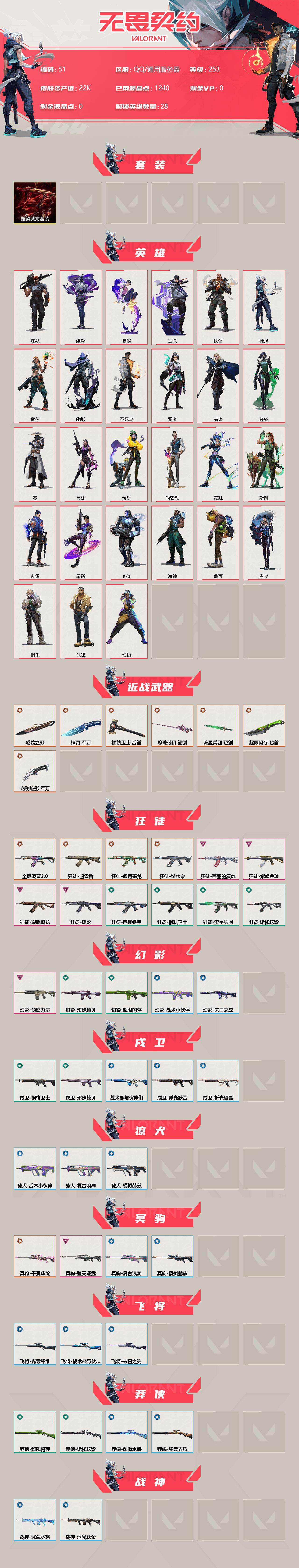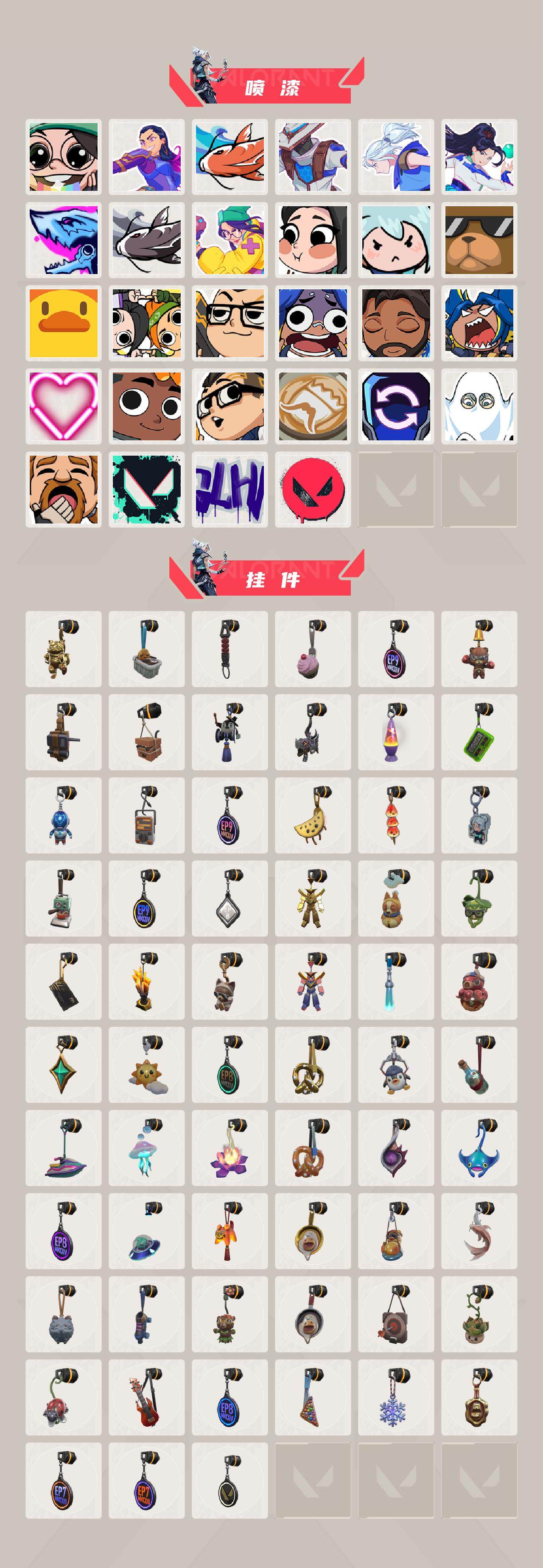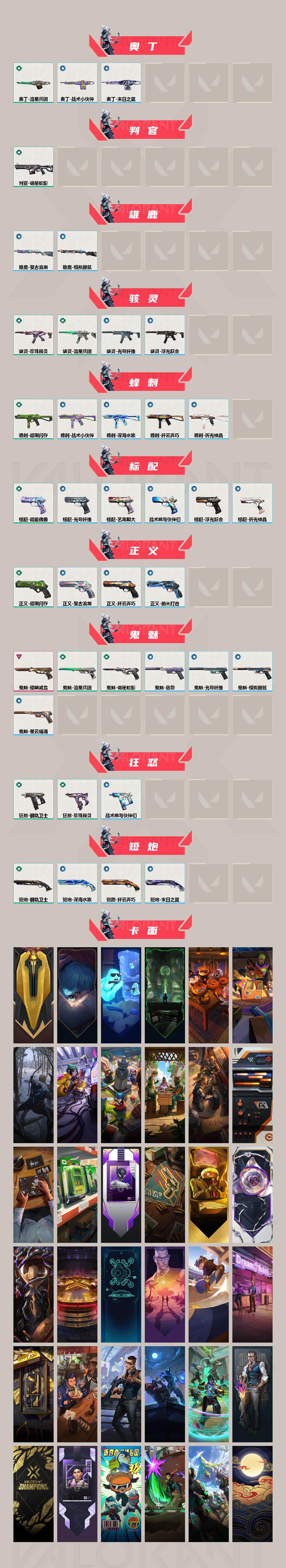 【51】【套装】:耀鳞威龙套装 【英雄】:幻棱,炼狱,维斯,暮蝶,钛狐,壹决,铁臂,捷风,雷兹,幽影,不死鸟,贤者,猎枭,蝰蛇,零,芮娜,奇乐,尚勃勒,霓虹,斯凯,夜露,星礈,k/o,海神,盖可,黑梦,钢锁 【近战 武器】:近战武器-威龙之刃,近战武器-珍珠棘贝 短剑,近战武器-流星兵团 短剑,近战武器-超限闪存 匕首,近战武器-钢轨卫士 战锤,近战武器-神罚 军刀,近战武器-诡秘蛇影 军刀 【狂徒】:狂徒-归零者,狂徒-全息波普//2.0,狂徒-塑水宗,狂徒-偃月苍龙,狂徒-掠影,狂徒-盖亚的复仇,狂徒-耀鳞威龙,狂徒-紫阙金琅,狂徒-钢轨卫士,狂徒-巨神铁甲,狂徒-流星兵团,狂徒-诡秘蛇影 【幻影】:幻影-侦察力量,幻影-超限闪存,幻影-珍珠棘贝,幻影-战术小伙伴,幻影-末日之翼 【戍卫】:戍卫-钢轨卫士,戍卫-珍珠棘贝,戍卫-浮光跃金,戍卫-战术熊与伙伴们,戍卫-折光棱晶 【獠犬】:獠犬-复古浪潮,獠犬-模拟赫兹,獠犬-战术小伙伴 【冥驹】:冥驹-千灵华绽,冥驹-堕天遗武,冥驹-复古浪潮,冥驹-模拟赫兹 【飞将】:飞将-光导纤维,飞将-战术熊与伙伴们,飞将-末日之翼 【莽侠】:莽侠-超限闪存,莽侠-诡秘蛇影,莽侠-深海水族,莽侠-纤云弄巧 【战神】:战神-浮光跃金,战神-深海水族 【奥丁】:奥丁-流星兵团,奥丁-战术小伙伴,奥丁-末日之翼 【判官】:判官-诡秘蛇影 【雄鹿】:雄鹿-复古浪潮,雄鹿-模拟赫兹 【骇灵】:骇灵-流星兵团,骇灵-珍珠棘贝,骇灵-浮光跃金,骇灵-光导纤维 【蜂刺】:蜂刺-超限闪存,蜂刺-深海水族,蜂刺-纤云弄巧,蜂刺-战术小伙伴,蜂刺-折光棱晶 【标配】:标配-超能偶像,标配-浮光跃金,标配-光导纤维,标配-艺高胆大,标配-战术熊与伙伴们,标配-折光棱晶 【正义】:正义-超限闪存,正义-复古浪潮,正义-纳米打击,正义-纤云弄巧 【鬼魅】:鬼魅-耀鳞威龙,鬼魅-流星兵团,鬼魅-诡秘蛇影,鬼魅-光导纤维,鬼魅-模拟赫兹,鬼魅-宿怨,鬼魅-星云暗涌 【狂怒】:狂怒-钢轨卫士,狂怒-珍珠棘贝,狂怒-战术熊与伙伴们 【短炮】:短炮-钢轨卫士,短炮-深海水族,短炮-纤云弄巧,短炮-末日之翼 【卡面】:进入射程 卡面,《双城之战》拥抱 卡面,精灵大战 卡面,欢迎来到底城 卡面,南瓜盛典 卡面,唱片的故事 卡面,钢弓与箭弦 卡面,排除故障 卡面,战术桌游 卡面,悠享食光 卡面,修车达人 卡面,模拟赫兹 卡面,浮光跃金 卡面,超限闪存 卡面,维斯工牌 卡面,正义的化身 卡面,终章:生意人麦宝 卡面,铁之华 卡面,时间到 卡面,最高舞台 卡面,声感陷阱设计图 卡面,风险合作 卡面,clutch 卡面,梦幻奶茶 卡面,终章:打造专属狂徒 卡面,趁热吃 卡面,西装暴徒 卡面,失控边缘 卡面,哨卫者之领域 卡面,无畏契约:尚勃勒 卡面,艺无止境//全球冠军赛 卡面,暮蝶工牌 卡面,战术熊与伙伴们 卡面,源能反应 卡面,流星兵团 卡面,纤云弄巧 卡面,暂别喧嚣 卡面,打造专属狂徒 卡面,零点嗅探设计图 卡面,终章:瓦娃脸雪糕 卡面,表象之下 卡面,虹吸式咖啡壶 卡面,源能者美容 卡面,脚踝终结者 卡面 ,夜班 卡面,瓦娃脸雪糕 卡面 ,沙雕爆能器 卡面,无畏契约go!第一卷:芮娜 卡面,深海水族 卡面,珍珠棘贝 卡面,复古浪潮 卡面,盖可工牌 卡面,清除名单 卡面,无畏契约go!第一卷:零 卡面,终章:同步耍酷 卡面,龍记 卡面,化茧成蝶 卡面,比比看谁快? 卡面,先瓦为敬 绿色 卡面,《双城之战》金克丝 卡面,蝰蛇vs幽影 卡面,势不可挡//盖可 卡面,逆向独行 卡面 ,同步耍酷 卡面,完美调谐 卡面 ,没有什么能逃过我的眼睛 卡面,光导纤维 卡面,战术小伙伴 卡面,钢轨卫士 卡面,暗呛 卡面,夯实根基 卡面,"luie" 卡面,铁臂设计图 卡面,代号红色 卡面,冰淇淋店 卡面,新兵报到 卡面,v契约 卡面,无畏契约 卡面 【喷漆】:嗨宝南瓜灯 喷漆,嘭! 喷漆,都算到了 喷漆,控场勿近 喷漆,皮蛋呼呼 喷漆,像素星礈 喷漆,图谋不轨的零 喷漆,小丑猫 喷漆,模拟赫兹 喷漆,高丽风情小熊 喷漆,蹲到一个 喷漆,全力集中 喷漆,超限闪存 喷漆,rua一下 喷漆,熊抱 喷漆,高丽风情小虎 喷漆,记在小本本 喷漆,防弹企鹅 喷漆,高丽风情小蛙 喷漆,超级粉丝 喷漆,捷风差距 喷漆,惊声尖叫 喷漆,拼一呛 喷漆,尚勃勒 喷漆,加油!加油! 喷漆,开心到爆炸 喷漆,皮蛋萌舞 喷漆,分身有术 喷漆,我觉得不行 喷漆,头号粉丝 喷漆,致命优雅 喷漆,吸一口快乐 喷漆,永远的答案 喷漆,再来一次? 喷漆,别挡我的路! 喷漆,我的刀呢? 喷漆,当然可以 喷漆,流星兵团 喷漆,战术熊与伙伴们 喷漆,禁止喷漆 喷漆,纤云弄巧 喷漆,情绪控制 喷漆,哨卫滑步 喷漆,倒吸一口凉气 喷漆,uwu 喷漆,新潮流 喷漆,逮到一个 喷漆,一个人的孤岛 喷漆,双人比心 喷漆,不予置评 喷漆,三熊合一 喷漆,要喝完噢! 喷漆,双击点赞 喷漆,珍珠棘贝 喷漆,深海水族 喷漆,禁止标配 喷漆 ,铁臂尴尬 喷漆,买装还是存钱 喷漆,醒狮贺春 喷漆,关门放狗 喷漆,萌化了 喷漆,无畏契约go!第一卷:芮娜 喷漆,红鳞 喷漆,无畏契约go!第一卷:零 喷漆,无畏契约go!第一卷:捷风 喷漆,无畏契约go!第一卷:贤者 喷漆,暴走萝莉 喷漆,松叶 喷漆,无畏契约go!第一卷:奇乐 喷漆,辣得好下饭 喷漆,飓刃涂鸦 喷漆 ,旅行小熊 喷漆,战术小伙伴 喷漆,又一个梦幻组合 喷漆,是大风刮来的 喷漆 ,静电火花 喷漆 ,今天的潮声甚是喧嚣 喷漆 ,请你冷静点 喷漆 ,蕊形灯 喷漆,这是你掉的吗? 喷漆,省钱大师 喷漆 ,皇冠拉花 喷漆,该转点了 喷漆,凌空惊吓 喷漆,老铁困了 喷漆,胜利属于无畏契约 喷漆,glhf 喷漆,