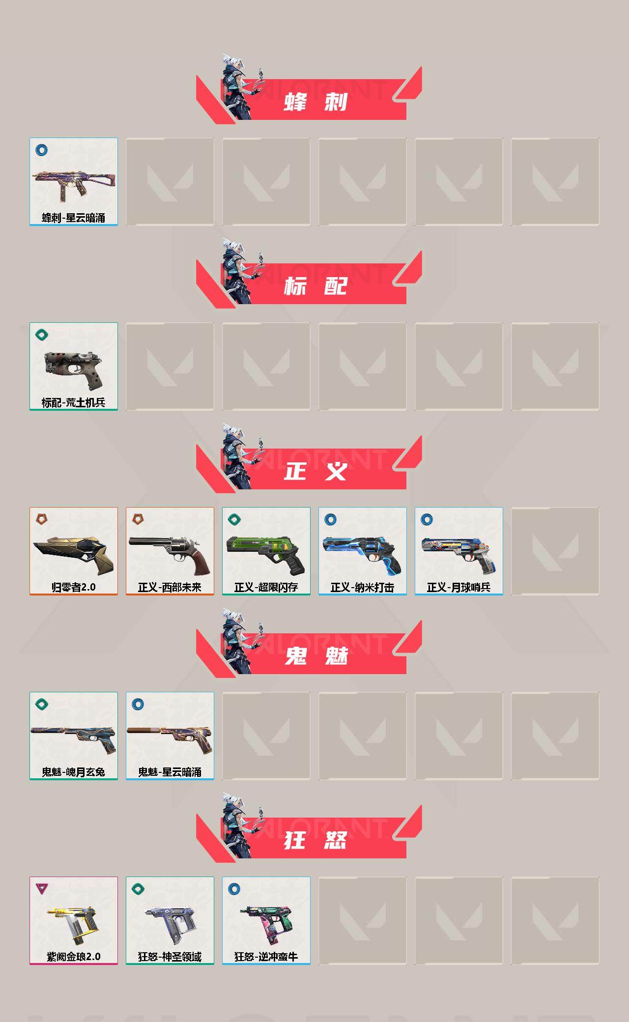 【47】【英雄】:幻棱,炼狱,维斯,暮蝶,钛狐,壹决,铁臂,捷风,雷兹,幽影,不死鸟,贤者,猎枭,蝰蛇,零,芮娜,奇乐,尚勃勒,霓虹,斯凯,夜露,星礈,k/o,海神,盖可,黑梦,钢锁 【近战 武器】:近战武器-侦察力量 蝴蝶刀,近战武器-紫金爪刀,近战武器-威龙之刃,近战武器-荒土机兵 热能刀,近战武器-神圣领域 战刀 【狂徒】:狂徒-混沌序曲,狂徒-奇点//2.0,狂徒-堕天遗武,狂徒-荒土机兵 【幻影】:幻影-洪荒怒焰,幻影-侦察力量,幻影-神圣领域,幻影-纳米打击 【戍卫】:戍卫-掠影,戍卫-逆冲蛮牛,戍卫-月球哨兵 【獠犬】:獠犬-神圣领域,獠犬-逆冲蛮牛 【冥驹】:冥驹-荒土机兵,冥驹-多边形,冥驹-星云暗涌 【莽侠】:莽侠-月球哨兵 【战神】:战神-神圣领域 【奥丁】:奥丁-纳米打击 【判官】:判官-纳米打击x 【雄鹿】:雄鹿-逆冲蛮牛,雄鹿-月球哨兵 【骇灵】:骇灵-荒土机兵,骇灵-星云暗涌 【蜂刺】:蜂刺-星云暗涌 【标配】:标配-荒土机兵 【正义】:正义-归零者//2.0,正义-西部未来,正义-超限闪存,正义-纳米打击,正义-月球哨兵 【鬼魅】:鬼魅-魄月玄兔,鬼魅-星云暗涌 【狂怒】:狂怒-紫阙金琅//2.0,狂怒-神圣领域,狂怒-逆冲蛮牛 【卡面】:终章:激斗汉堡 卡面,进入射程 卡面,分崩离析 卡面,纳米打击 卡面,抑制技术 卡面,激斗汉堡 卡面,瓦娃脸雪糕 p2 卡面,从黄昏到黎明 卡面,荒土机兵 卡面,银弹猎手 卡面,逆冲蛮牛 卡面,《双城之战》拥抱 卡面,精灵大战 卡面,欢迎来到底城 卡面,南瓜盛典 卡面,vct cn首冠 卡面,修车达人 卡面,热舞环节 卡面,正义的化身 卡面,复活专家 卡面,树懒大作战 卡面,无畏契约go!第一卷:芮娜 卡面,复古浪潮 卡面,无畏契约go!第一卷:零 卡面,同步耍酷 卡面,黑影先生的咖啡! 卡面,代号红色 卡面,新兵报到 卡面,v契约 卡面,无畏契约 卡面 【喷漆】:小小心意 喷漆,战“素”兔 喷漆,宇宙的指引 喷漆,请求重启 喷漆,逆冲蛮牛 喷漆,纳米打击 喷漆,鼻尖上的蝴蝶 喷漆,简笔画黯兽 喷漆,独守蝰腹 喷漆,他们将落荒而逃 喷漆,通缉:战术企鹅 喷漆,荒土机兵 喷漆,别挡我吃球! 喷漆,嗨宝南瓜灯 喷漆,嘭! 喷漆,都算到了 喷漆,控场勿近 喷漆,小丑猫 喷漆,熊抱 喷漆,蛋糕还是爆能器? 喷漆,买装还是存钱 喷漆,暴走萝莉 喷漆,胜利属于无畏契约 喷漆,glhf 喷漆,无畏契约 喷漆 【挂饰】:终章:猫猫木乃伊 挂饰,荒土机兵 挂饰,悠闲鸡块 挂饰,猫猫木乃伊 挂饰,水壶 挂饰,纳米打击 挂饰,逆冲蛮牛 挂饰,可爱糖糖 挂饰,伞绳 挂饰,《双城之战》小蛋糕 挂饰,第九季//第三幕 纪念币 挂饰,工具腰带 挂饰,无畏契约go!第一卷 芮娜 挂饰,无畏契约go!第一卷 零 挂饰,熔岩灯 挂饰,瞬云履 挂饰,第九季//第二幕 纪念币 挂饰,z世代特饮 挂饰,迷你机甲 挂饰,天外飞客 挂饰,无畏契约 纪念币 挂饰