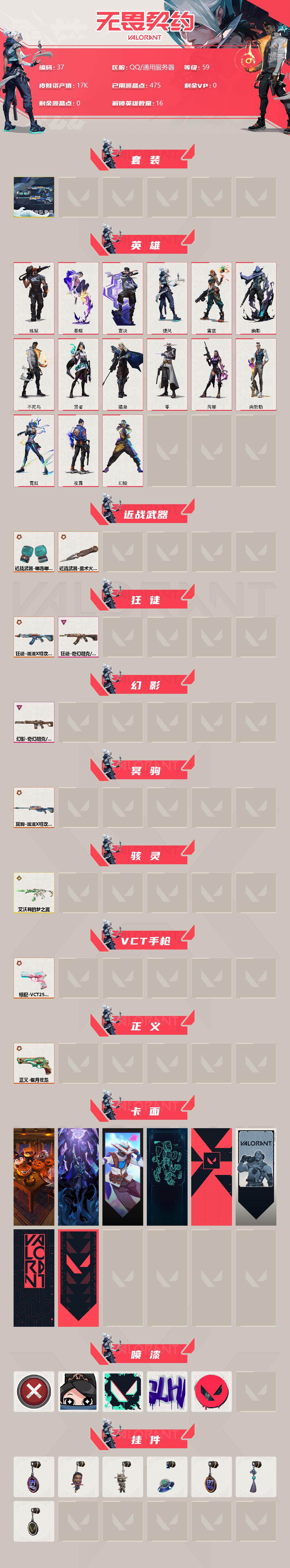 【37】【套装】:滋滋x特攻队套装 【英雄】:幻棱,炼狱,暮蝶,壹决,捷风,雷兹,幽影,不死鸟,贤者,猎枭,零,芮娜,尚勃勒,霓虹,夜露 【近战 武器】:近战武器-魔术火花,近战武器-嘟昂嘟昂超弹力水球拳套,近战武器-魔术火花 【狂徒】:狂徒-滋滋x特攻队,狂徒-奇幻朋克//3.0 【幻影】:幻影-奇幻朋克//3.0 【冥驹】:冥驹-滋滋x特攻队 【骇灵】:骇灵-艾沃莉的梦之翼 【vct手呛】:标配-vct25 x blg 【正义】:正义-偃月苍龙 【卡面】:南瓜盛典 卡面,失而复得 卡面,无畏契约go!第一卷:零 卡面,铁臂设计图 卡面,代号红色 卡面,新兵报到 卡面,v契约 卡面,无畏契约 卡面 【喷漆】:买装还是存钱 喷漆,口袋贤者 喷漆,胜利属于无畏契约 喷漆,glhf 喷漆,无畏契约 喷漆 【挂饰】:第九季//第三幕 纪念币 挂饰,无畏契约go!第一卷 芮娜 挂饰,无畏契约go!第一卷 零 挂饰,天外飞客 挂饰,第七季//第三幕 纪念币 挂饰,幸运中国结 挂饰,无畏契约 纪念币 挂饰