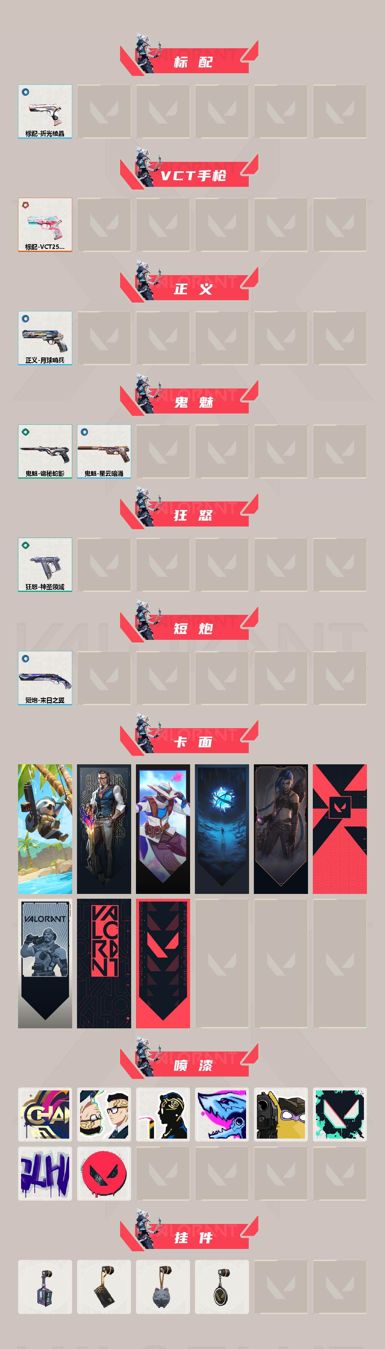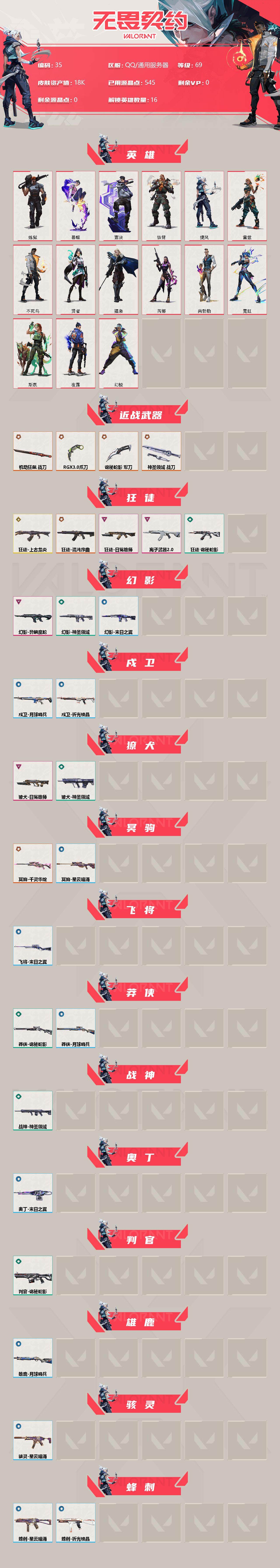 【35】【英雄】:幻棱,炼狱,暮蝶,壹决,铁臂,捷风,雷兹,不死鸟,贤者,猎枭,芮娜,尚勃勒,霓虹,斯凯,夜露 【近战 武器】:近战武器-rgx 11z pro//3.0 爪刀,近战武器-机动狂飙 战刀,近战武器-诡秘蛇影 军刀,近战武器-神圣领域 战刀 【狂徒】:狂徒-上古龙炎,狂徒-混沌序曲,狂徒-日冕雄师,狂徒-离子武器//2.0,狂徒-诡秘蛇影 【幻影】:幻影-异鳞魔蛇,幻影-神圣领域,幻影-末日之翼 【戍卫】:戍卫-月球哨兵,戍卫-折光棱晶 【獠犬】:獠犬-日冕雄师,獠犬-神圣领域 【冥驹】:冥驹-千灵华绽,冥驹-星云暗涌 【飞将】:飞将-末日之翼 【莽侠】:莽侠-诡秘蛇影,莽侠-月球哨兵 【战神】:战神-神圣领域 【奥丁】:奥丁-末日之翼 【判官】:判官-诡秘蛇影 【雄鹿】:雄鹿-月球哨兵 【骇灵】:骇灵-星云暗涌 【蜂刺】:蜂刺-星云暗涌,蜂刺-折光棱晶 【标配】:标配-折光棱晶 【vct手呛】:标配-vct25 x blg 【正义】:正义-月球哨兵 【鬼魅】:鬼魅-诡秘蛇影,鬼魅-星云暗涌 【狂怒】:狂怒-神圣领域 【短炮】:短炮-末日之翼 【卡面】:树懒大作战 卡面,无畏契约:尚勃勒 卡面,无畏契约go!第一卷:零 卡面,无垠星环 卡面,《双城之战》金克丝 卡面,代号红色 卡面,新兵报到 卡面,v契约 卡面,无畏契约 卡面 【喷漆】:尚勃勒 喷漆,分身有术 喷漆,致命优雅 喷漆,暴走萝莉 喷漆,放下武器 喷漆,胜利属于无畏契约 喷漆,glhf 喷漆,无畏契约 喷漆 【挂饰】:动力机箱 挂饰,有事联系 挂饰,《双城之战》魄罗 挂饰,无畏契约 纪念币 挂饰