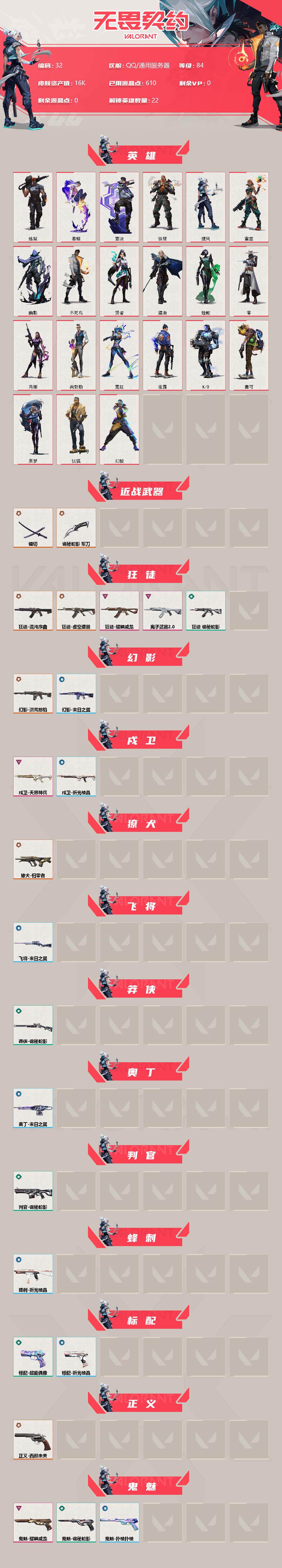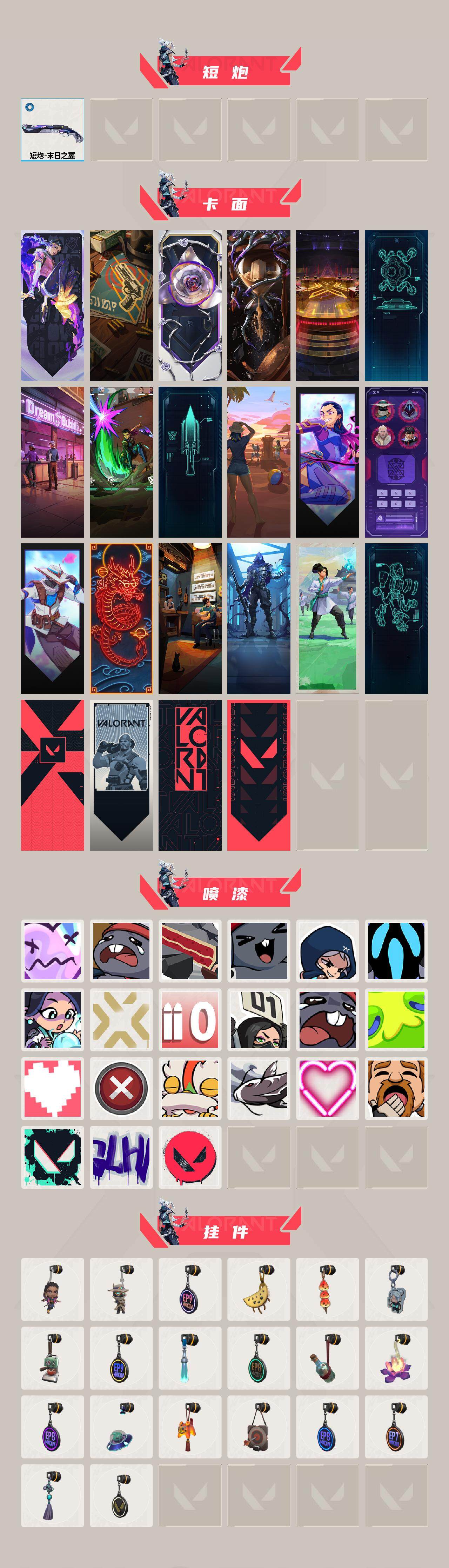 【32】【英雄】:幻棱,炼狱,暮蝶,钛狐,壹决,铁臂,捷风,雷兹,幽影,不死鸟,贤者,猎枭,蝰蛇,零,芮娜,尚勃勒,霓虹,夜露,k/o,盖可,黑梦 【近战 武器】:近战武器-镭切,近战武器-诡秘蛇影 军刀 【狂徒】:狂徒-混沌序曲,狂徒-虚空遗器,狂徒-耀鳞威龙,狂徒-离子武器//2.0,狂徒-诡秘蛇影 【幻影】:幻影-洪荒怒焰,幻影-末日之翼 【戍卫】:戍卫-天界神兵,戍卫-折光棱晶 【獠犬】:獠犬-归零者 【飞将】:飞将-末日之翼 【莽侠】:莽侠-诡秘蛇影 【奥丁】:奥丁-末日之翼 【判官】:判官-诡秘蛇影 【蜂刺】:蜂刺-折光棱晶 【标配】:标配-超能偶像,标配-折光棱晶 【正义】:正义-西部未来 【鬼魅】:鬼魅-耀鳞威龙,鬼魅-诡秘蛇影,鬼魅-扑棱扑棱 【短炮】:短炮-末日之翼 【卡面】:无畏契约:暮蝶 卡面,正义的化身 卡面,铁之华 卡面,时间到 卡面,最高舞台 卡面,声感陷阱设计图 卡面,梦幻奶茶 卡面,源能反应 卡面,零点嗅探设计图 卡面,沙雕爆能器 卡面,无畏契约go!第一卷:芮娜 卡面,清除名单 卡面,无畏契约go!第一卷:零 卡面,龍记 卡面,完美调谐 卡面 ,暗呛 卡面,夯实根基 卡面,铁臂设计图 卡面,代号红色 卡面,新兵报到 卡面,v契约 卡面,无畏契约 卡面 【喷漆】:伤心心 喷漆,熊抱 喷漆,蛋糕还是爆能器? 喷漆,超级粉丝 喷漆,捷风差距 喷漆,惊声尖叫 喷漆,水晶球 喷漆,2021冠军巡回赛花火 喷漆,拼一呛 喷漆,我觉得不行 喷漆,我的刀呢? 喷漆,uwu 喷漆,双击点赞 喷漆,买装还是存钱 喷漆,醒狮贺春 喷漆,松叶 喷漆,蕊形灯 喷漆,老铁困了 喷漆,胜利属于无畏契约 喷漆,glhf 喷漆,无畏契约 喷漆 【挂饰】:无畏契约go!第一卷 芮娜 挂饰,无畏契约go!第一卷 零 挂饰,第九季//第二幕 纪念币 挂饰,终章:这瓜保熟 挂饰,糖葫芦 挂饰,袖珍捷风 挂饰,迷你浓缩 挂饰,第九季//第一幕 纪念币 挂饰,荧光棒 挂饰,第八季//第三幕 纪念币 挂饰,瓶中信 挂饰,传世莲华 挂饰,第八季//第二幕 纪念币 挂饰 ,天外飞客 挂饰,好运福爪 挂饰,瞄这里 挂饰,第八季//第一幕 纪念币 挂饰,第七季//第三幕 纪念币 挂饰,幸运中国结 挂饰,无畏契约 纪念币 挂饰