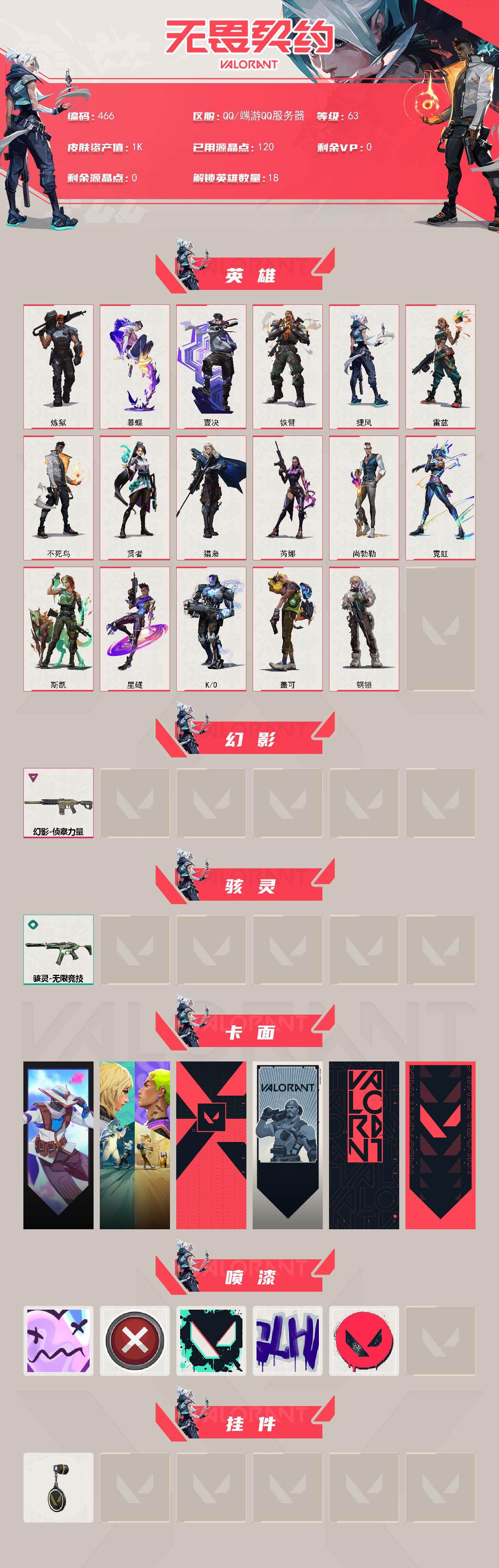 [14254271]【英雄】:炼狱,暮蝶,壹决,铁臂,捷风,雷兹,不死鸟,贤者,猎枭,芮娜,尚勃勒,霓虹,斯凯,星礈,k/o,盖可,钢锁 【幻影】:幻影-侦察力量 【骇灵】:骇灵-无限竞技 【卡面】:无畏契约go!第一卷:零 卡面,钢锁vs盖可 卡面,代号红色 卡面,新兵报到 卡面,v契约 卡面,无畏契约 卡面 【喷漆】:伤心心 喷漆,买装还是存钱 喷漆,胜利属于无畏契约 喷漆,glhf 喷漆,无畏契约 喷漆 【挂饰】:无畏契约 纪念币 挂饰