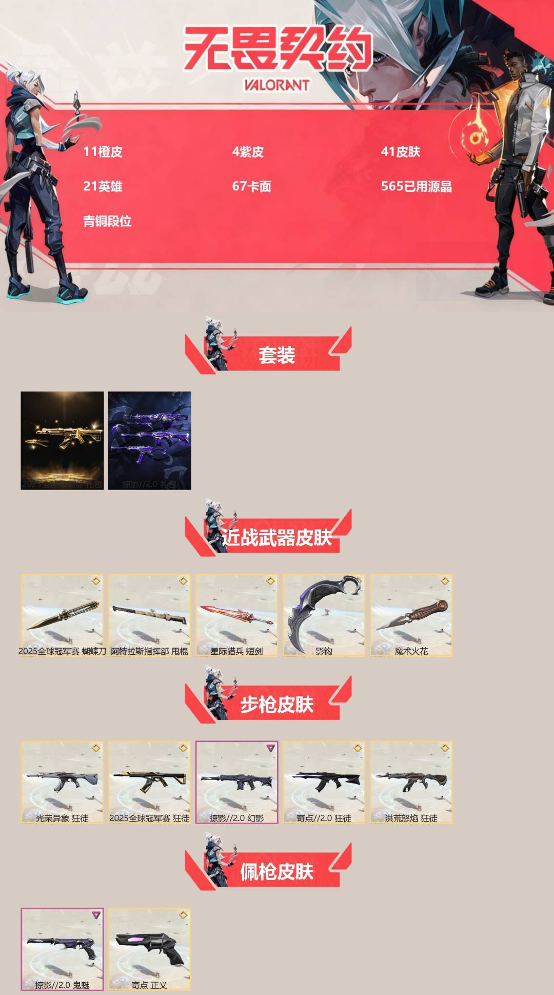 [14257161]11橙皮 4紫皮 41皮肤 21英雄 67卡面 565已用源晶 青铜段位 【套装】:2025全球冠军赛掠影2.0套装 【近战武器皮肤】:阿特拉斯指挥部星际猎兵 短剑魔术火花影钩2025全球冠军赛 蝴蝶刀 【佩呛皮肤】:鬼魅-掠影2.0正义-奇点 【冲锋呛皮肤】:骇灵