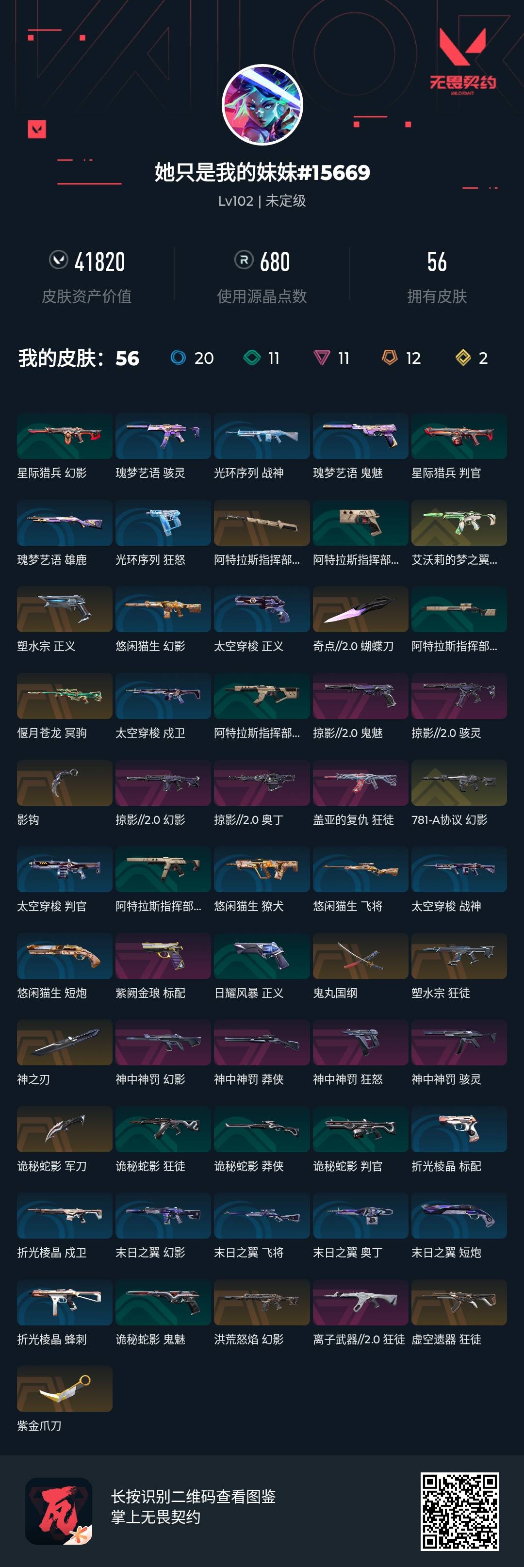 [14257704]b189730(掠影//2.0套装/神中神罚套装)无畏契约/102等级/未定级/27英雄/56皮肤/41820资产/已使用r点680/剩余r点50/掠影//2.0-幻影掠影//2.0-奥丁掠影//2.0-骇灵掠影//2.0-鬼魅影钩/神中神罚-幻影神中神罚-莽侠神中神罚-骇灵神中神罚-狂怒神之刃/阿特拉斯指挥部-甩棍,诡秘蛇影-军刀,奇点//2.0-蝴蝶刀,鬼丸国纲,紫金爪刀,虚空遗器-狂徒,洪荒怒焰-幻影,塑水宗-狂徒,781-a协议-幻影,离子武器//2.0-狂徒,盖亚的复仇-狂徒,偃月苍龙-冥驹,艾沃莉的梦之翼-骇灵,塑水宗-正义,紫阙金琅-标配