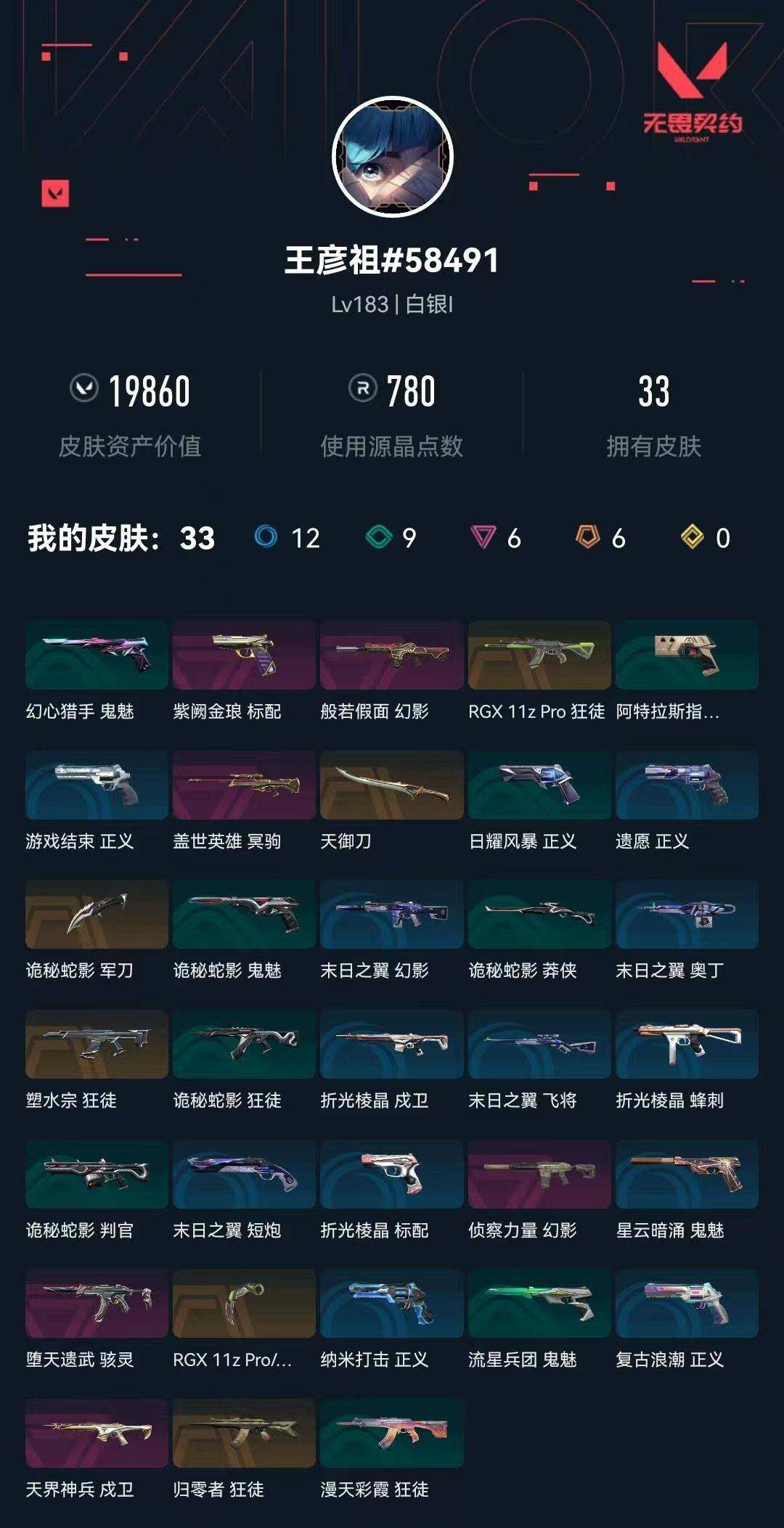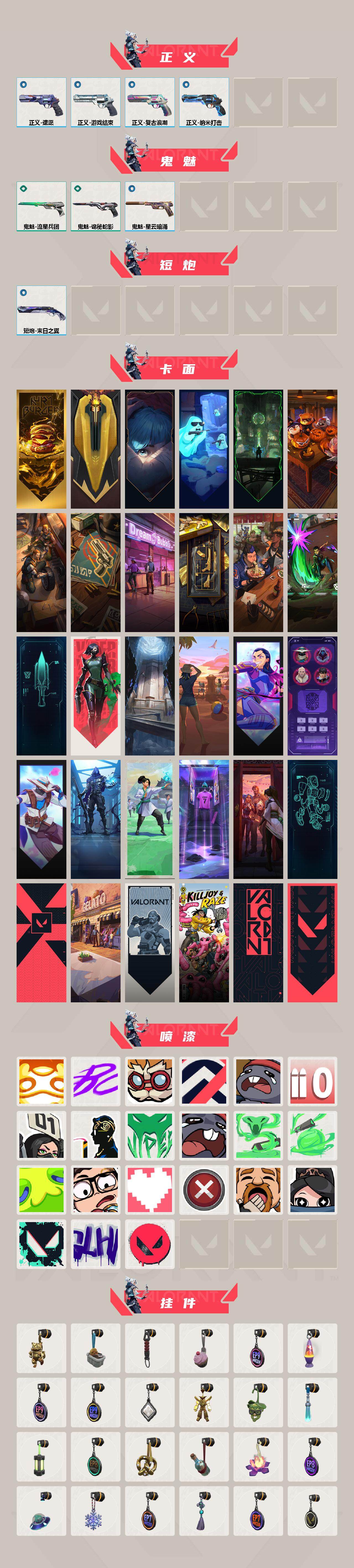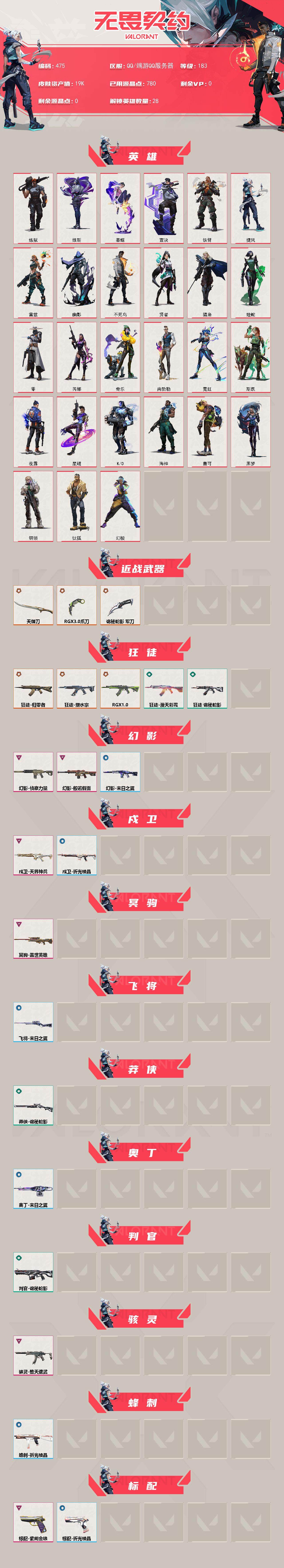 [14258862]【英雄】:幻棱,炼狱,维斯,暮蝶,钛狐,壹决,铁臂,捷风,雷兹,幽影,不死鸟,贤者,猎枭,蝰蛇,零,芮娜,奇乐,尚勃勒,霓虹,斯凯,夜露,星礈,k/o,海神,盖可,黑梦,钢锁 【近战 武器】:近战武器-rgx 11z pro//3.0 爪刀,近战武器-天御刀,近战武器-诡秘蛇影 军刀 【狂徒】:狂徒-归零者,狂徒-塑水宗,狂徒-rgx 11z pro,狂徒-漫天彩霞,狂徒-诡秘蛇影 【幻影】:幻影-般若假面,幻影-侦察力量,幻影-末日之翼 【戍卫】:戍卫-天界神兵,戍卫-折光棱晶 【冥驹】:冥驹-盖世英雄 【飞将】:飞将-末日之翼 【莽侠】:莽侠-诡秘蛇影 【奥丁】:奥丁-末日之翼 【判官】:判官-诡秘蛇影 【骇灵】:骇灵-堕天遗武 【蜂刺】:蜂刺-折光棱晶 【标配】:标配-紫阙金琅,标配-折光棱晶 【正义】:正义-复古浪潮,正义-纳米打击,正义-遗愿,正义-游戏结束 【鬼魅】:鬼魅-流星兵团,鬼魅-诡秘蛇影,鬼魅-星云暗涌 【短炮】:短炮-末日之翼 【卡面】:终章:激斗汉堡 卡面,进入射程 卡面,《双城之战》拥抱 卡面,精灵大战 卡面,欢迎来到底城 卡面,南瓜盛典 卡面,修车达人 卡面,正义的化身 卡面,梦幻奶茶 卡面,终章:打造专属狂徒 卡面,趁热吃 卡面,源能反应 卡面,零点嗅探设计图 卡面,无畏契约:蝰蛇 卡面,表象之下 卡面,沙雕爆能器 卡面,无畏契约go!第一卷:芮娜 卡面,清除名单 卡面,无畏契约go!第一卷:零 卡面,暗呛 卡面,夯实根基 卡面,"luie" 卡面,热烈欢迎 卡面,铁臂设计图 卡面,代号红色 卡面,冰淇淋店 卡面,新兵报到 卡面,友军火力 卡面,v契约 卡面,无畏契约 卡面 【喷漆】:嗨宝南瓜灯 喷漆,嘭! 喷漆,都算到了 喷漆,控场勿近 喷漆,熊抱 喷漆,拼一呛 喷漆,我觉得不行 喷漆,致命优雅 喷漆,蝰蛇 喷漆,我的刀呢? 喷漆,致命毒素 喷漆,喜欢哪种毒? 喷漆,uwu 喷漆,新潮流 喷漆,双击点赞 喷漆,买装还是存钱 喷漆,老铁困了 喷漆,口袋贤者 喷漆,胜利属于无畏契约 喷漆,glhf 喷漆,无畏契约 喷漆 【挂饰】:终章:猫猫木乃伊 挂饰,悠闲鸡块 挂饰,伞绳 挂饰,《双城之战》小蛋糕 挂饰,第九季//第三幕 纪念币 挂饰,熔岩灯 挂饰,第九季//第二幕 纪念币 挂饰,第九季//第一幕 纪念币 挂饰,第八季:白银 挂饰,