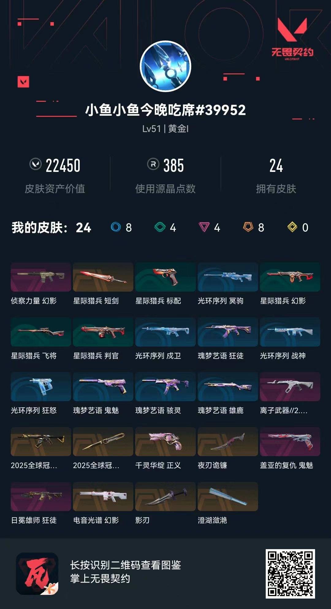 8橙皮 4紫皮 24皮肤 19英雄 45卡面 385已用源晶 黄金段位 【套装】:2025全球冠军赛 【近战武器皮肤】:夜刃诡镰影刃星际猎兵 短剑2025全球冠军赛 蝴蝶刀澄湖潋滟 【佩呛皮肤】:正义-千灵华绽鬼魅-盖亚的复仇 【步呛皮肤】:狂徒-离子武器2.02025全球冠军赛 狂徒