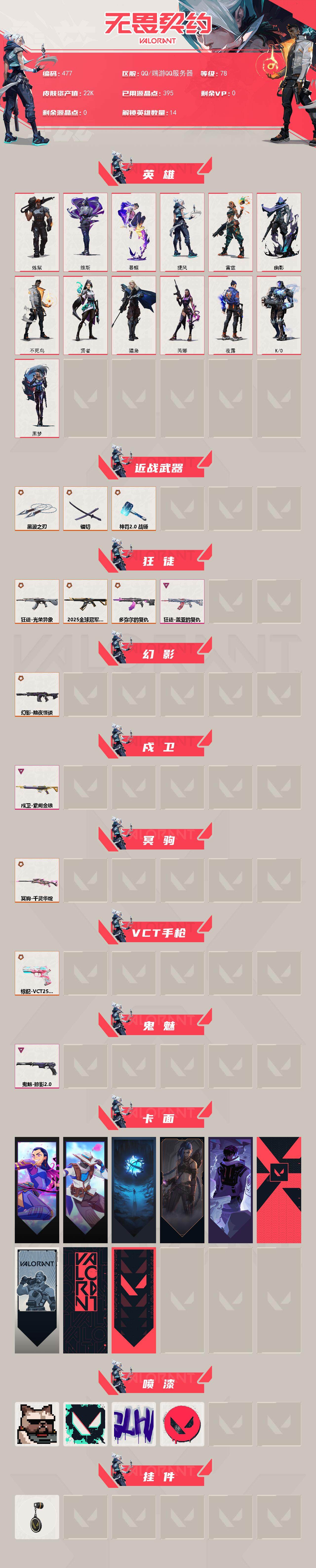 [14259689]【英雄】:炼狱,维斯,暮蝶,捷风,雷兹,幽影,不死鸟,贤者,猎枭,芮娜,夜露,k/o,黑梦 【近战 武器】:近战武器-黑波之刃,近战武器-镭切,近战武器-神罚//2.0 战锤 【狂徒】:狂徒-2025全球冠军赛,狂徒-光荣异象,狂徒-多弥尔的复仇,狂徒-盖亚的复仇 【幻影】:幻影-黯夜怪谈 【戍卫】:戍卫-紫阙金琅 【冥驹】:冥驹-千灵华绽 【vct手呛】:标配-vct25 x blg 【鬼魅】:鬼魅-掠影//2.0 【卡面】:无畏契约go!第一卷:芮娜 卡面,无畏契约go!第一卷:零 卡面,无垠星环 卡面,《双城之战》金克丝 卡面,逆向独行 卡面 ,代号红色 卡面,新兵报到 卡面,v契约 卡面,无畏契约 卡面 【喷漆】:关门放狗 喷漆,胜利属于无畏契约 喷漆,glhf 喷漆,无畏契约 喷漆 【挂饰】:无畏契约 纪念币 挂饰