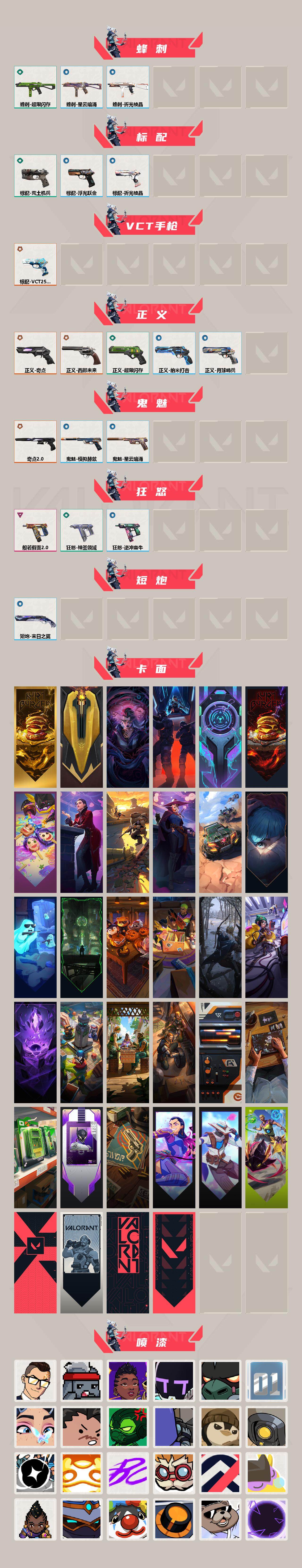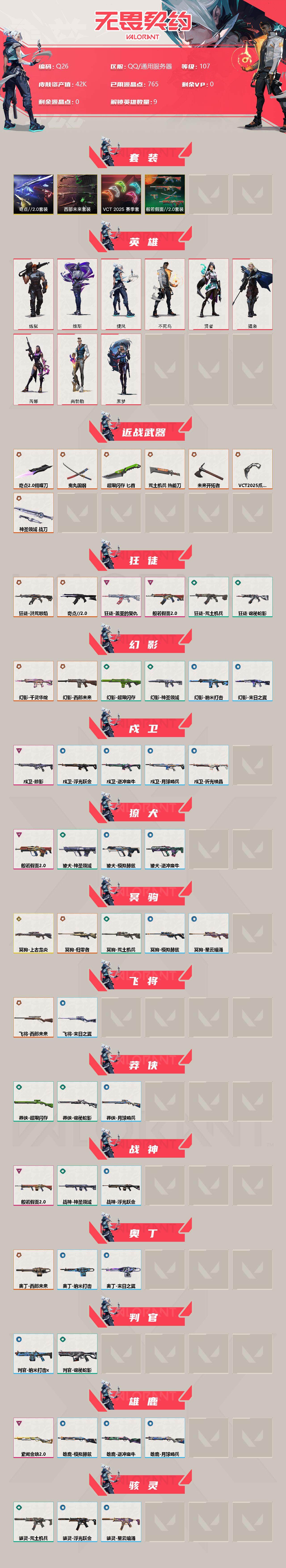 [14263405]【套装】:西部未来套装,vct 2025 赛季套装,奇点//2.0套装,般若假面//2.0套装 【英雄】:炼狱,维斯,捷风,不死鸟,贤者,猎枭,芮娜,尚勃勒,黑梦 【近战 武器】:近战武器-vct 2025 爪刀,近战武器-奇点//2.0 蝴蝶刀,近战武器-鬼丸国纲,近战武器-未来开拓者,近战武器-超限闪存 匕首,近战武器-荒土机兵 热能刀,近战武器-神圣领域 战刀 【狂徒】:狂徒-洪荒怒焰,狂徒-奇点//2.0,狂徒-般若假面//2.0,狂徒-盖亚的复仇,狂徒-荒土机兵,狂徒-诡秘蛇影 【幻影】:幻影-千灵华绽,幻影-西部未来,幻影-超限闪存,幻影-神圣领域,幻影-纳米打击,幻影-末日之翼,幻影-西部未来 【戍卫】:戍卫-掠影,戍卫-浮光跃金,戍卫-逆冲蛮牛,戍卫-月球哨兵,戍卫-折光棱晶 【獠犬】:獠犬-般若假面//2.0,獠犬-神圣领域,獠犬-模拟赫兹,獠犬-逆冲蛮牛 【冥驹】:冥驹-上古龙炎,冥驹-归零者,冥驹-荒土机兵,冥驹-模拟赫兹,冥驹-星云暗涌 【飞将】:飞将-西部未来,飞将-末日之翼 【莽侠】:莽侠-超限闪存,莽侠-诡秘蛇影,莽侠-月球哨兵 【战神】:战神-般若假面//2.0,战神-神圣领域,战神-浮光跃金 【奥丁】:奥丁-西部未来,奥丁-纳米打击,奥丁-末日之翼 【判官】:判官-诡秘蛇影,判官-纳米打击x 【雄鹿】:雄鹿-紫阙金琅//2.0,雄鹿-模拟赫兹,雄鹿-逆冲蛮牛,雄鹿-月球哨兵 【骇灵】:骇灵-荒土机兵,骇灵-浮光跃金,骇灵-星云暗涌 【蜂刺】:蜂刺-超限闪存,蜂刺-星云暗涌,蜂刺-折光棱晶 【标配】:标配-荒土机兵,标配-浮光跃金,标配-折光棱晶 【vct手呛】:标配-vct25 x lev 【正义】:正义-奇点,正义-西部未来,正义-超限闪存,正义-纳米打击,正义-月球哨兵 【鬼魅】:鬼魅-奇点//2.0,鬼魅-模拟赫兹,鬼魅-星云暗涌 【狂怒】:狂怒-般若假面//2.0,狂怒-神圣领域,狂怒-逆冲蛮牛 【短炮】:短炮-末日之翼 【卡面】:终章:激斗汉堡 卡面,进入射程 卡面,分崩离析 卡面,纳米打击 卡面,抑制技术 卡面,激斗汉堡 卡面,瓦娃脸雪糕 p2 卡面,从黄昏到黎明 卡面,荒土机兵 卡面,银弹猎手 卡面,逆冲蛮牛 卡面,《双城之战》拥抱 卡面,精灵大战 卡面,欢迎来到底城 卡面,南瓜盛典 卡面,唱片的故事 卡面,钢弓与箭