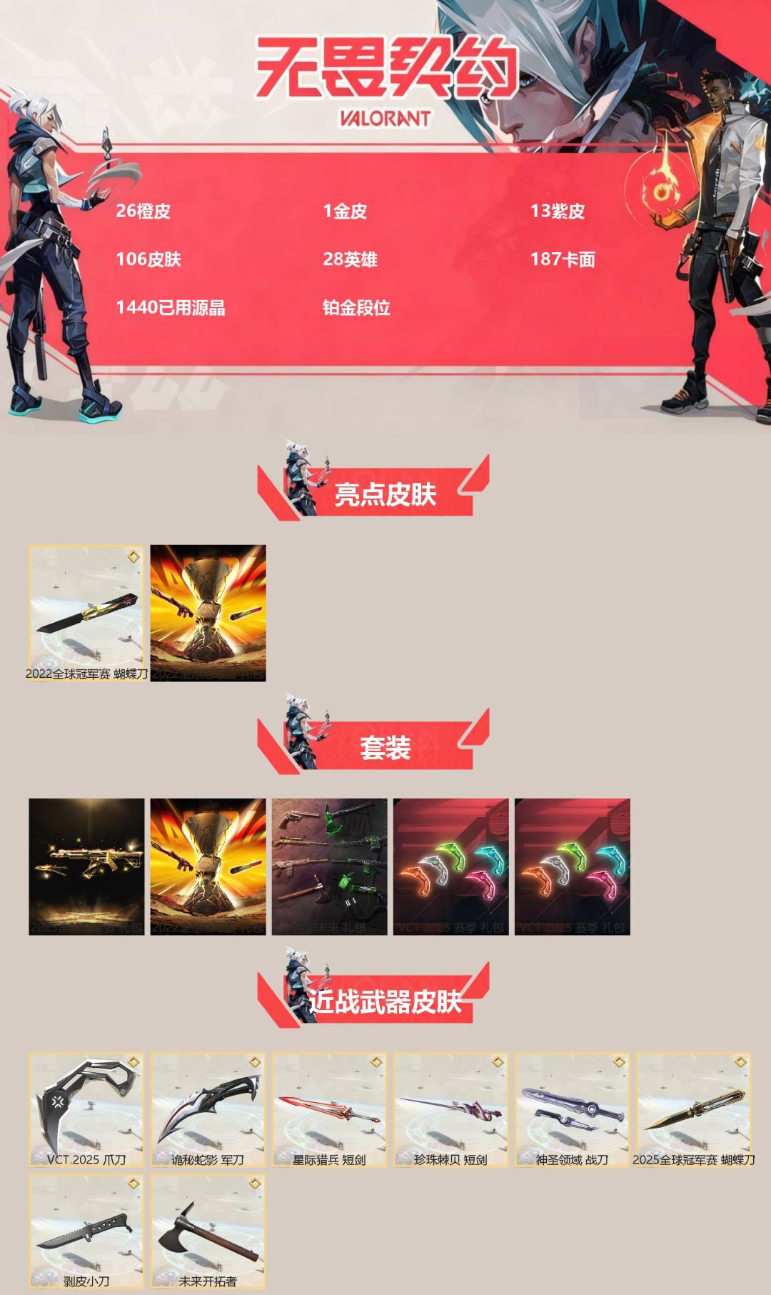 [14267252]26橙皮 1金皮 13紫皮 106皮肤 28英雄 187卡面 1440已用源晶 铂金段位 【亮点皮肤】:幻影-2022全球冠军赛蝴蝶刀-2022全球冠军赛 【套装】:2025全球冠军赛2022全球冠军赛vct 2025赛季礼包西部未来vcn2025套装 【近战武器
