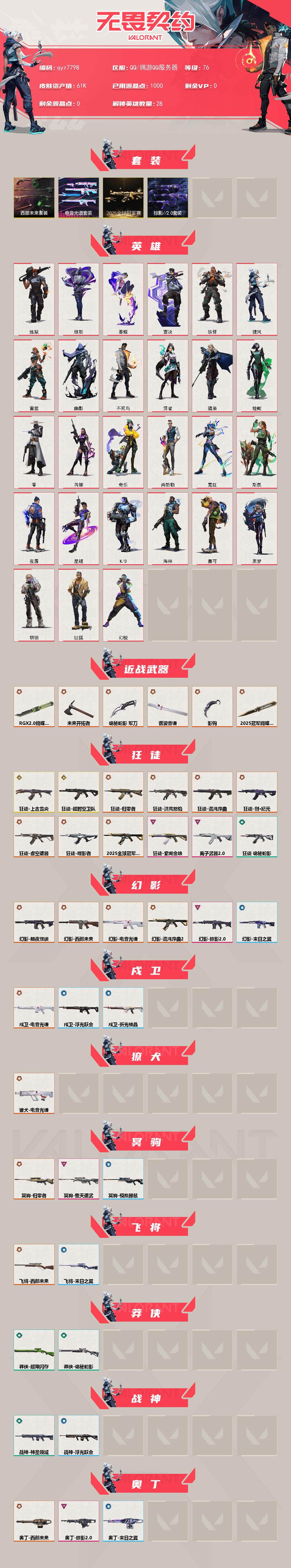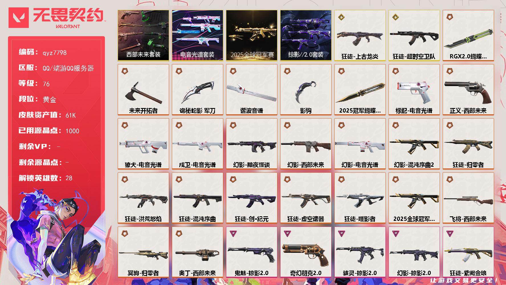 精品76级黄金号-低价捡漏出-喜欢的来吧-qyz7798-套装:-西部未来电音光谱掠影20套装-近战武器皮肤:-rgx-11z-pro//20-蝴蝶刀未来开拓者诡秘蛇影谐波音谱影钩-步呛皮肤:-狂徒-紫阙金琅狂徒-归零者狂徒-洪荒怒焰狂徒-混沌序曲幻影-黯夜怪谈狂徒-上古龙炎狂徒-创纪元幻影-西部未来狂徒-虚空遗器狂徒-噬影者狂徒-离子武器20幻影-电音光谱戍卫-电音光谱獠犬-电音光谱狂徒-超时空卫队幻影-掠影20-佩呛皮肤:-正义-西部未来正义-奇幻朋克20标配-电音光谱鬼魅-掠影20-狙击呛皮肤:-冥驹-归零者冥驹-堕天遗武飞将-西部未来-冲锋呛皮肤:-骇灵-掠影20-机呛皮肤:-奥丁-西部未来奥丁-掠影20-亮点:-【qyz7798】【套装】:2025全球冠军赛套装,电音光谱套装,西部未来套装,掠影//20套装【英雄】:幻棱,炼狱,维斯,暮蝶,钛狐,壹决,铁臂,捷风,雷兹,幽影,不死鸟,贤者,猎枭,蝰蛇,零,芮娜,奇乐,尚勃勒,霓虹,斯凯,夜露,星礈,k/o,海神,盖可,黑梦,钢锁【近战-武器】:近战武器-2025全球冠军赛-蝴蝶刀,近战武器-影钩,近战武器-谐波音谱,近战武器-rgx-11z-pro//20-蝴蝶刀,近战武器-未来开拓者,近战武器-诡秘蛇影-军刀【狂徒】:狂徒-上古龙炎,狂徒-超时空卫队,狂徒-2025全球冠军赛,狂徒-归零者,狂徒-洪荒怒焰,狂徒-混沌序曲,狂徒-创纪元,狂徒-虚空遗器,狂徒-噬影者,狂徒-紫阙金琅,狂徒-离子武器//20,狂徒-诡秘蛇影【幻影】:幻影-黯夜怪谈,幻影-西部未来,幻影-电音光谱,幻影-混沌序曲//20,幻影-掠影//20,幻影-末日之翼,幻影-西部未来,幻影-电音光谱【戍卫】:戍卫-电音光谱,戍卫-浮光跃金,戍卫-折光棱晶,戍卫-电音光谱【獠犬】:獠犬-电音光谱,獠犬-电音光谱【冥驹】:冥驹-归零者,冥驹-堕天遗武,冥驹-模拟赫兹【飞将】:飞将-西部未来,飞将-末日之翼【莽侠】:莽侠-超限闪存,莽侠-诡秘蛇影【战神】:战神-神圣领域,战神-浮光跃金【奥丁】:奥丁-西部未来,奥丁-掠影//20,奥丁-末日之翼【判官】:判官-诡秘蛇影【雄鹿】:雄鹿-模拟赫兹,雄鹿-月球哨兵【骇灵】:骇灵-掠影//20,骇灵-浮光跃金,骇灵-星云暗涌【蜂刺】:蜂刺-超限闪存,蜂刺-星云暗