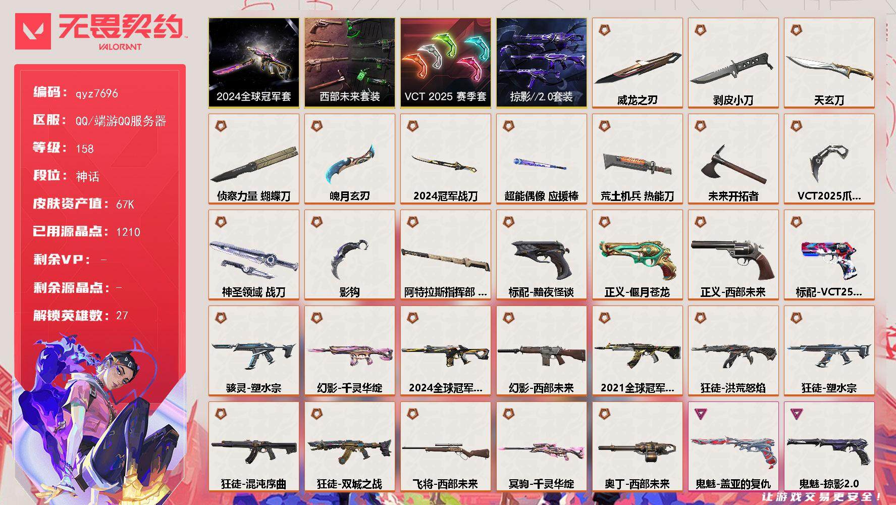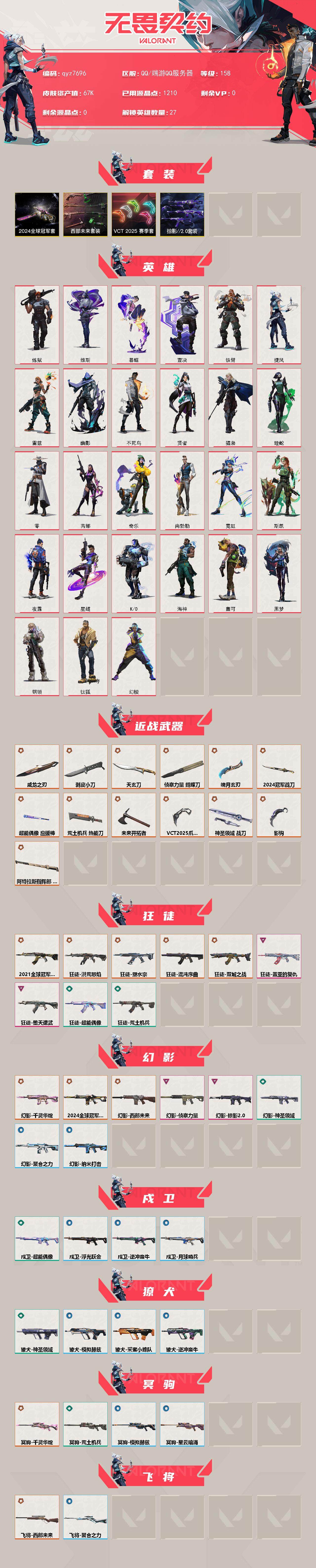 【qyz7696】精品神话号-21狂徒/24套/掠夺套/25爪刀-低价捡漏喜欢的来吧-qyz7696-lv158-神话i,-刀皮数量13,呛皮数量88;皮肤资产价值67850,已用r点1210;【刀皮】:近战武器-2024全球冠军赛战刀,近战武器-vct2025爪刀,近战武器-闪耀之星荧光棒,近战武器-剥皮小刀,近战武器-影钩,近战武器-威龙之刃,近战武器-天玄刀,近战武器-侦察力量蝴蝶刀,近战武器-魄月玄刃,近战武器-荒土机兵热能刀,近战武器-神圣领域战刀,近战武器-未来开拓者,近战武器-阿特拉斯指挥部甩棍;-【呛皮】:标配-vct25xge,狂徒-2021全球冠军赛,狂徒-双城之战,幻影-2024全球冠军赛,标配-黯夜怪谈,正义-偃月苍龙,正义-西部未来,骇灵-塑水宗,狂徒-塑水宗,狂徒-洪荒怒焰,狂徒-混沌序曲,幻影-千灵华绽,幻影-西部未来,冥驹-千灵华绽,飞将-西部未来,奥丁-西部未来,鬼魅-盖亚的复仇,鬼魅-掠影20,正义-掠影,骇灵-堕天遗武,骇灵-掠影20,狂徒-盖亚的复仇,狂徒-堕天遗武,幻影-侦察力量,幻影-掠影20,奥丁-掠影20,战神-盖亚的复仇20,鬼魅-诡秘蛇影,鬼魅-光导纤维,短炮-好搭档,狂徒-阿特拉斯指挥部,狂徒-荒土机兵,狂徒-超能偶像,幻影-神圣领域,戍卫-超能偶像,獠犬-神圣领域,冥驹-荒土机兵,莽侠-阿特拉斯指挥部,莽侠-超限闪存,标配-阿特拉斯指挥部,标配-荒土机兵,标配-超能偶像,狂怒-神圣领域,骇灵-阿特拉斯指挥部,骇灵-荒土机兵,蜂刺-超限闪存,判官-超能偶像,战神-神圣领域,幻影-悠闲猫生,幻影-纳米打击,幻影-聚合之力,戍卫-太空穿梭,戍卫-月球哨兵,戍卫-逆冲蛮牛,戍卫-浮光跃金,獠犬-悠闲猫生,獠犬-逆冲蛮牛,獠犬-模拟赫兹,獠犬-采蜜小蜂队,冥驹-星云暗涌,冥驹-模拟赫兹,莽侠-月球哨兵,飞将-悠闲猫生,飞将-聚合之力,正义-太空穿梭,正义-月球哨兵,正义-纳米打击,鬼魅-星云暗涌,鬼魅-模拟赫兹,鬼魅-采蜜小蜂队,标配-浮光跃金,短炮-悠闲猫生,狂怒-逆冲蛮牛,狂怒-聚合之力,骇灵-星云暗涌,骇灵-浮光跃金,蜂刺-星云暗涌,蜂刺-聚合之力,判官-太空穿梭,判官-纳米打击,判官-采蜜小蜂队,雄鹿-月球哨兵,雄鹿-逆冲蛮牛,雄鹿-模拟赫兹,奥丁-纳米打击,战神-太空穿梭,战神-浮光跃金,战神-采蜜