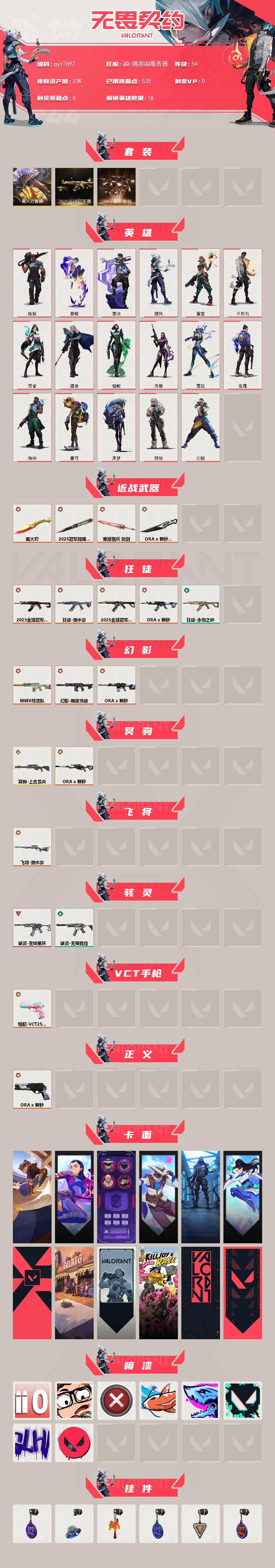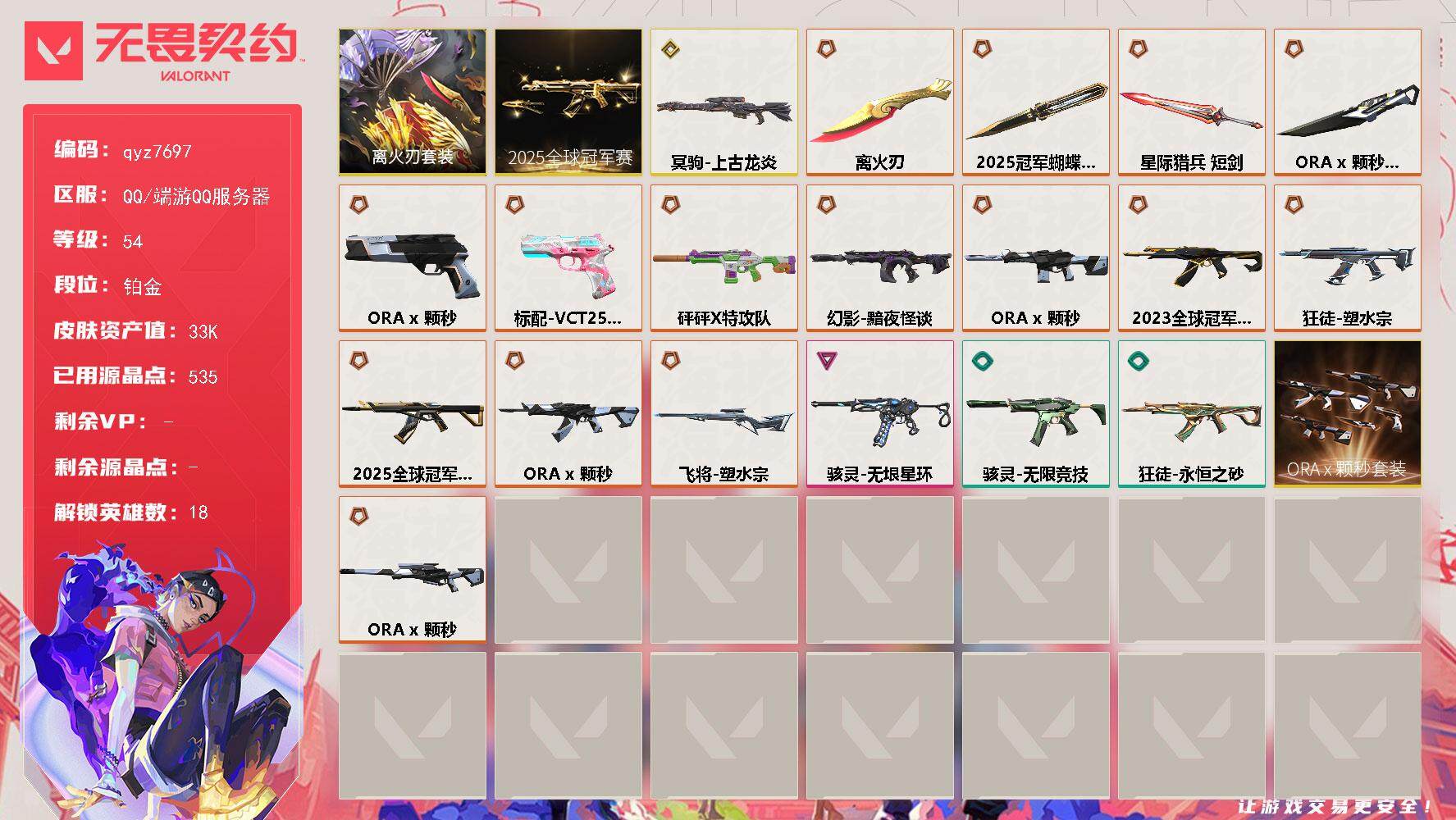 【qyz7697】精品铂金号-25套/离火/23狂徒/颗秒套-喜欢的来吧-低价-qyz7697-lv54-铂金i,-刀皮数量5,呛皮数量38;皮肤资产价值33600,已用r点535;【刀皮】:近战武器-2025全球冠军赛蝴蝶刀,近战武器-离火刃,近战武器-星际猎兵短剑,近战武器-碎心裂刃,近战武器-ax颗秒军刀;-【呛皮】:标配-vct25xblg,狂徒-2025全球冠军赛,狂徒-2023全球冠军赛,狂徒-塑水宗,幻影-砰砰x特攻队,幻影-黯夜怪谈,飞将-塑水宗,冥驹-上古龙炎,骇灵-无垠星环,标配-星际猎兵,骇灵-无限竞技,判官-星际猎兵,狂徒-永恒之砂,幻影-星际猎兵,飞将-星际猎兵,狂徒-ax颗秒,幻影-ax颗秒,冥驹-ax颗秒,正义-ax颗秒,狂徒-幻心猎手,鬼魅-幻心猎手,狂徒-瑰梦艺语,幻影-甜心猎手,戍卫-甜心猎手,戍卫-光环序列,獠犬-诛心猎手,冥驹-诛心猎手,冥驹-光环序列,莽侠-甜心猎手,正义-诛心猎手,鬼魅-瑰梦艺语,短炮-甜心猎手,狂怒-光环序列,骇灵-瑰梦艺语,蜂刺-甜心猎手,雄鹿-瑰梦艺语,奥丁-诛心猎手,战神-光环序列;【热门卡面】:ax颗秒卡面,万圣夜卡面,vct25xblg卡面,势不可挡贤者卡面,势不可挡蝰蛇卡面,势不可挡捷风卡面,离火刃凰卡面,离火刃凤卡面;【热门挂饰】:ax颗秒挂饰,vctxblg挂饰;【热门喷漆】:ax颗秒喷漆,买装还是存钱喷漆,vctxblg喷漆,纸箱小猫喷漆,没有资金喷漆;详情看图【皮肤可能含有某些特权皮肤,具体以游戏内实际拥有为准】