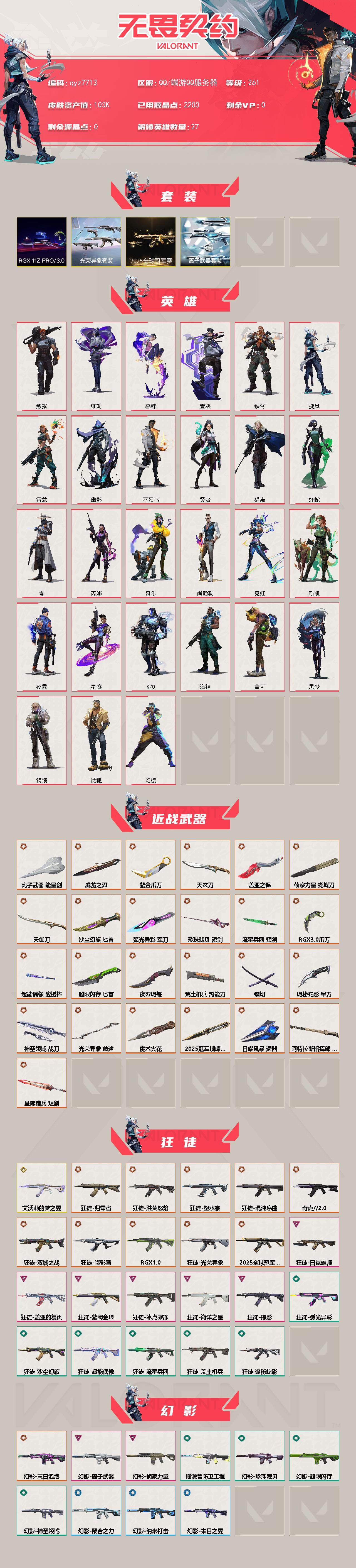 25套装-精品大库存-手慢无-qyz7713-lv261-未定级,-刀皮数量25,呛皮数量189-限定52终极2卓越13-;皮肤资产价值103920,已用r点2200;【刀皮】:近战武器-2025全球冠军赛蝴蝶刀,近战武器-显卡30爪刀,近战武器-闪耀之星荧光棒,近战武器-魔术火花,近战武器-紫金爪刀,近战武器-超限闪存匕首,近战武器-离子武器能量剑,近战武器-夜刃诡镰,近战武器-威龙之刃,近战武器-天玄刀,近战武器-盖亚之愠,近战武器-侦察力量蝴蝶刀,近战武器-天御刀,近战武器-沙尘幻旅匕首,近战武器-弧光异彩军刀,近战武器-珍珠棘贝短剑,近战武器-流星兵团短剑,近战武器-荒土机兵热能刀,近战武器-诡秘蛇影军刀,近战武器-神圣领域战刀,近战武器-镭切,近战武器-光荣异象歧途,近战武器-日耀风暴遗器,近战武器-阿特拉斯指挥部甩棍,近战武器-星际猎兵短剑;-【呛皮】:标配-vct25xg2,狂徒-2025全球冠军赛,狂徒-双城之战,标配-黯夜怪谈,标配-光荣异象,鬼魅-破败军械,正义-显卡30,正义-奇点,正义-塑水宗,正义-千灵华绽,正义-毁灭骑士,正义-西部未来,判官-光荣异象,狂徒-奇点20,狂徒-塑水宗,狂徒-归零者,狂徒-洪荒怒焰,狂徒-混沌序曲,狂徒-噬影者,狂徒-rgx11zpro,狂徒-光荣异象,幻影-末日泡泡,戍卫-破败军械,獠犬-黯夜怪谈,冥驹-光荣异象,飞将-黯夜怪谈,莽侠-显卡30,鬼魅-超时空卫队,狂徒-艾沃莉的梦之翼,鬼魅-天界神兵,正义-离子武器,雄鹿-离子武器,狂徒-掠影,狂徒-日冕雄师,狂徒-盖亚的复仇,狂徒-紫阙金琅,狂徒-冰点凝冻,狂徒-海洋之星,幻影-离子武器,幻影-侦察力量,冥驹-离子武器,冥驹-堕天遗武,标配-星际猎兵,鬼魅-诡秘蛇影,正义-复古浪潮,正义-沙尘幻旅,短炮-弧光异彩,骇灵-流星兵团,骇灵-沙尘幻旅,骇灵-无限竞技,蜂刺-弧光异彩,判官-星际猎兵,判官-诡秘蛇影,雄鹿-复古浪潮,狂徒-诡秘蛇影,狂徒-弧光异彩,狂徒-沙尘幻旅,幻影-星际猎兵,幻影-噬源兽防卫工程,獠犬-复古浪潮,獠犬-弧光异彩,冥驹-复古浪潮,飞将-星际猎兵,飞将-沙尘幻旅,莽侠-诡秘蛇影,标配-彩梦之城,鬼魅-光导纤维,鬼魅-胡桃狂想,鬼魅-信手涂鸦,短炮-深海水族,短炮-蛇吻,狂怒-珍珠棘贝,狂怒-萌彩剪影,狂怒