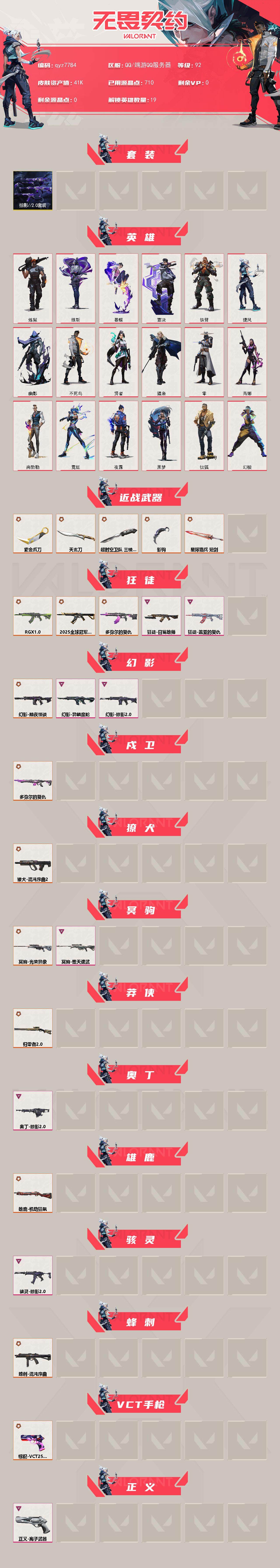 精品铂金号-低价出急出-喜欢的手慢无哦-qyz7784-套装:-掠影20套装-近战武器皮肤:-天玄刀紫金爪刀超时空卫队-三棱军刺影钩-步呛皮肤:-狂徒-盖亚的复仇狂徒-日冕雄师幻影-黯夜怪谈幻影-异鳞魔蛇狂徒-rgx-11z-pro幻影-掠影20-佩呛皮肤:-正义-离子武器标配-vct25xprx鬼魅-掠影20-狙击呛皮肤:-冥驹-堕天遗武莽侠-归零者//20冥驹-光荣异象-冲锋呛皮肤:-蜂刺-混沌序曲骇灵-掠影20-霰弹呛皮肤:-雄鹿-机动狂飙-机呛皮肤:-奥丁-掠影20-亮点:-【qyz7784】【套装】:掠影//20套装【英雄】:幻棱,炼狱,维斯,暮蝶,钛狐,壹决,铁臂,捷风,幽影,不死鸟,贤者,猎枭,零,芮娜,尚勃勒,霓虹,夜露,黑梦【近战-武器】:近战武器-影钩,近战武器-超时空卫队-三棱军刺,近战武器-紫金爪刀,近战武器-天玄刀,近战武器-星际猎兵-短剑【狂徒】:狂徒-2025全球冠军赛,狂徒-rgx-11z-pro,狂徒-多弥尔的复仇,狂徒-盖亚的复仇,狂徒-日冕雄师【幻影】:幻影-黯夜怪谈,幻影-异鳞魔蛇,幻影-掠影//20【戍卫】:戍卫-多弥尔的复仇【獠犬】:獠犬-混沌序曲//20【冥驹】:冥驹-光荣异象,冥驹-堕天遗武【莽侠】:莽侠-归零者//20【奥丁】:奥丁-掠影//20【雄鹿】:雄鹿-机动狂飙【骇灵】:骇灵-掠影//20【蜂刺】:蜂刺-混沌序曲【vct手呛】:标配-vct25-x-prx【正义】:正义-离子武器【鬼魅】:鬼魅-掠影//20,鬼魅-诡秘蛇影【卡面】:《双城之战》拥抱-卡面,欢迎来到底城-卡面,南瓜盛典-卡面,修车达人-卡面,正义的化身-卡面,最高舞台-卡面,归乡-//-蝰蛇-卡面,梦幻奶茶-卡面,流星兵团-卡面,纤云弄巧-卡面,清除名单-卡面,无畏契约go!第一卷:零-卡面,暗呛-卡面,夯实根基-卡面,铁臂设计图-卡面,代号红色-卡面,新兵报到-卡面,v契约-卡面,无畏契约-卡面【喷漆】:嘭!-喷漆,都算到了-喷漆,熊抱-喷漆,超级粉丝-喷漆,捷风差距-喷漆,新潮流-喷漆,双击点赞-喷漆,买装还是存钱-喷漆,蕊形灯-喷漆,暗中偷瞄-喷漆,老铁困了-喷漆,胜利属于无畏契约-喷漆,glhf-喷漆,无畏契约-喷漆【挂饰】:《双城之战》小蛋糕-挂饰,第九季//第三幕-纪念币-挂饰,第九季//第二幕-纪念币-挂饰,袖珍捷风-挂