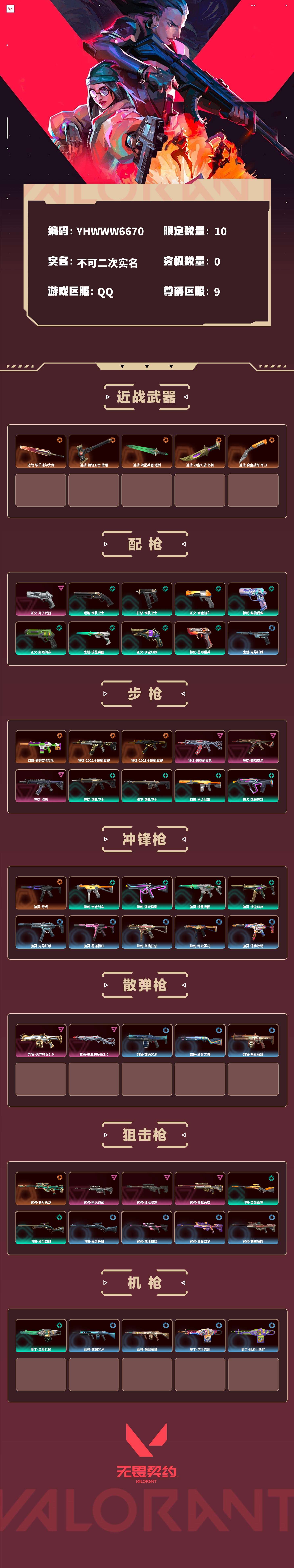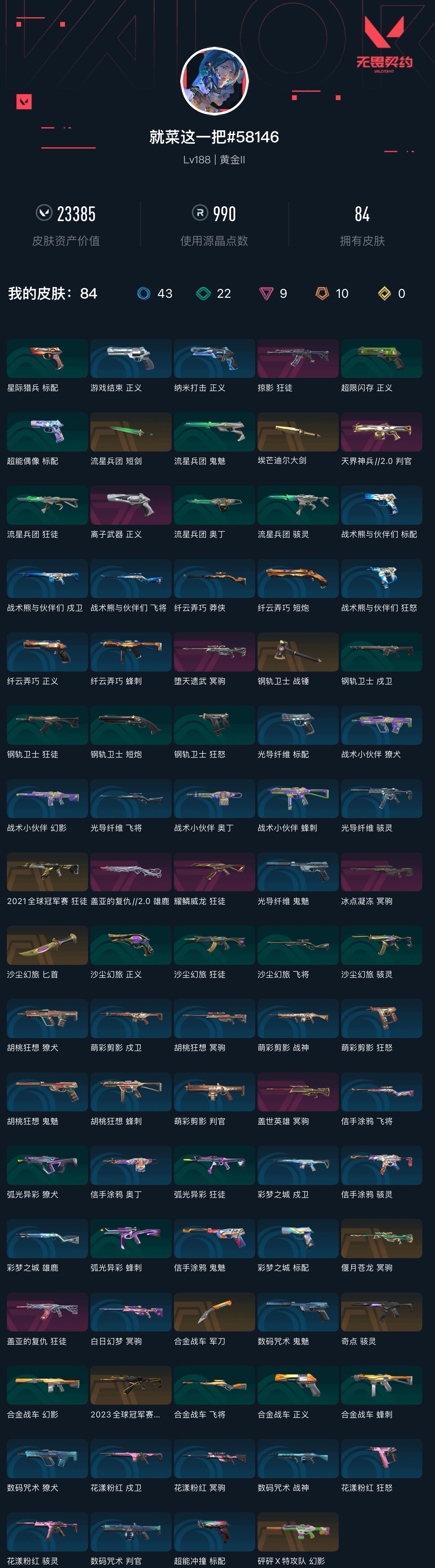 【无畏契约】【yhwww6670】等级:188,已用无畏点23385,已用源晶点990,橙皮:骇灵-奇点|幻影-砰砰x特攻队|近战-埃芒迪尔大剑|近战-钢轨卫士 战锤|近战-流星兵团 短剑|近战-沙尘幻旅 匕首|狂徒-2021全球冠军赛|狂徒-2023全球冠军赛|冥驹-偃月苍龙|近战-合金战车 军刀__紫皮:狂徒-盖亚的复仇|冥驹-堕天遗武|冥驹-冰点凝冻|判官-天界神兵2.0|狂徒-耀鳞威龙|冥驹-盖世英雄|正义-离子武器|雄鹿-盖亚的复仇2.0|狂徒-掠影__绿皮:短炮-钢轨卫士|狂怒-钢轨卫士|狂徒-钢轨卫士|戍卫-钢轨卫士|蜂刺-合金战车|正义-合金战车|幻影-合金战车|飞将-合金战车|标配-超能偶像|正义-超限闪存|獠犬-弧光异彩|蜂刺-弧光异彩|狂徒-弧光异彩|骇灵-流星兵团|鬼魅-流星兵团|狂徒-流星兵团|奥丁-流星兵团|正义-沙尘幻旅|狂徒-沙尘幻旅|飞将-沙尘幻旅|骇灵-沙尘幻旅|标配-星际猎兵__蓝皮:鬼魅-光导纤维|飞将-光导纤维|标配-光导纤维|骇灵-光导纤维|标配-超能冲撞|狂怒-花漾粉红|骇灵-花漾粉红|戍卫-花漾粉红|冥驹-花漾粉红|战神-数码咒术|獠犬-数码咒术|判官-数码咒术|鬼魅-数码咒术|正义-游戏结束|正义-纳米打击|冥驹-白日幻梦|戍卫-彩梦之城|雄鹿-彩梦之城|标配-彩梦之城|鬼魅-胡桃狂想|獠犬-胡桃狂想|蜂刺-胡桃狂想|冥驹-胡桃狂想|戍卫-萌彩剪影|战神-萌彩剪影|狂怒-萌彩剪影|判官-萌彩剪影|莽侠-纤云弄巧|正义-纤云弄巧|短炮-纤云弄巧|蜂刺-纤云弄巧|鬼魅-信手涂鸦|骇灵-信手涂鸦|奥丁-信手涂鸦|飞将-信手涂鸦|蜂刺-战术小伙伴|幻影-战术小伙伴|獠犬-战术小伙伴|奥丁-战术小伙伴|飞将-战术熊与伙伴们|狂怒-战术熊与伙伴们|戍卫-战术熊与伙伴们|标配-战术熊与伙伴们__段位:黄金__英雄:尚勃勒|维斯|黑梦|斯凯|暮蝶|盖可|霓虹|壹决|星礈|k/o|幽影|夜露|钢锁|海神|奇乐|炼狱|铁臂|贤者|猎枭|钛狐|芮娜|零|捷风|蝰蛇|不死鸟|幻棱|雷兹|禁灭