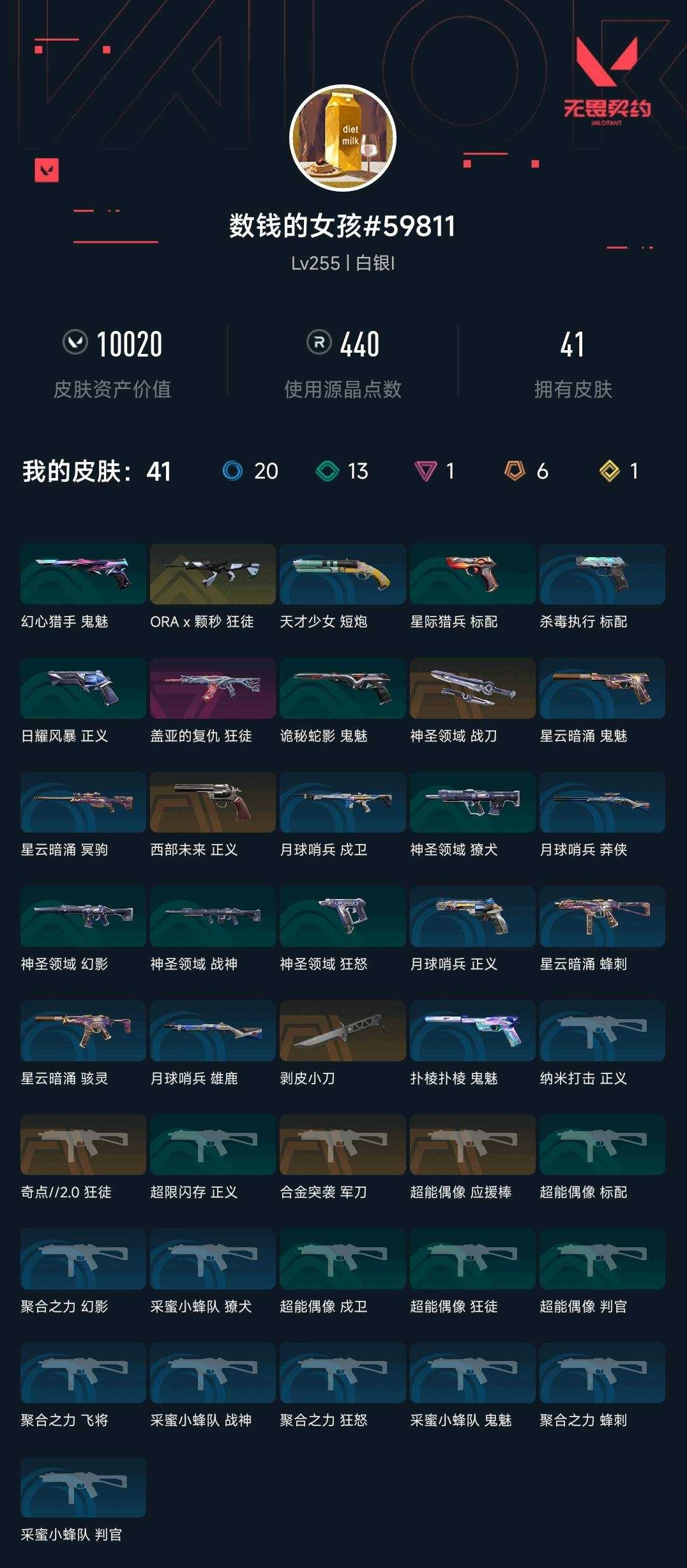 【无畏契约】【yhwww6699】等级:255,已用无畏点10020,已用源晶点440,橙皮:近战-剥皮小刀|近战-超能偶像 应援棒|近战-合金突袭 军刀|狂徒-奇点2.0|近战-神圣领域 战刀|正义-西部未来__紫皮:狂徒-盖亚的复仇__段位:白银__蓝皮:标配-杀毒执行|短炮-天才少女|正义-纳米打击|鬼魅-星云暗涌|骇灵-星云暗涌|正义-月球哨兵|莽侠-月球哨兵|戍卫-月球哨兵|雄鹿-月球哨兵|鬼魅-采蜜小蜂队|战神-采蜜小蜂队|獠犬-采蜜小蜂队|判官-采蜜小蜂队|蜂刺-聚合之力|幻影-聚合之力|狂怒-聚合之力|飞将-聚合之力|鬼魅-扑棱扑棱|冥驹-星云暗涌|蜂刺-星云暗涌__绿皮:獠犬-神圣领域|狂怒-神圣领域|战神-神圣领域|幻影-神圣领域|戍卫-超能偶像|标配-超能偶像|狂徒-超能偶像|判官-超能偶像|正义-超限闪存|鬼魅-诡秘蛇影|正义-日耀风暴|标配-星际猎兵|鬼魅-幻心猎手__英雄:尚勃勒|维斯|黑梦|斯凯|暮蝶|盖可|霓虹|壹决|星礈|k/o|幽影|夜露|钢锁|海神|奇乐|炼狱|铁臂|贤者|猎枭|钛狐|芮娜|零|捷风|蝰蛇|不死鸟|幻棱|雷兹|禁灭__金皮:狂徒-a x 颗秒