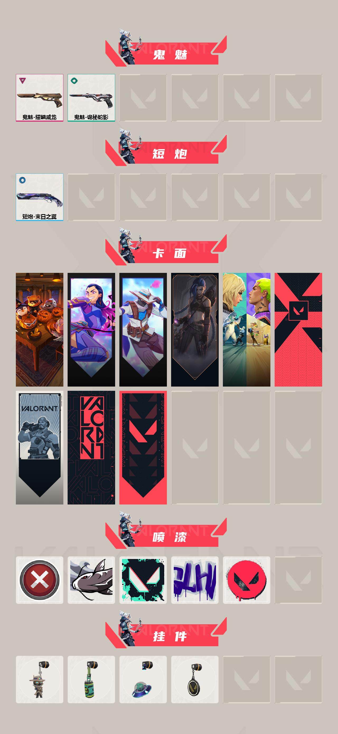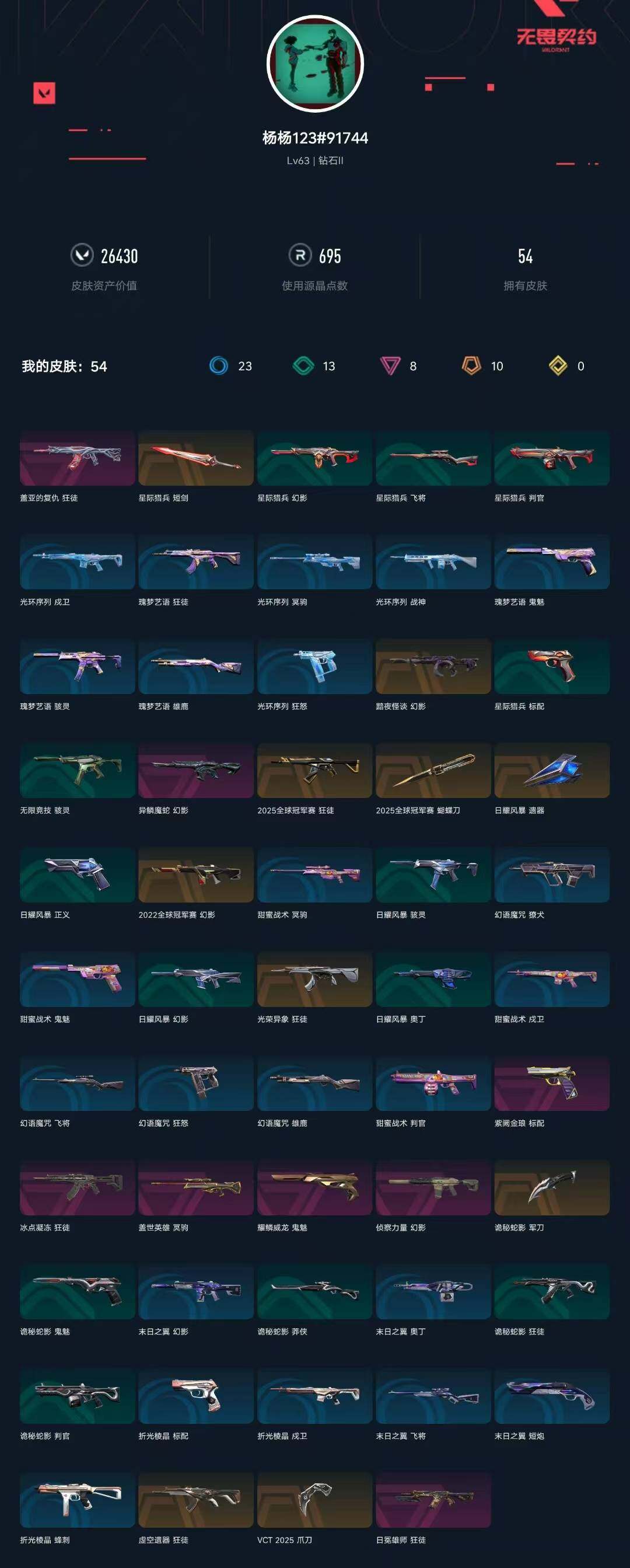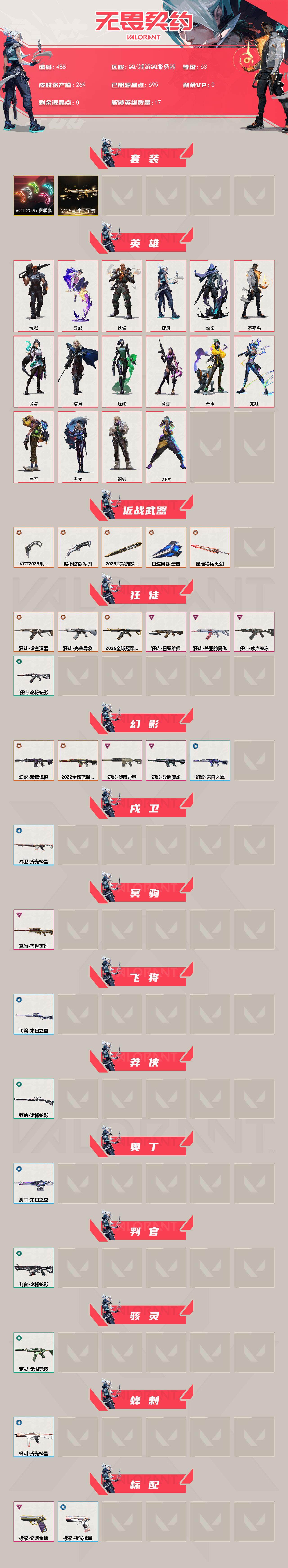 [14278588]【套装】:2025全球冠军赛套装,vct 2025 赛季套装 【英雄】:幻棱,炼狱,暮蝶,铁臂,捷风,幽影,不死鸟,贤者,猎枭,蝰蛇,芮娜,奇乐,霓虹,盖可,黑梦,钢锁 【近战 武器】:近战武器-2025全球冠军赛 蝴蝶刀,近战武器-vct 2025 爪刀,近战武器-诡秘蛇影 军刀,近战武器-日耀风暴 遗器,近战武器-星际猎兵 短剑 【狂徒】:狂徒-2025全球冠军赛,狂徒-虚空遗器,狂徒-光荣异象,狂徒-冰点凝冻,狂徒-盖亚的复仇,狂徒-日冕雄师,狂徒-诡秘蛇影 【幻影】:幻影-2022全球冠军赛,幻影-黯夜怪谈,幻影-侦察力量,幻影-异鳞魔蛇,幻影-末日之翼 【戍卫】:戍卫-折光棱晶 【冥驹】:冥驹-盖世英雄 【飞将】:飞将-末日之翼 【莽侠】:莽侠-诡秘蛇影 【奥丁】:奥丁-末日之翼 【判官】:判官-诡秘蛇影 【骇灵】:骇灵-无限竞技 【蜂刺】:蜂刺-折光棱晶 【标配】:标配-紫阙金琅,标配-折光棱晶 【鬼魅】:鬼魅-耀鳞威龙,鬼魅-诡秘蛇影 【短炮】:短炮-末日之翼 【卡面】:南瓜盛典 卡面,无畏契约go!第一卷:芮娜 卡面,无畏契约go!第一卷:零 卡面,《双城之战》金克丝 卡面,钢锁vs盖可 卡面,代号红色 卡面,新兵报到 卡面,v契约 卡面,无畏契约 卡面 【喷漆】:买装还是存钱 喷漆,松叶 喷漆,胜利属于无畏契约 喷漆,glhf 喷漆,无畏契约 喷漆 【挂饰】:无畏契约go!第一卷 零 挂饰,z世代特饮 挂饰,天外飞客 挂饰,无畏契约 纪念币 挂饰