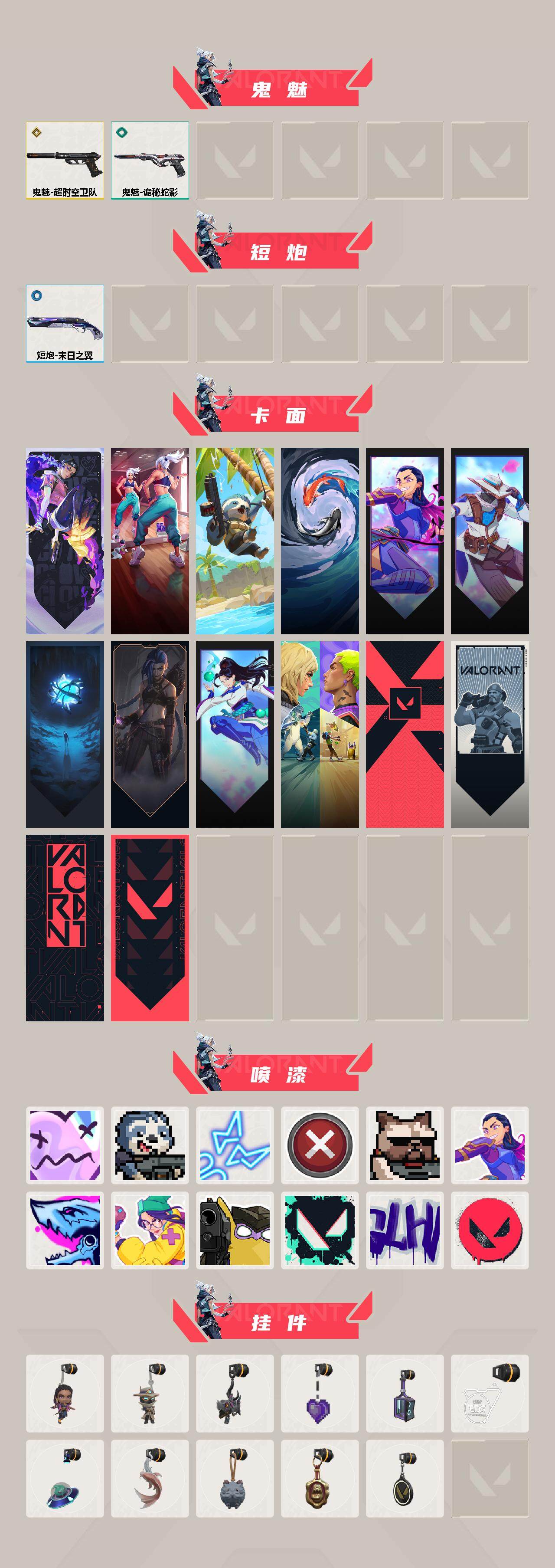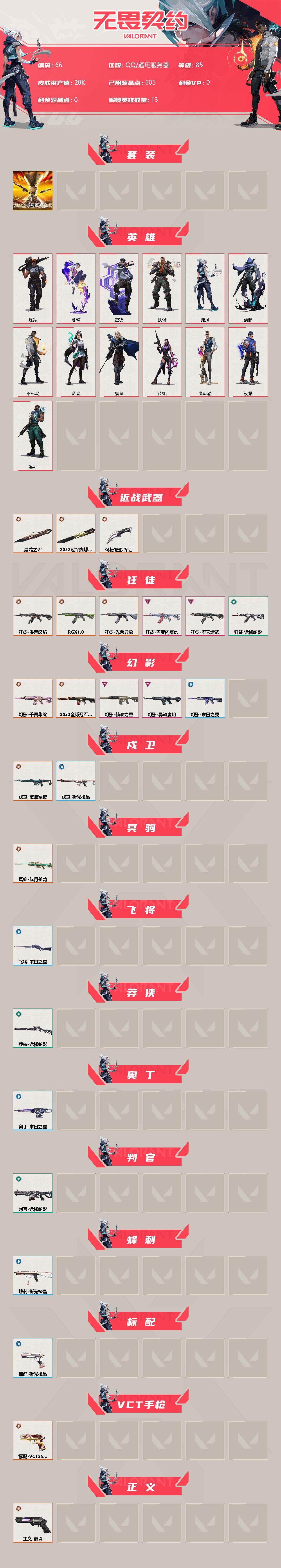 【66】【套装】:2022全球冠军赛套装 【英雄】:炼狱,暮蝶,壹决,铁臂,捷风,幽影,不死鸟,贤者,猎枭,芮娜,尚勃勒,夜露,海神 【近战 武器】:近战武器-2022全球冠军赛 蝴蝶刀,近战武器-威龙之刃,近战武器-诡秘蛇影 军刀 【狂徒】:狂徒-洪荒怒焰,狂徒-rgx 11z pro,狂徒-光荣异象,狂徒-堕天遗武,狂徒-盖亚的复仇,狂徒-诡秘蛇影 【幻影】:幻影-2022全球冠军赛,幻影-千灵华绽,幻影-侦察力量,幻影-异鳞魔蛇,幻影-末日之翼 【戍卫】:戍卫-破败军械,戍卫-折光棱晶 【冥驹】:冥驹-偃月苍龙 【飞将】:飞将-末日之翼 【莽侠】:莽侠-诡秘蛇影 【奥丁】:奥丁-末日之翼 【判官】:判官-诡秘蛇影 【蜂刺】:蜂刺-折光棱晶 【标配】:标配-折光棱晶 【vct手呛】:标配-vct25 x edg 【正义】:正义-奇点 【鬼魅】:鬼魅-超时空卫队,鬼魅-诡秘蛇影 【短炮】:短炮-末日之翼 【卡面】:无畏契约:暮蝶 卡面,热舞环节 卡面,树懒大作战 卡面,红鳞松叶 卡面,无畏契约go!第一卷:芮娜 卡面,无畏契约go!第一卷:零 卡面,无垠星环 卡面,《双城之战》金克丝 卡面,无畏契约go!第一卷:贤者 卡面,钢锁vs盖可 卡面,代号红色 卡面,新兵报到 卡面,v契约 卡面,无畏契约 卡面 【喷漆】:伤心心 喷漆,审判之爪 喷漆,霓光四射 喷漆,买装还是存钱 喷漆,关门放狗 喷漆,无畏契约go!第一卷:芮娜 喷漆,暴走萝莉 喷漆,无畏契约go!第一卷:奇乐 喷漆,放下武器 喷漆,胜利属于无畏契约 喷漆,glhf 喷漆,无畏契约 喷漆 【挂饰】:无畏契约go!第一卷 芮娜 挂饰,无畏契约go!第一卷 零 挂饰,鱼骨头 挂饰,薰衣草之心 挂饰,动力机箱 挂饰,vct x edg 挂饰,天外飞客 挂饰,红鳞松叶 挂饰,《双城之战》魄罗 挂饰,海豹的认可 挂饰,无畏契约 纪念币 挂饰