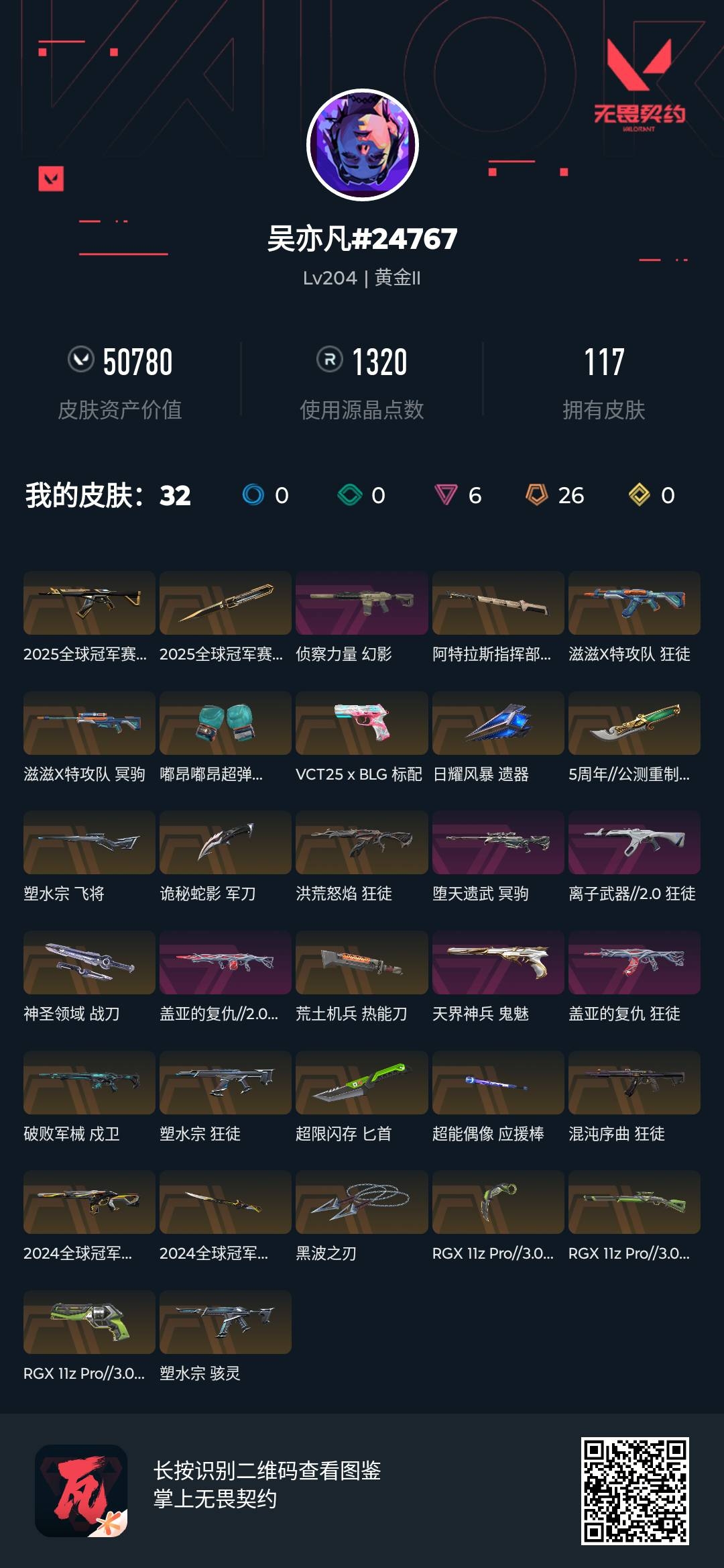 【24冠军套 25冠军套】游戏等级204-段位:黄金-皮肤价值50780-已用源晶点数1320-英雄28-武器皮肤117 2025全球冠军赛-狂徒 2025全球冠军赛-蝴蝶刀 侦察力量-幻影 阿特斯拉指挥部-甩棍 滋滋x特攻队-狂徒 滋滋x特攻队-冥驹 嘟昂嘟昂超弹力水球拳套 vct25-x-blg-标配 日耀风暴-遗器 5周年//公测重置版-苍龙之刃 塑水宗-飞将 诡秘蛇影-