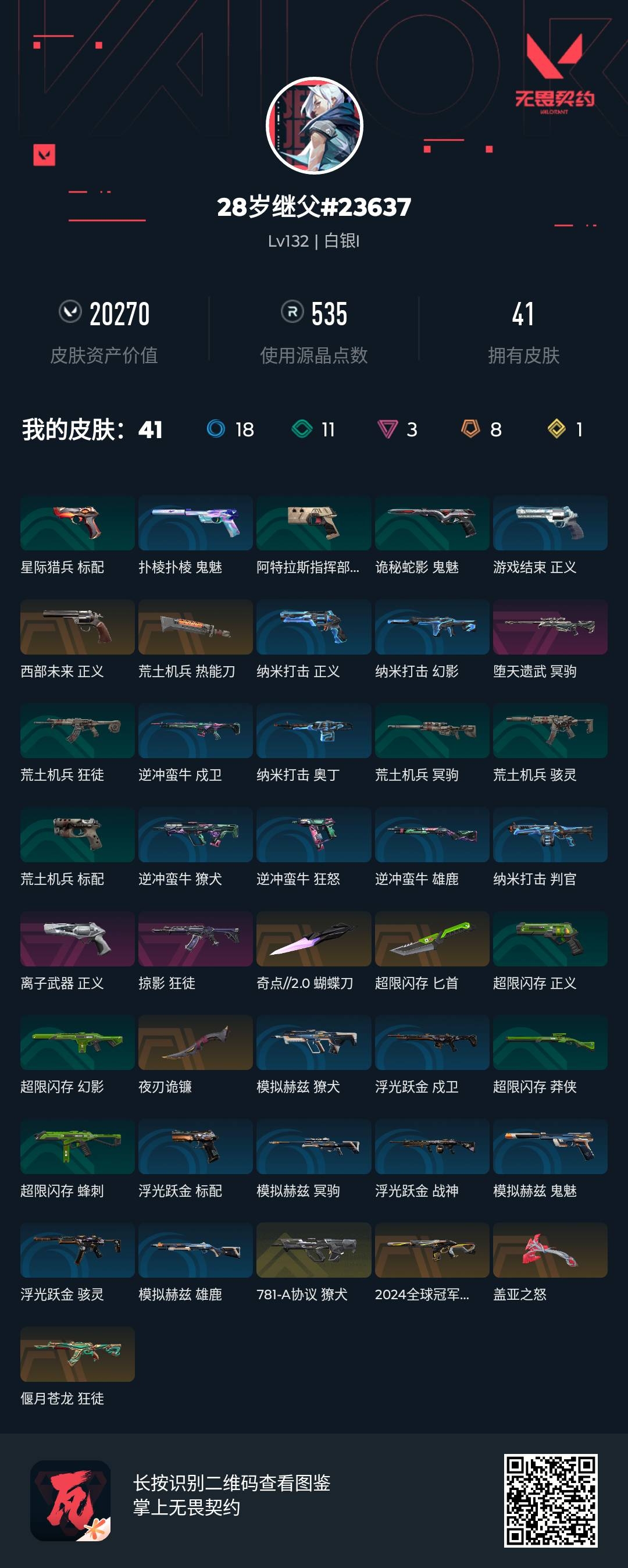 游戏等级132-段位:白银-皮肤价值20270-已用源晶点数535-英雄24-武器皮肤41 西部未来-正义 荒土机兵-热能刀 堕天遗武-冥驹 奇点//2.0蝴蝶刀 超限闪存-匕首 离子武器-正义 掠影-狂徒 夜刃诡镰 781-a协议-獠犬 盖亚之怒 偃月苍龙-狂徒 2024全球冠军赛-幻影