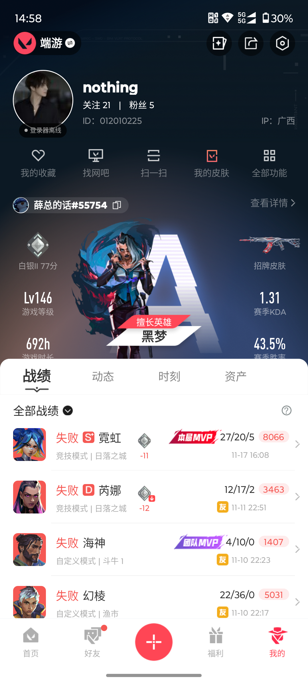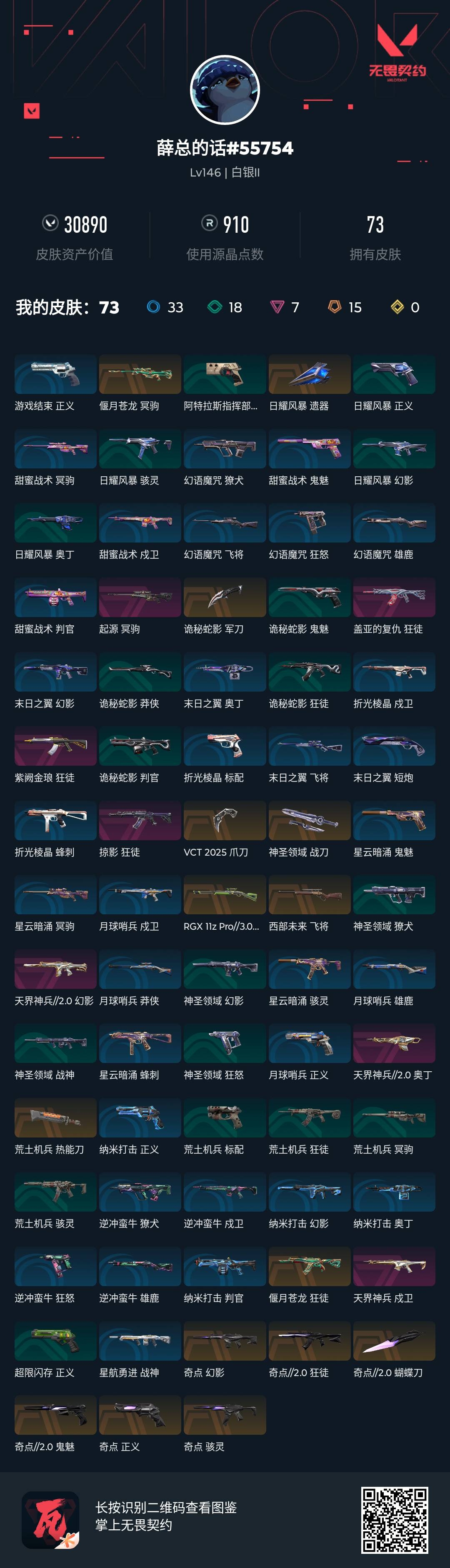 游戏等级146-段位:白银-皮肤价值30890-已用源晶点数910-英雄27-武器皮肤97 偃月苍龙-冥驹 日耀风暴-遗器 起源-冥驹 诡秘蛇影-军刀 盖亚的复仇-狂徒 紫阙金琅-狂徒 掠影-狂徒 vct-2025-爪刀 神圣领域-战刀 rgx-11z-pro//3.0莽侠 西部未来-飞将 天界神兵//2.0奥丁 荒土机兵-热能刀 偃月苍龙-狂徒 天界神兵-戍卫 奇点-幻影 奇