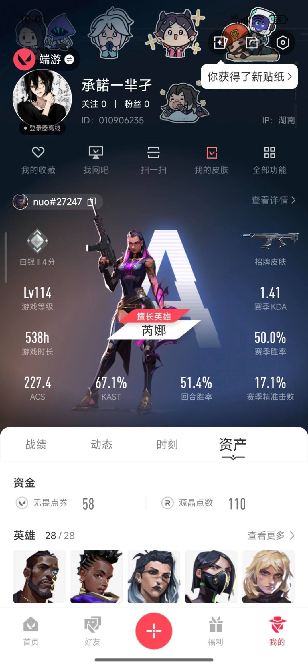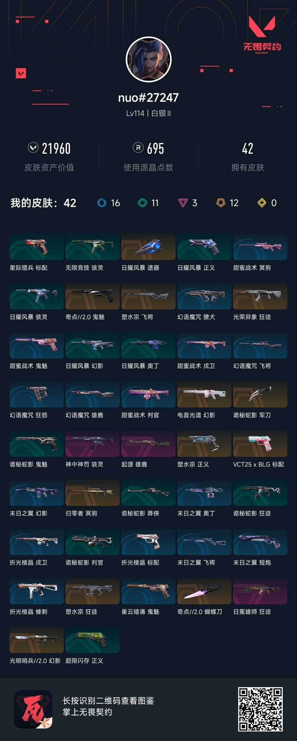 [14282615]12橙皮 3紫皮 42皮肤 28英雄 75卡面 695已用源晶 白银段位 【近战武器皮肤】:蝴蝶刀-奇点//2.0诡秘蛇影 【佩呛皮肤】:标配-vct25xblg鬼魅-奇点//2.0正义-塑水宗 【冲锋呛皮肤】:骇灵-神中神罚 【霰弹呛皮肤】:雄鹿-起源 【步呛皮肤】:狂