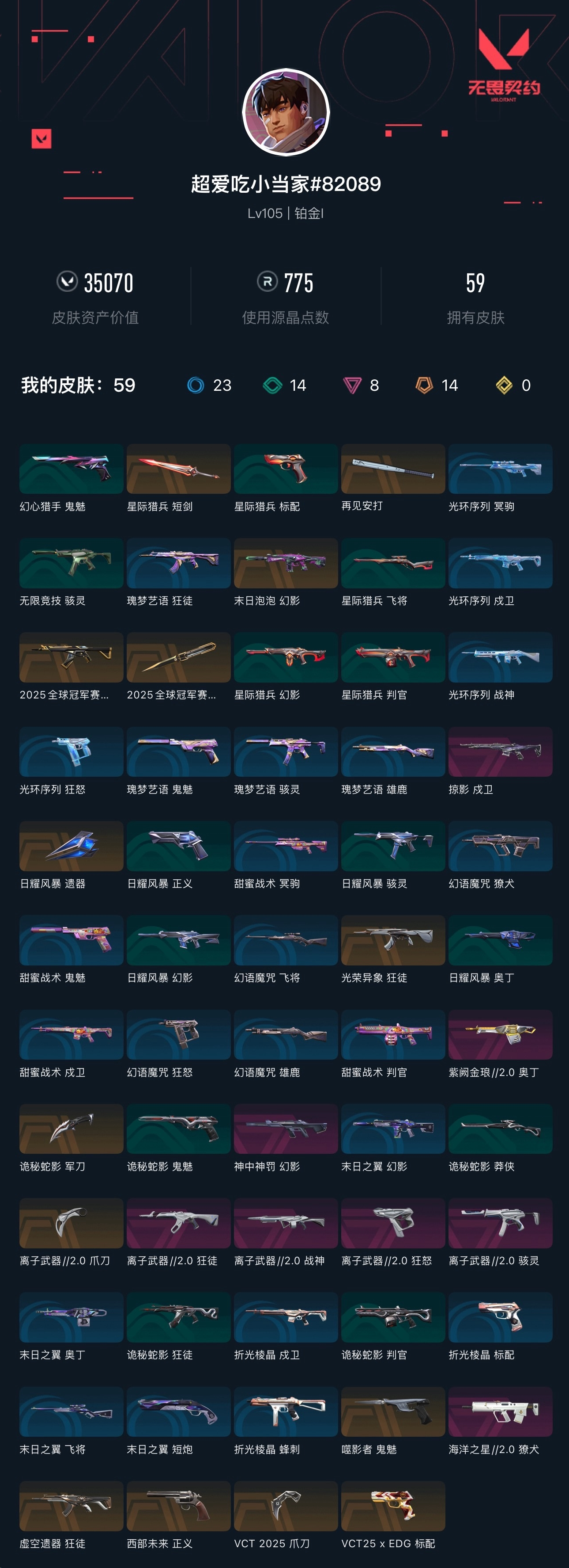 【无畏契约】【yhwww6707】等级:105,已用无畏点35070,已用源晶点775,橙皮:近战-再见安打|标配-vct25 x edg|正义-西部未来|近战-vct 2025 爪刀|狂徒-虚空遗器|近战-诡秘蛇影 军刀|鬼魅-噬影者|近战-离子武器2.0 爪刀|狂徒-光荣异象|近战-日耀风暴 遗器|近战-星际猎兵 短剑|幻影-末日泡泡|狂徒-2025全球冠军赛|近战-2025全球冠军赛 蝴蝶刀__紫皮:奥丁-紫阙金琅2.0|戍卫-掠影|獠犬-海洋之星2.0|战神-离子武器2.0|狂徒-离子武器2.0|狂怒-离子武器2.0|骇灵-离子武器2.0|幻影-神中神罚__段位:铂金__绿皮:骇灵-无限竞技|判官-诡秘蛇影|鬼魅-诡秘蛇影|莽侠-诡秘蛇影|狂徒-诡秘蛇影|正义-日耀风暴|幻影-日耀风暴|奥丁-日耀风暴|判官-星际猎兵|飞将-星际猎兵|标配-星际猎兵|鬼魅-幻心猎手__蓝皮:蜂刺-折光棱晶|戍卫-折光棱晶|标配-折光棱晶|飞将-末日之翼|幻影-末日之翼|短炮-末日之翼|奥丁-末日之翼|鬼魅-甜蜜战术|判官-甜蜜战术|戍卫-甜蜜战术|雄鹿-幻语魔咒|獠犬-幻语魔咒|飞将-幻语魔咒|狂怒-幻语魔咒|狂怒-光环序列|戍卫-光环序列|冥驹-光环序列|战神-光环序列|狂徒-瑰梦艺语|鬼魅-瑰梦艺语|骇灵-瑰梦艺语|雄鹿-瑰梦艺语__英雄:尚勃勒|维斯|黑梦|斯凯|暮蝶|盖可|霓虹|壹决|星礈|k/o|幽影|夜露|钢锁|海神|奇乐|炼狱|铁臂|贤者|猎枭|钛狐|芮娜|零|捷风|蝰蛇|不死鸟|幻棱|雷兹|禁灭