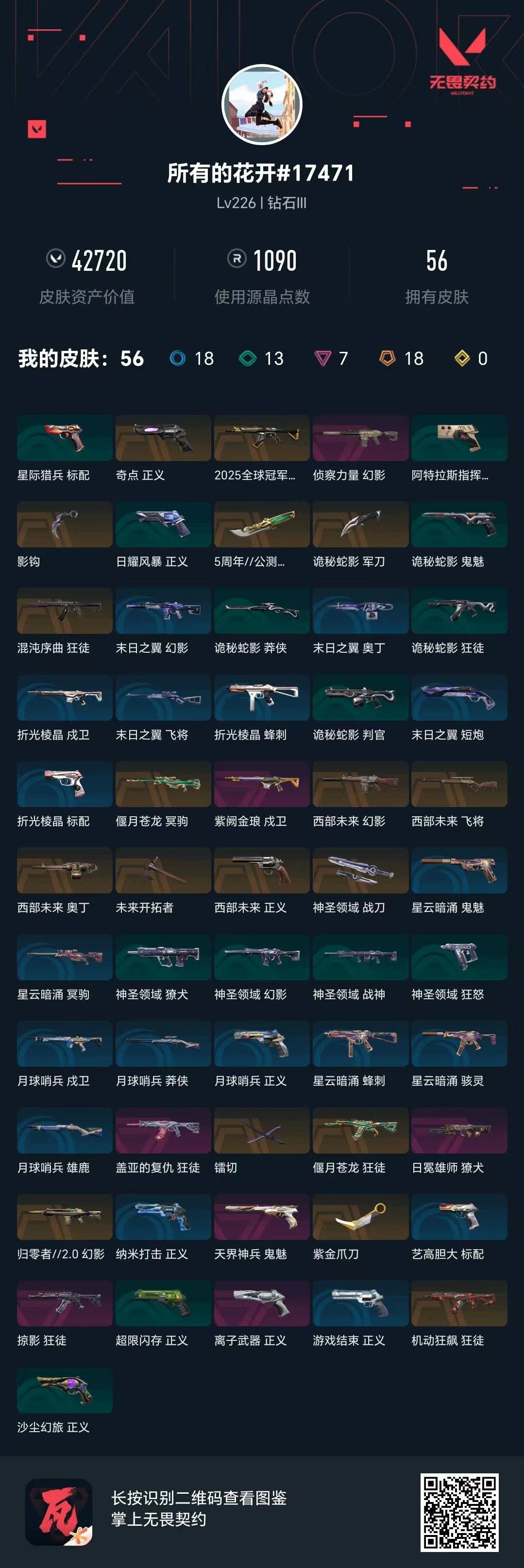 [14285289]18橙皮 7紫皮 56皮肤 27英雄 136卡面 1090已用源晶 钻石段位 【套装】:西部未来 【近战武器皮肤】:苍龙之刃神圣领域 战刀未来开拓者镭切诡秘蛇影影钩紫金爪刀 【佩呛皮肤】:正义-西部未来正义-奇点正义-离子武器鬼魅-天界神兵 【步呛皮肤】:幻影